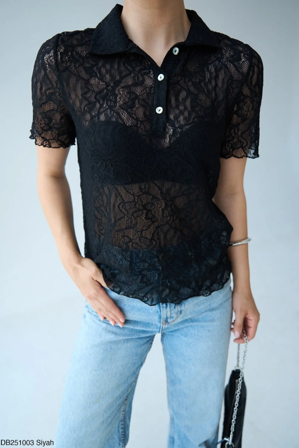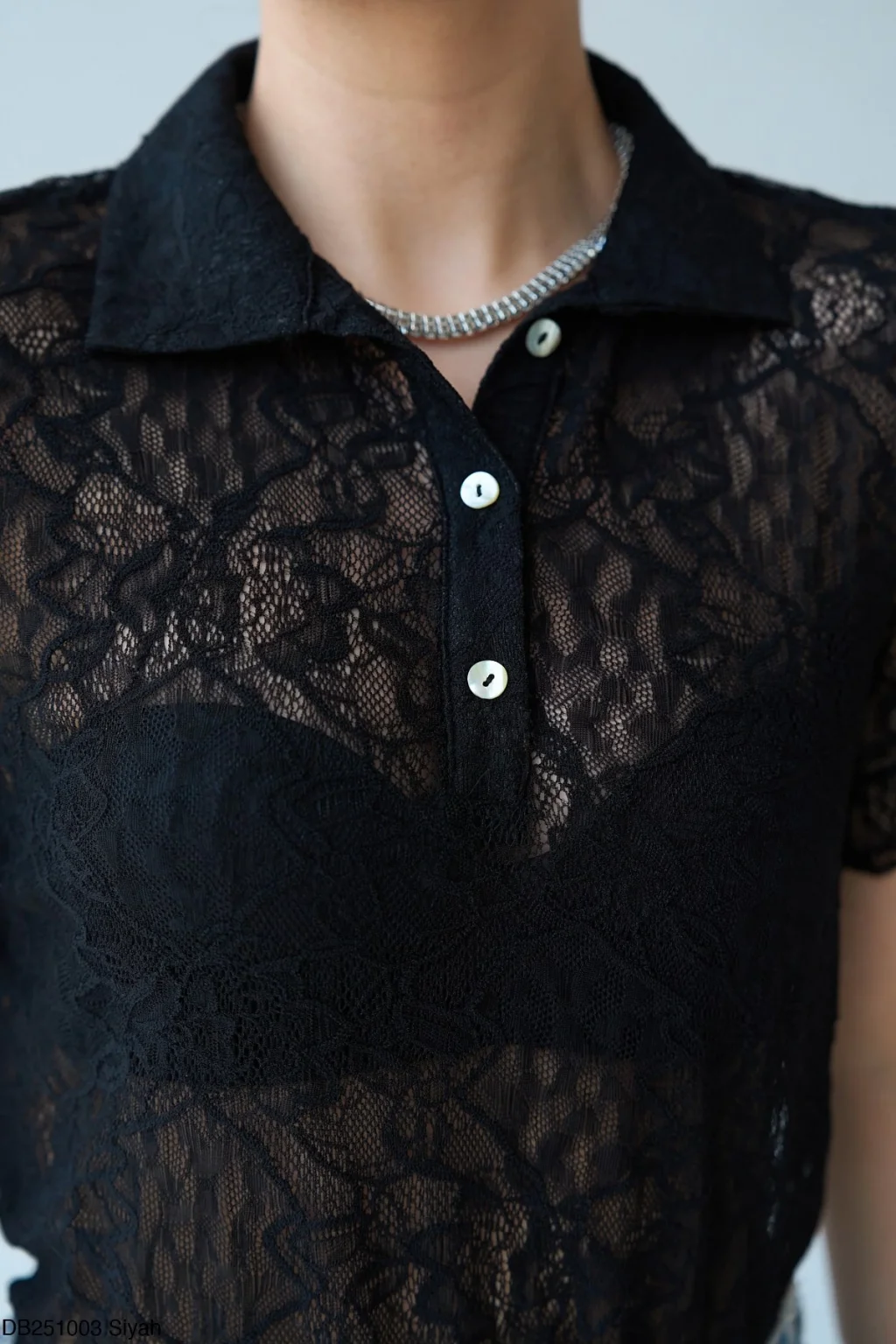 Polo Yaka Patlı Siyah Dantel Bluz
