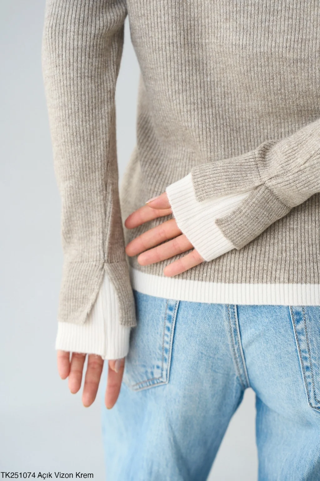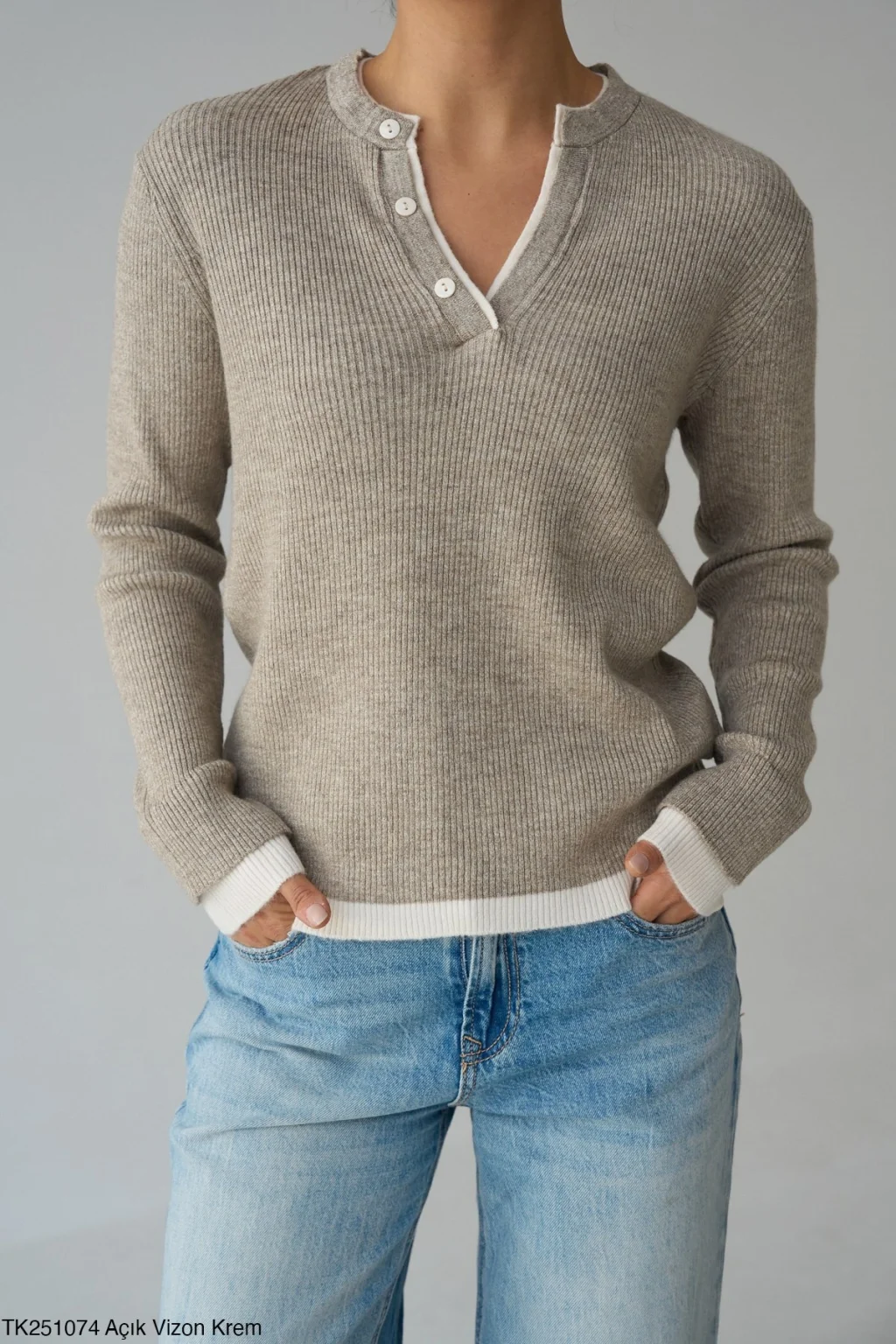 Standart beden, patlı iki renk vizon-ekru,yakası düğmeli,rahat kalıp kazak.