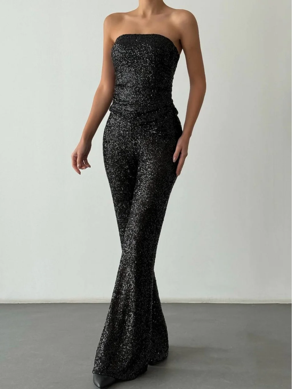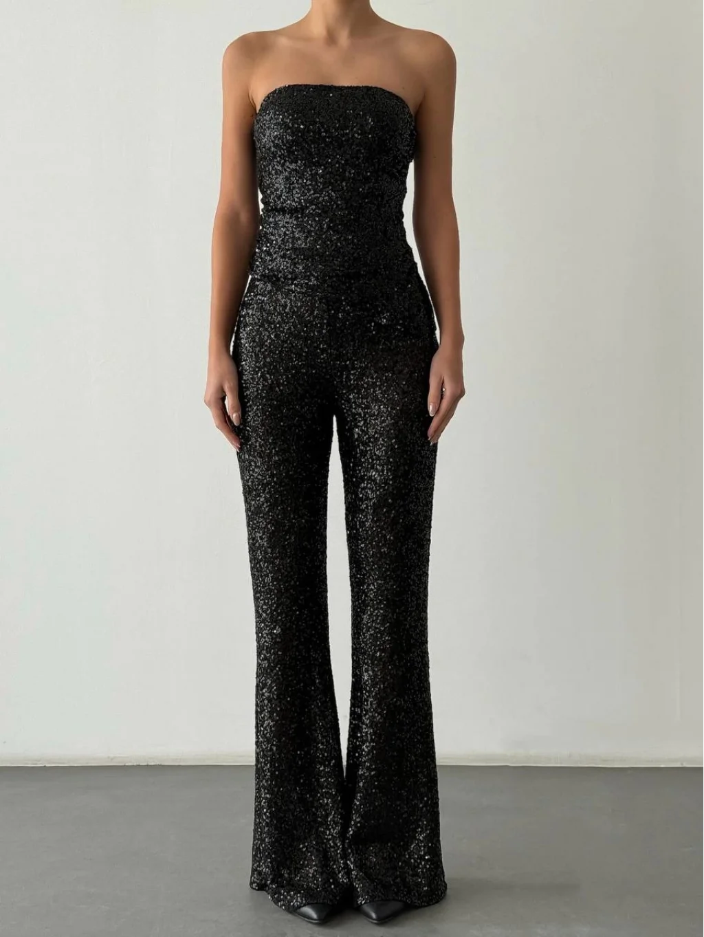Payetli Straplez Bluz Pantolon Takım-Siyah