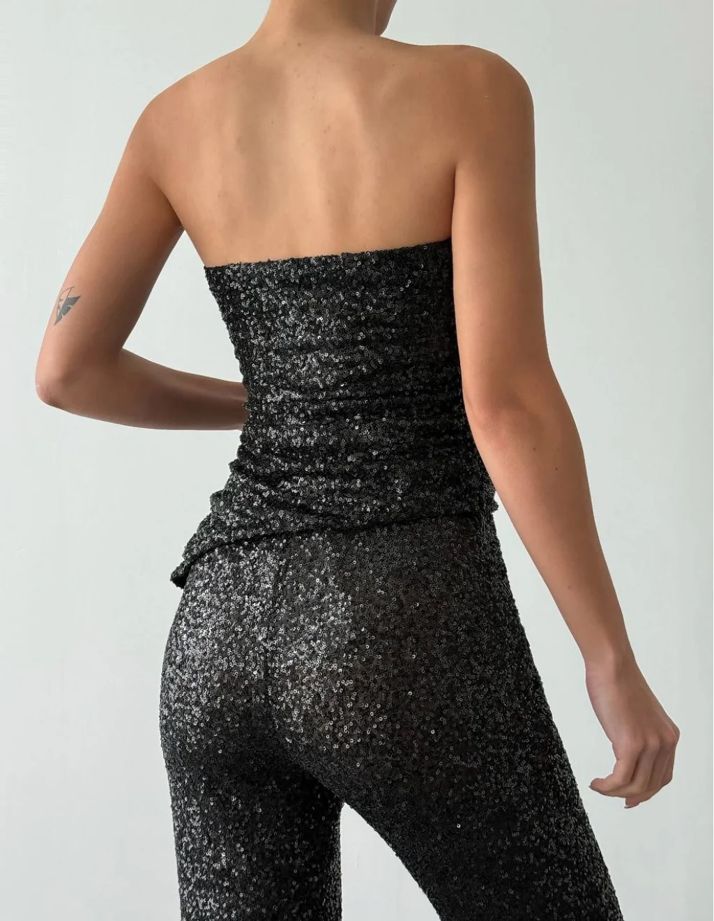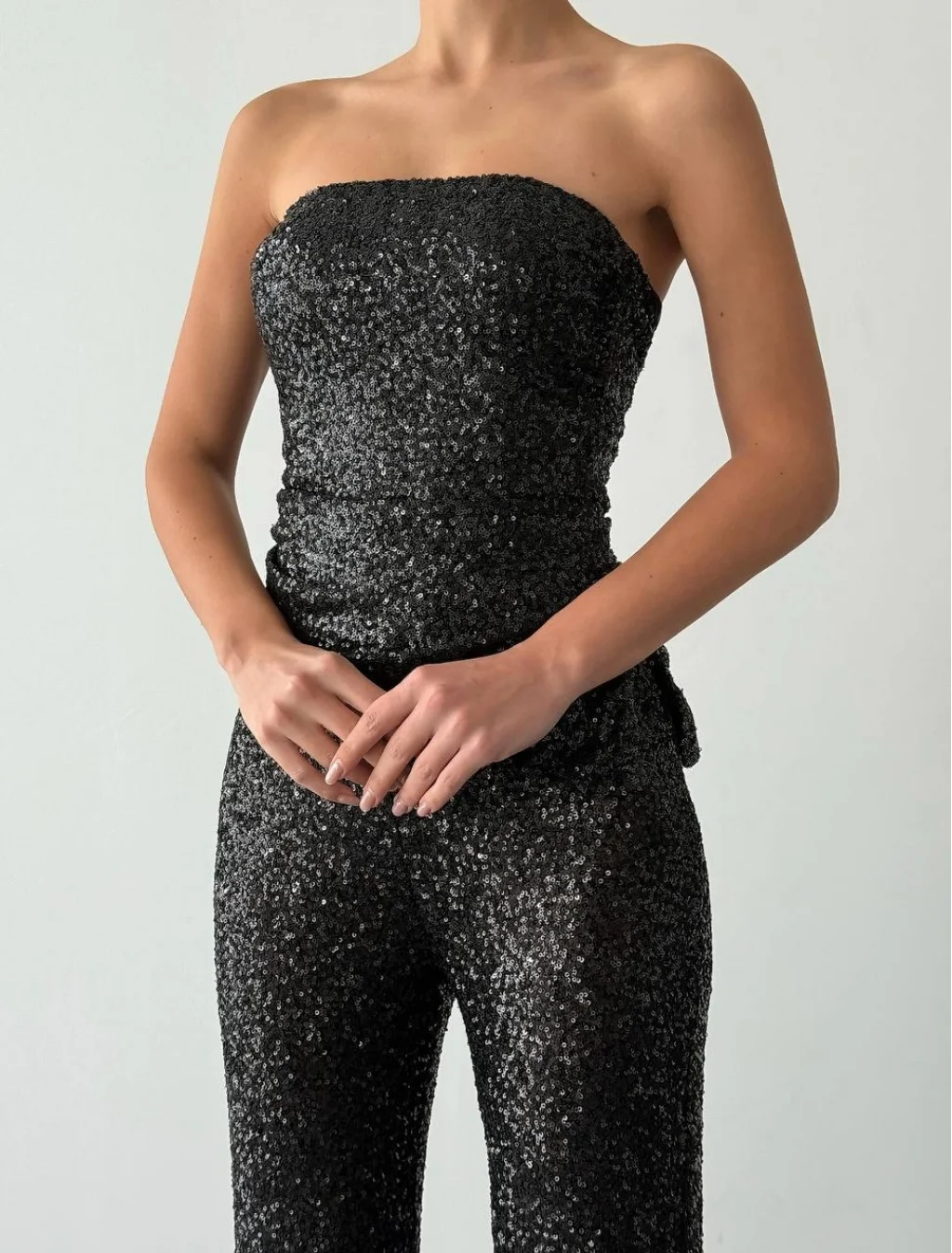 İp askılı, yan fermuar kapamalı, iç astarlı straplez payetli bluz, yüksek bel, beli lastikli, yan fermuar kapamalı, ispanyol paça payetli pantolon.
