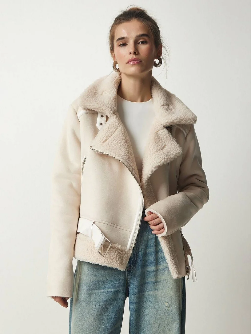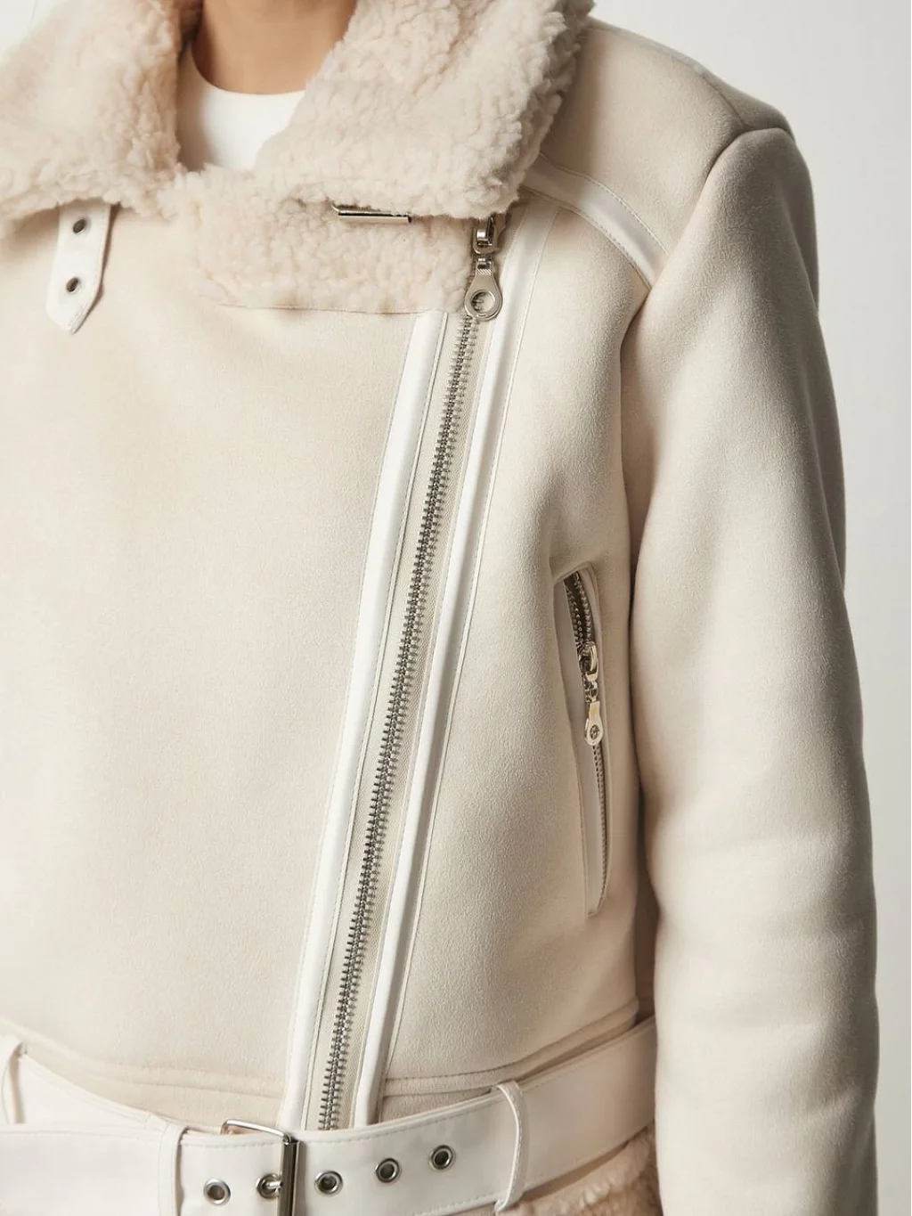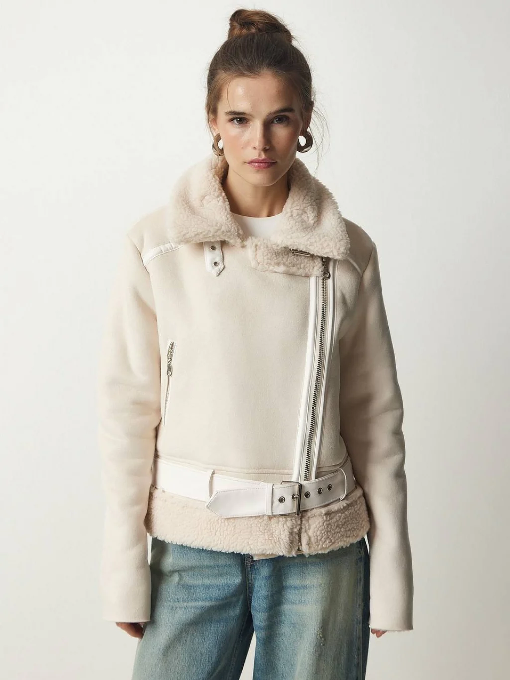 PELUŞ YAKA KEMERLİ EKRU NUBUK BİKER CEKET