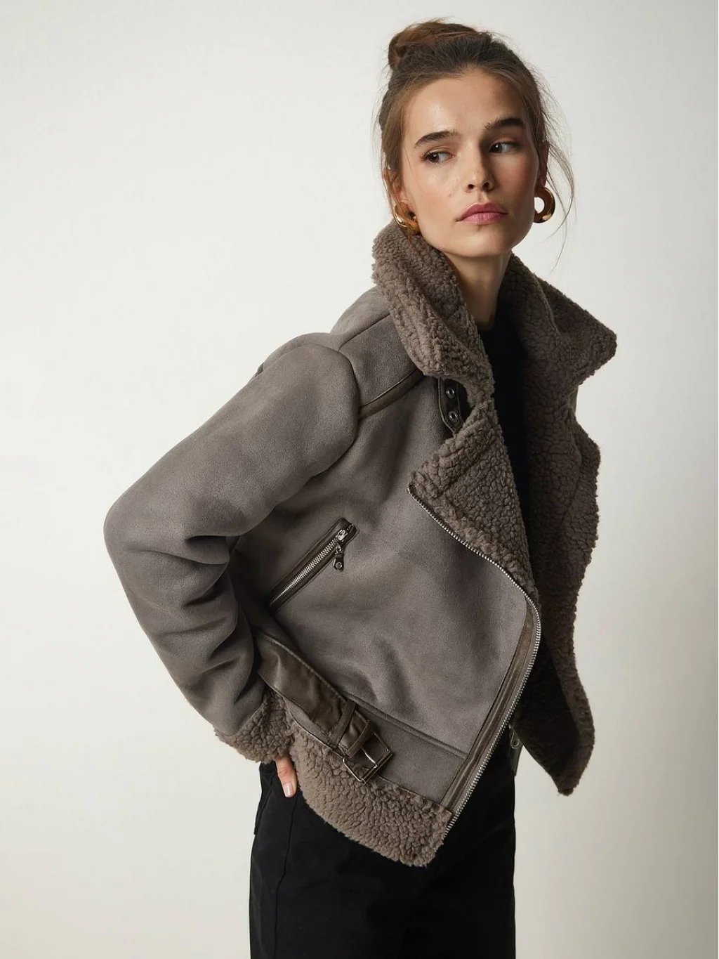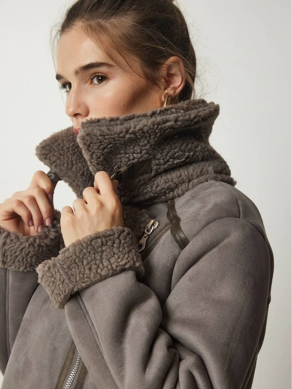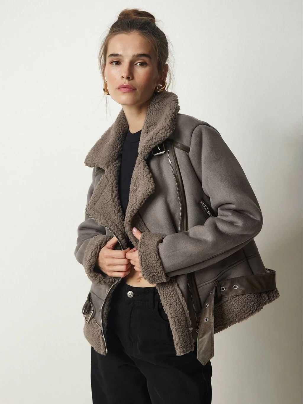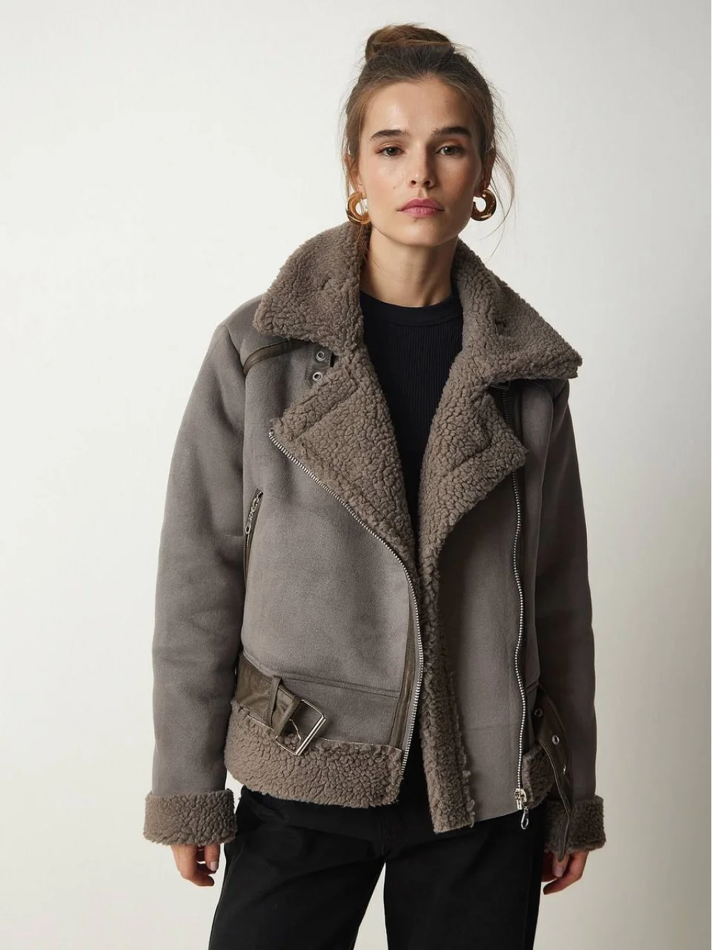 PELUŞ YAKA KEMERLİ GRİ NUBUK BİKER CEKET
