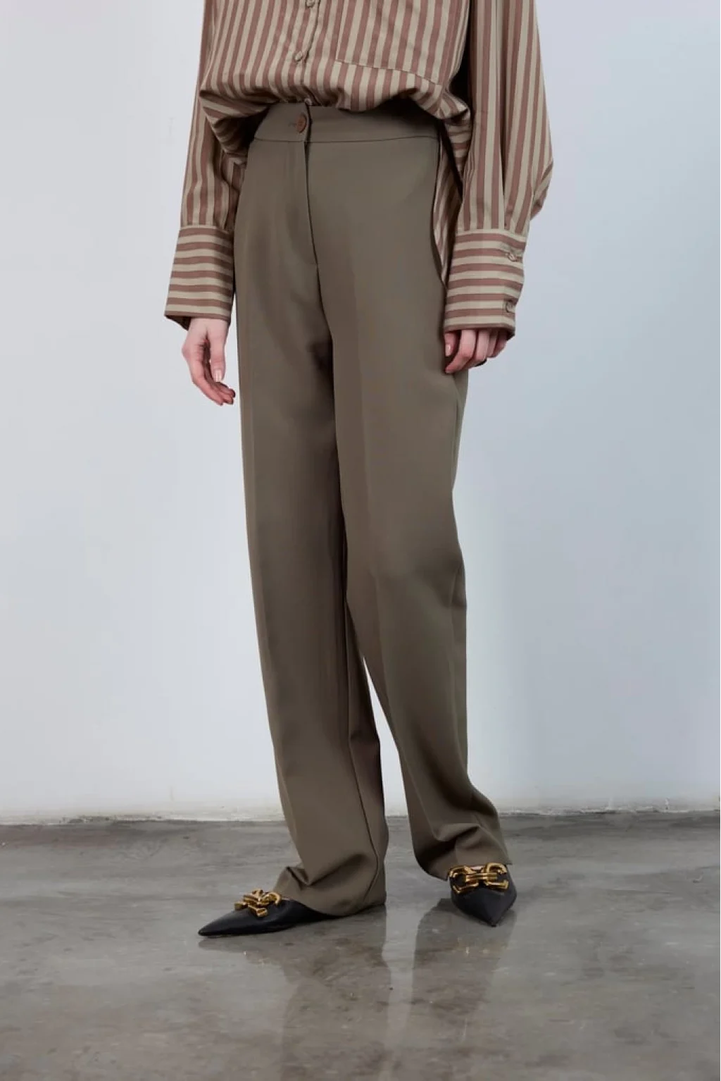 Pilesiz Palazzo Paça Haki Kumaş Pantolon