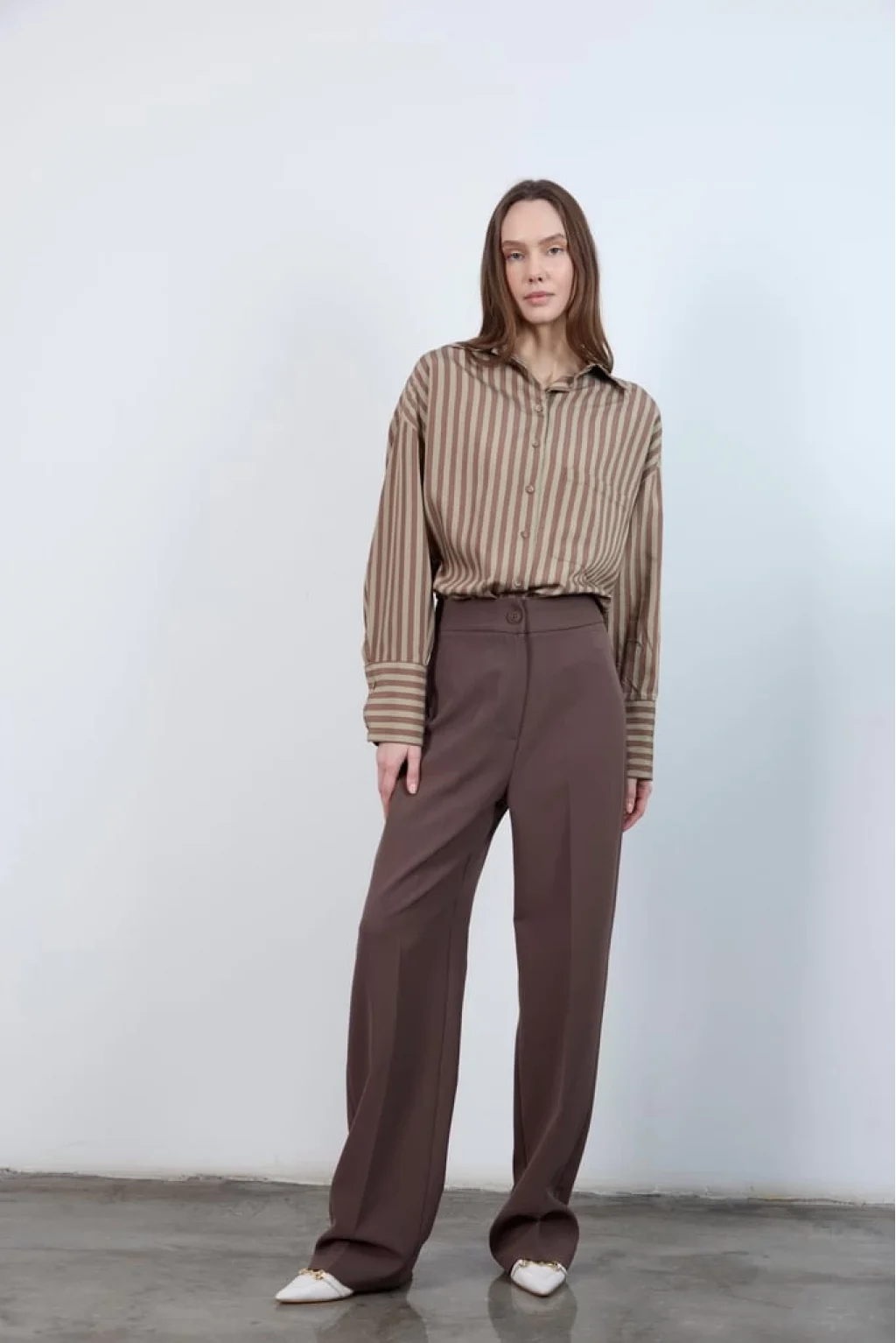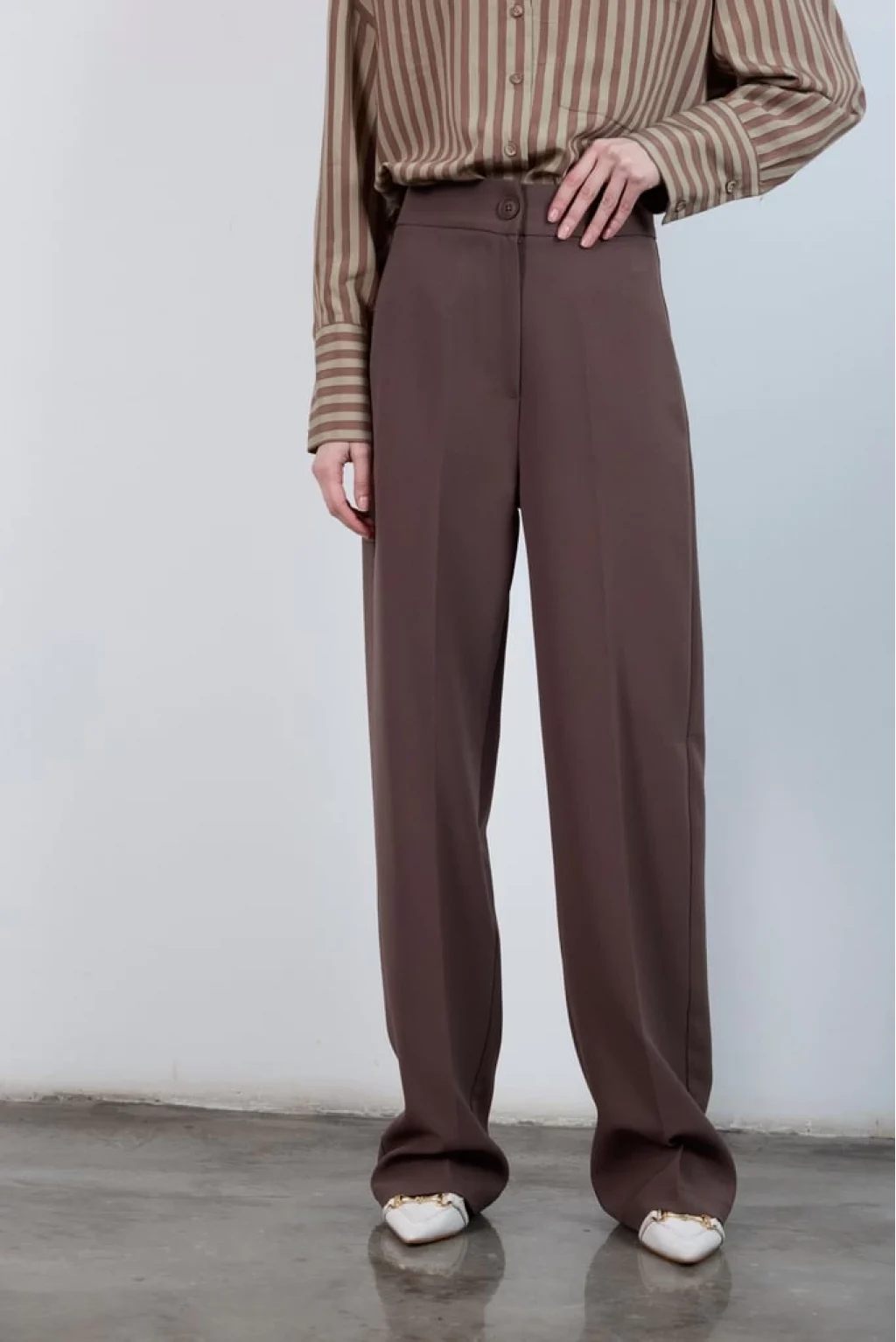 MYRA Pilesiz Palazzo Paça Kahverengi Kumaş Pantolon, konfor ve şıklığı bir arada sunar.