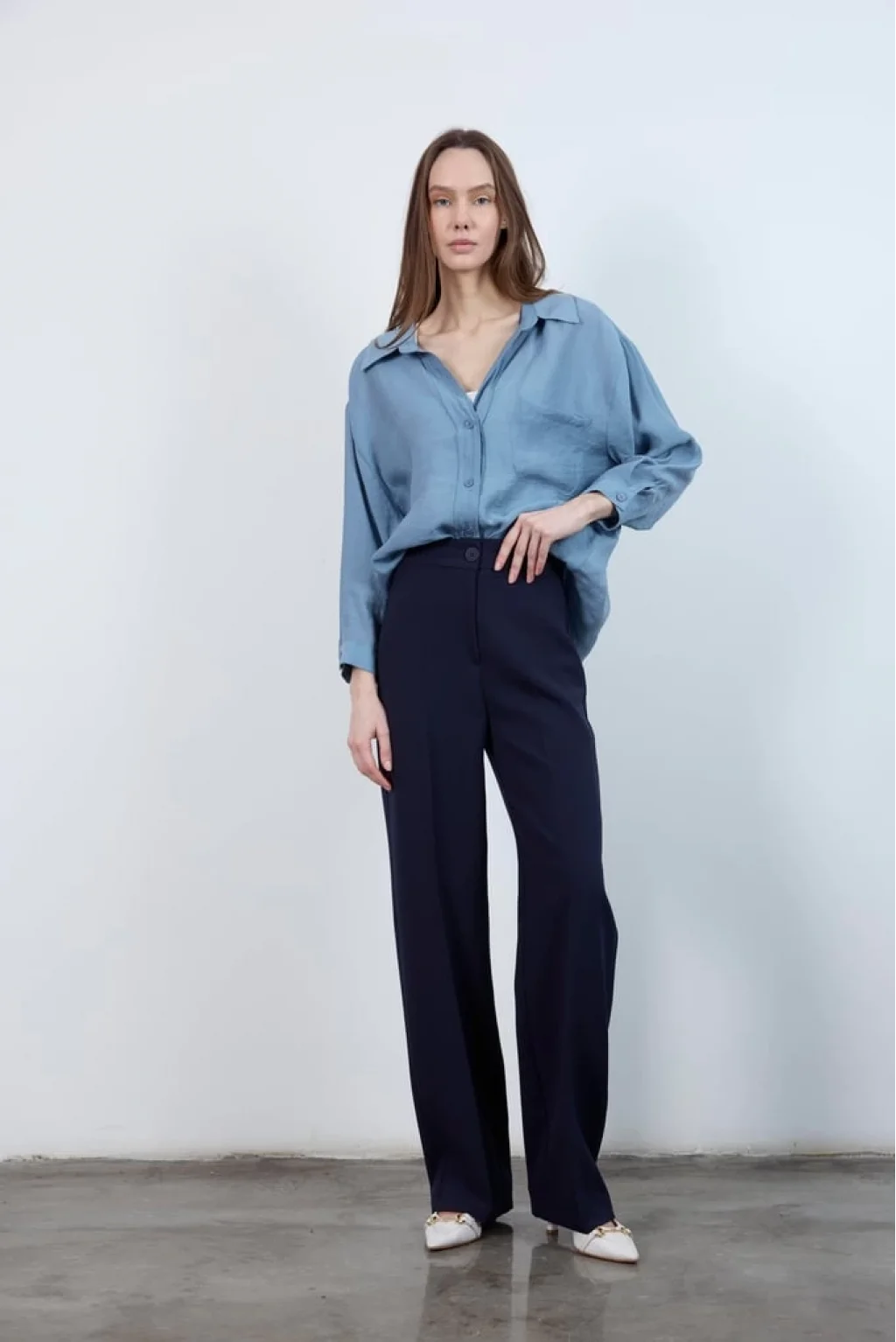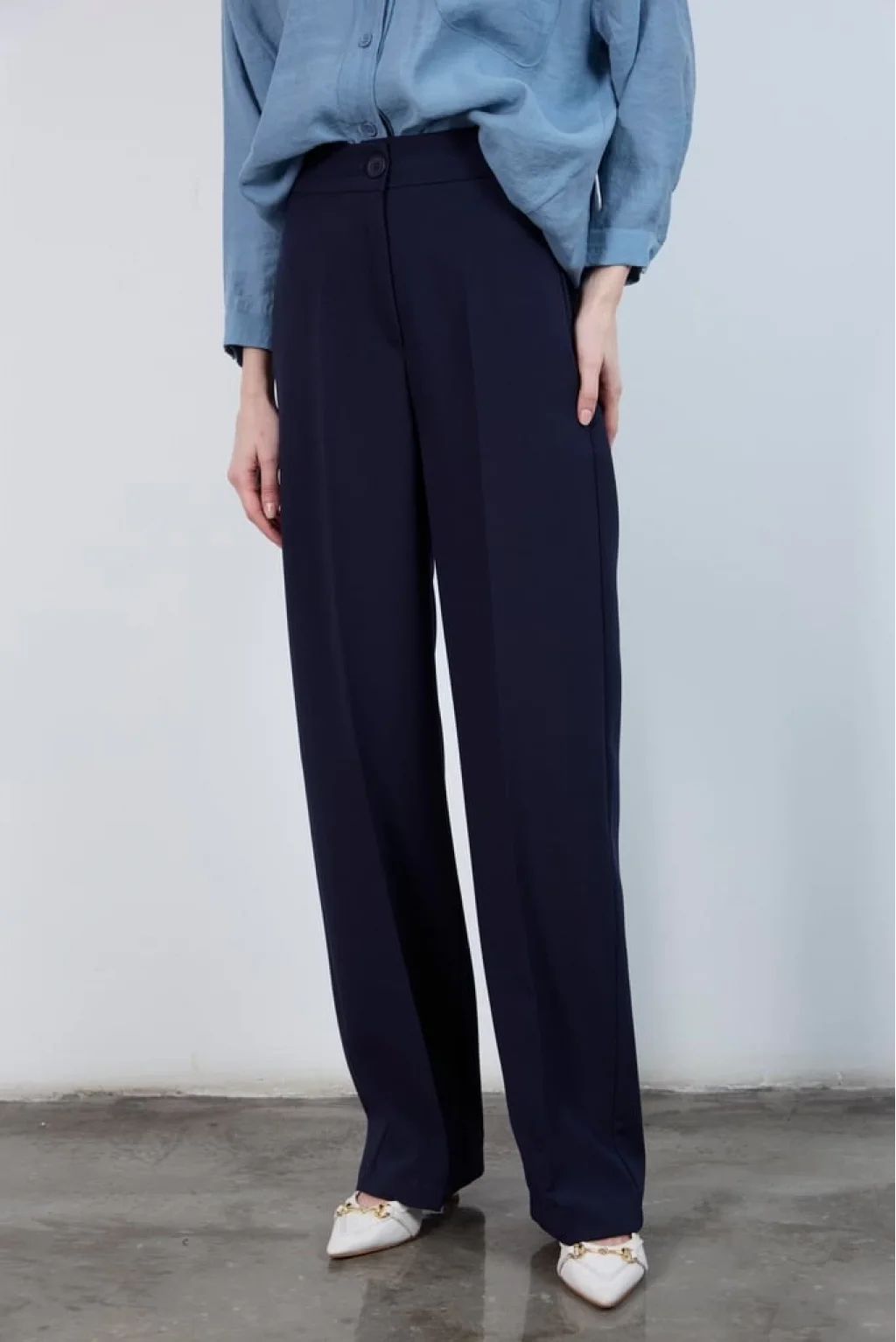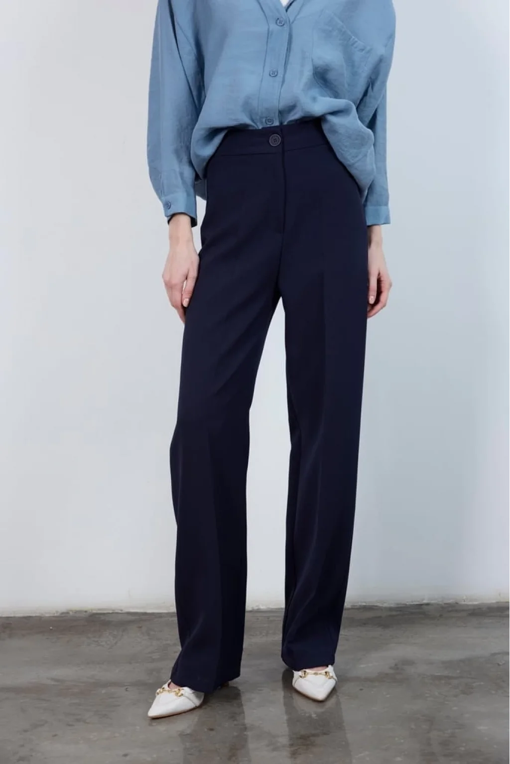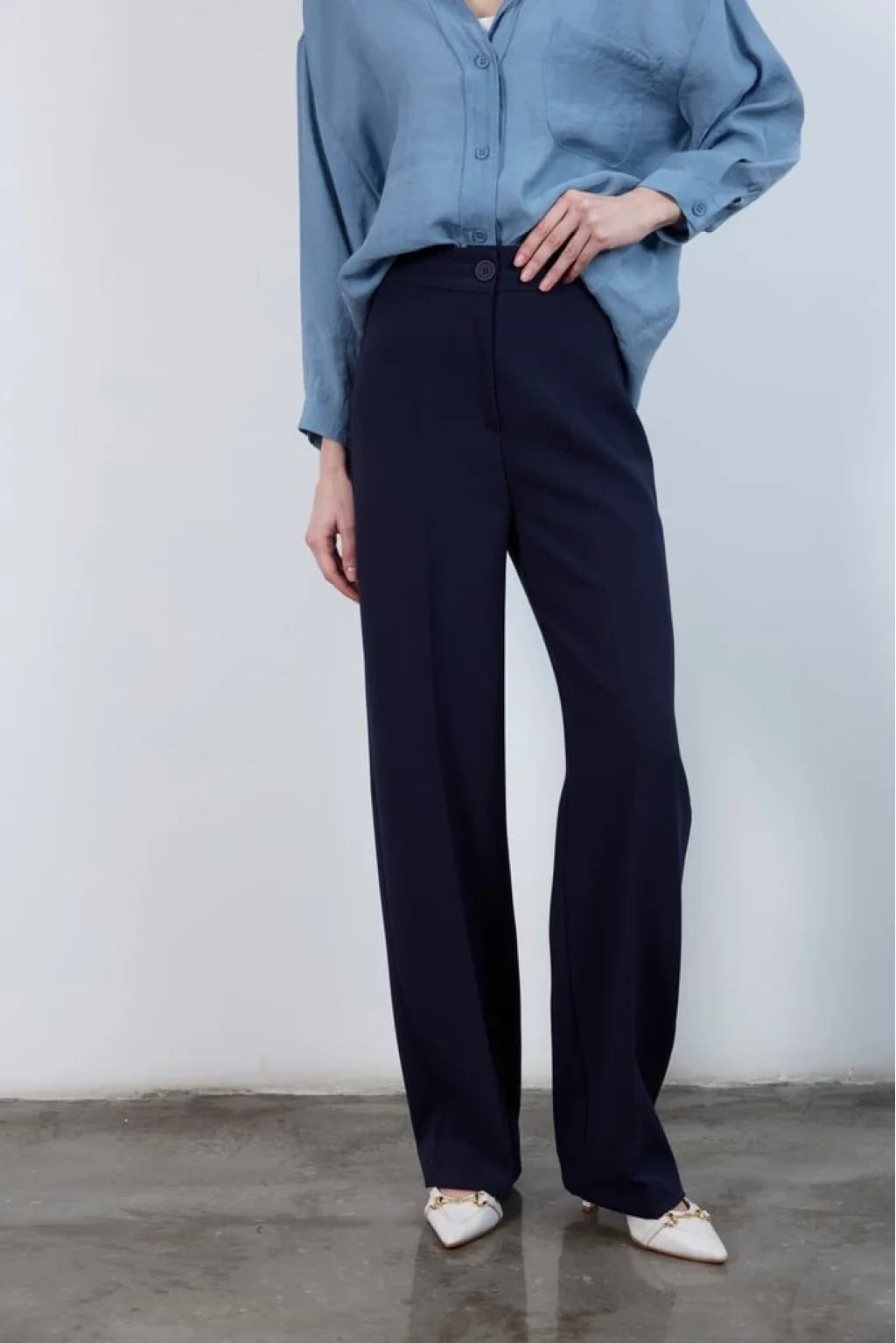 • MYRA Pilesiz Palazzo Paça Lacivert Kumaş Pantolon, konfor ve şıklığı bir arada sunar.