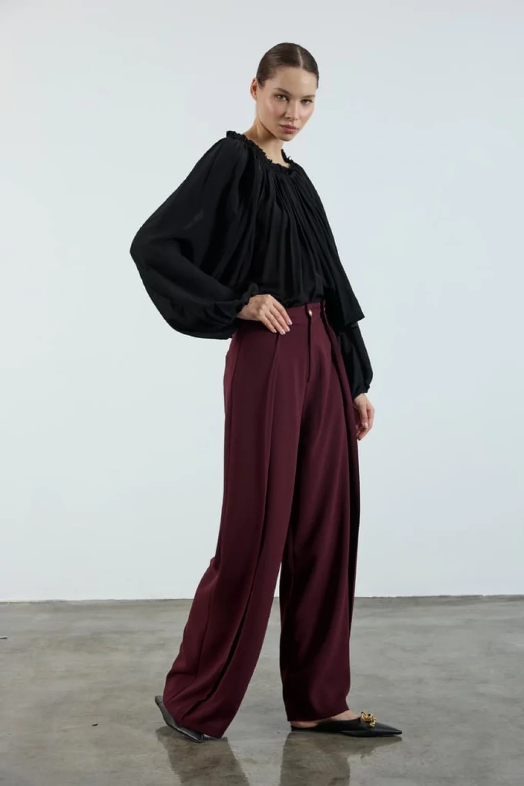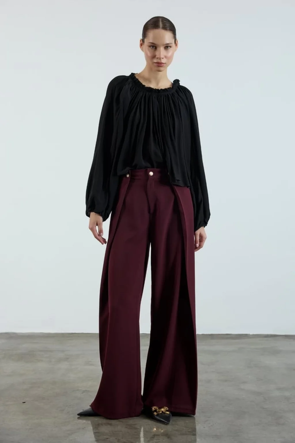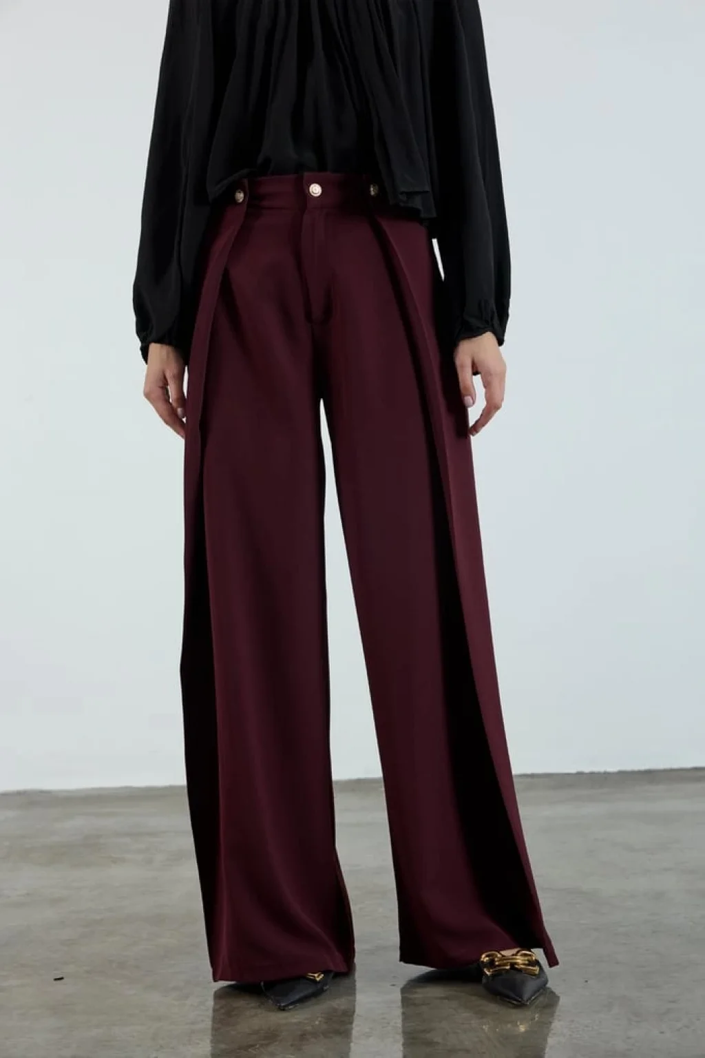Piliseli Kapak Detay Krep Palazzo Pantolon - Bordo