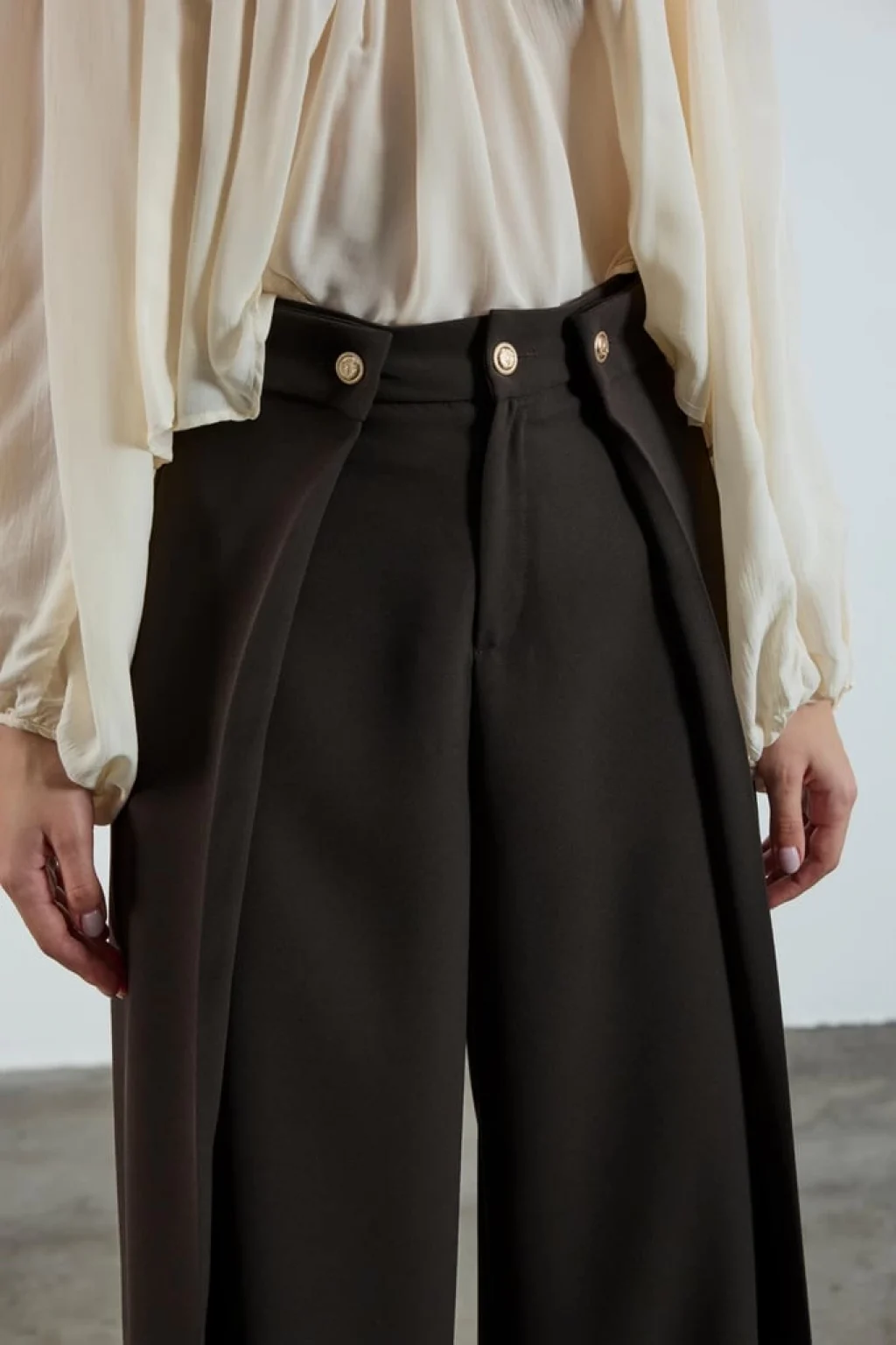 Piliseli Kapak Detay Krep Palazzo Pantolon - Kahve