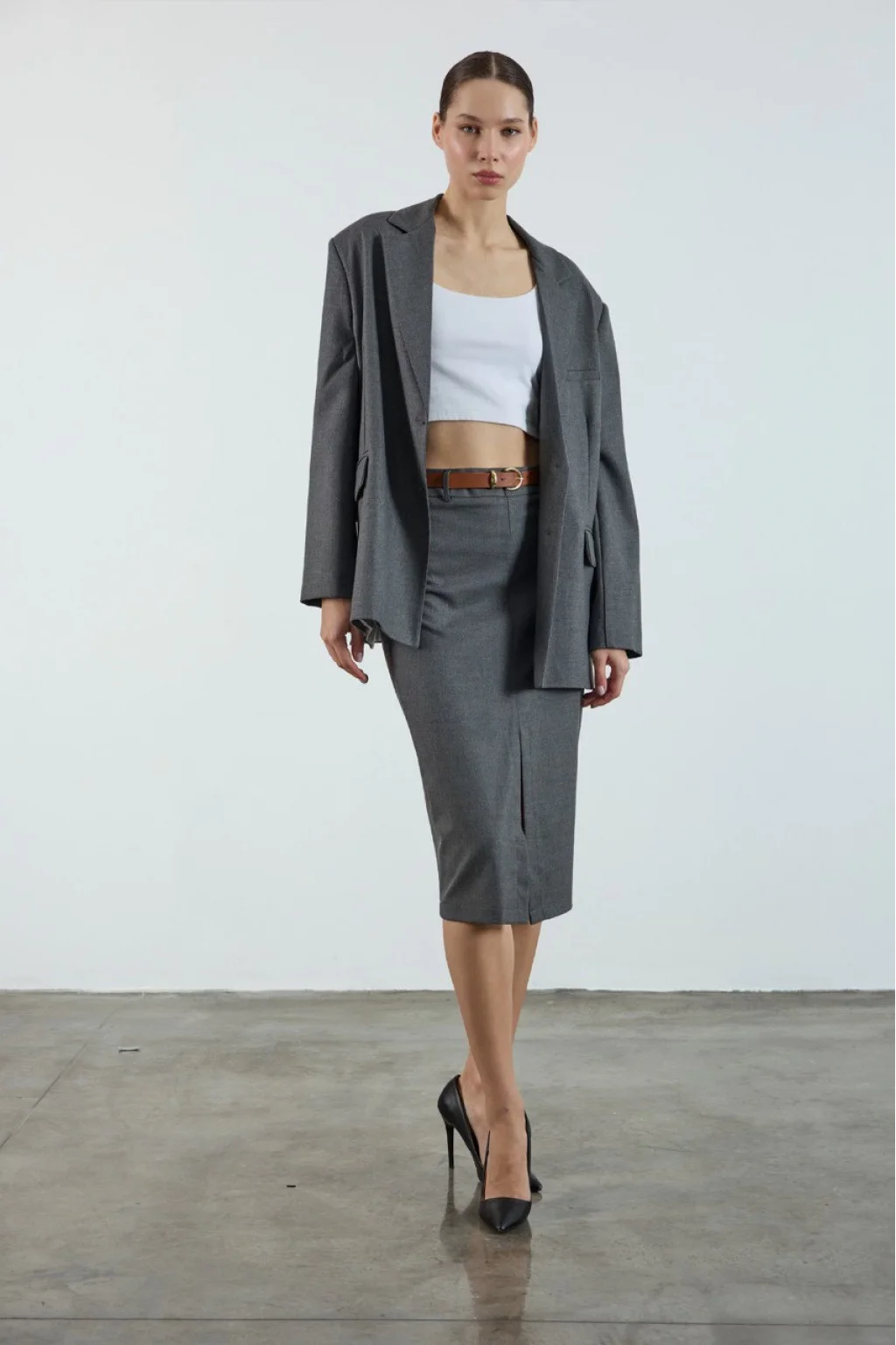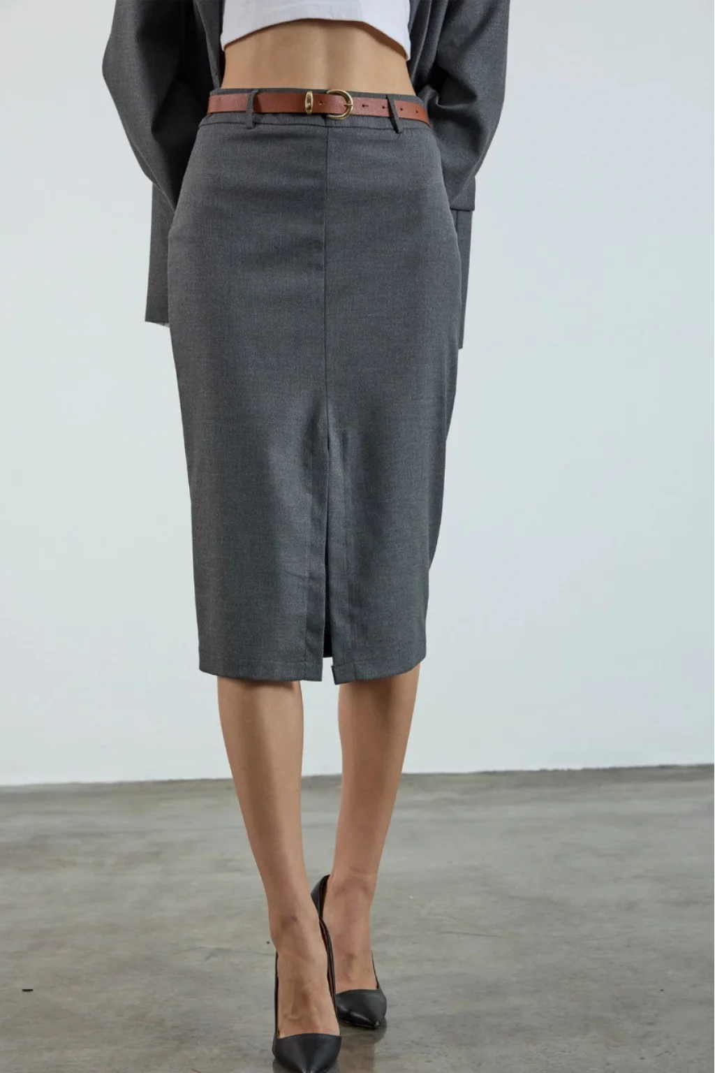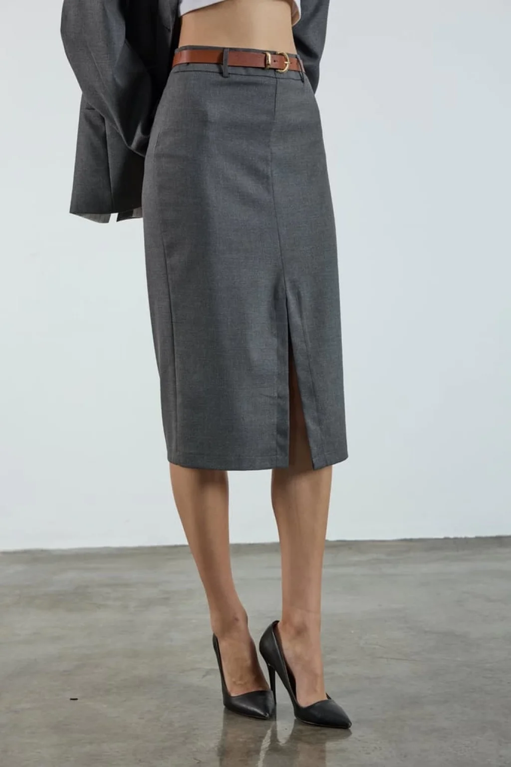 Yükse bel, Fermuar kapamalı Kemer Detaylı Ön yırtmaçlı Astarsız Etek