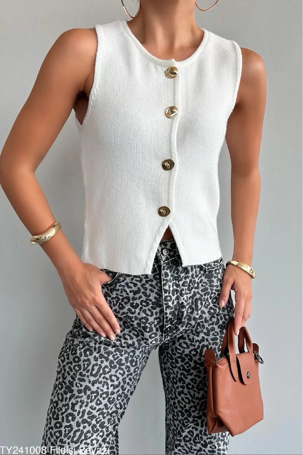 Gold Düğme Beyaz Triko Yelek