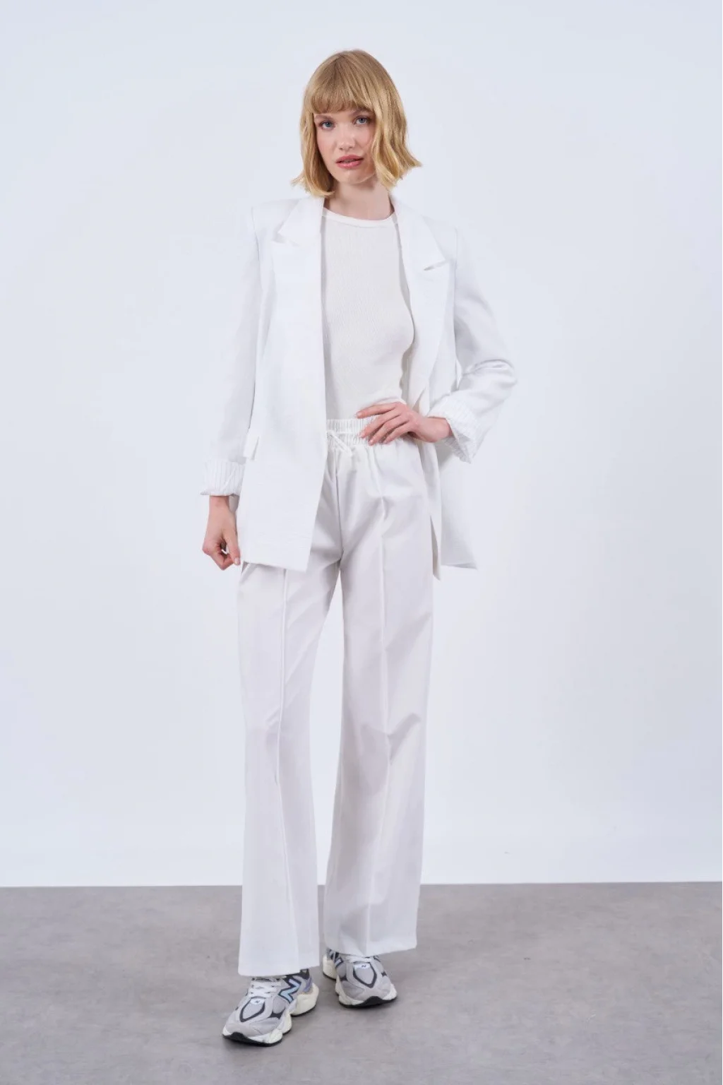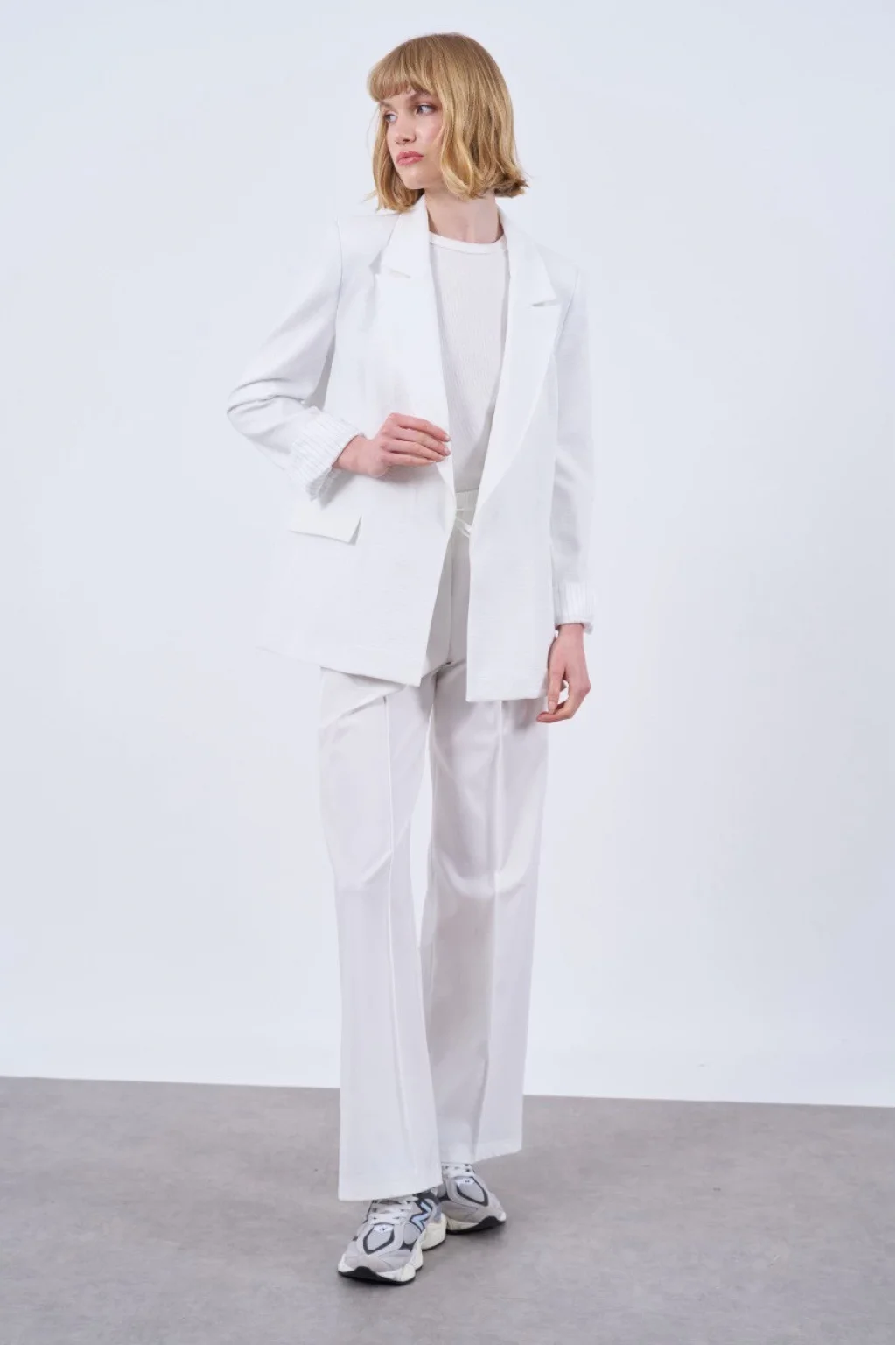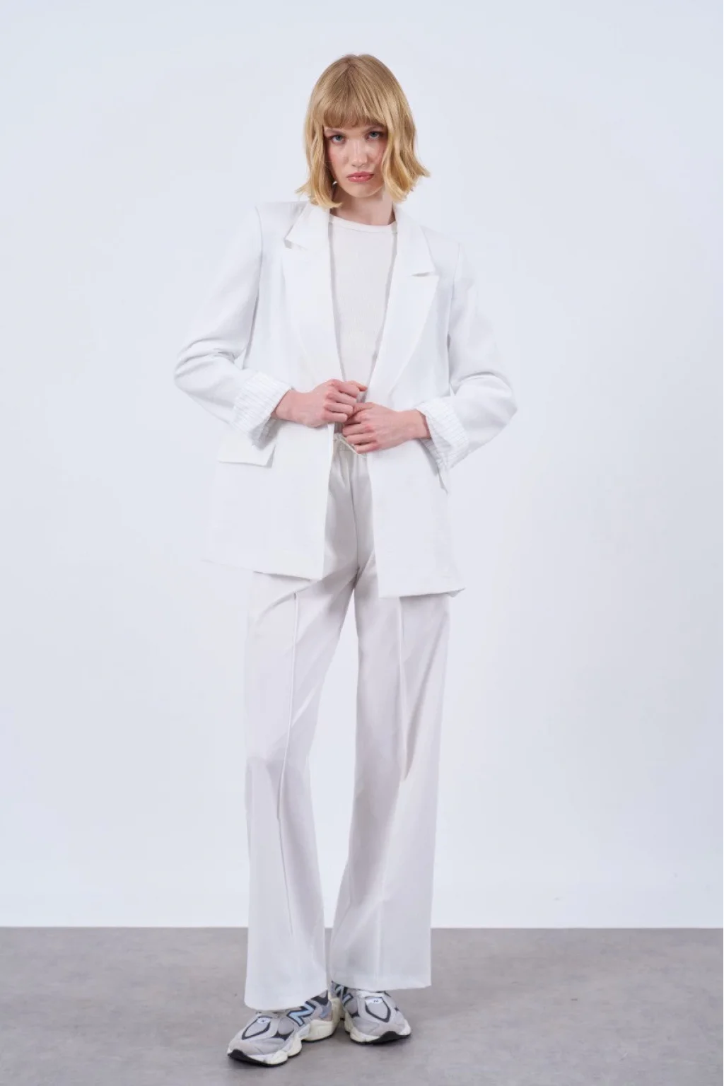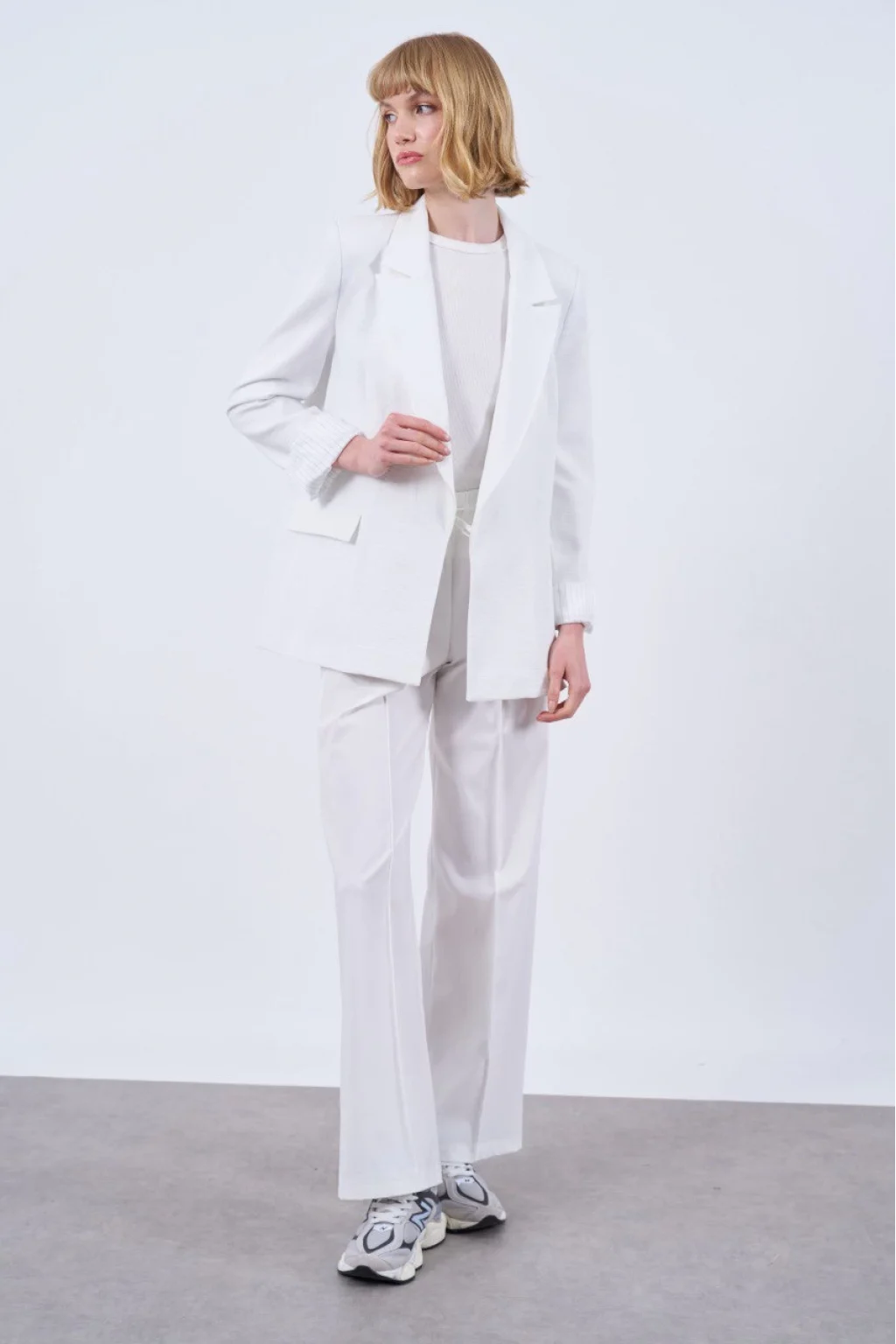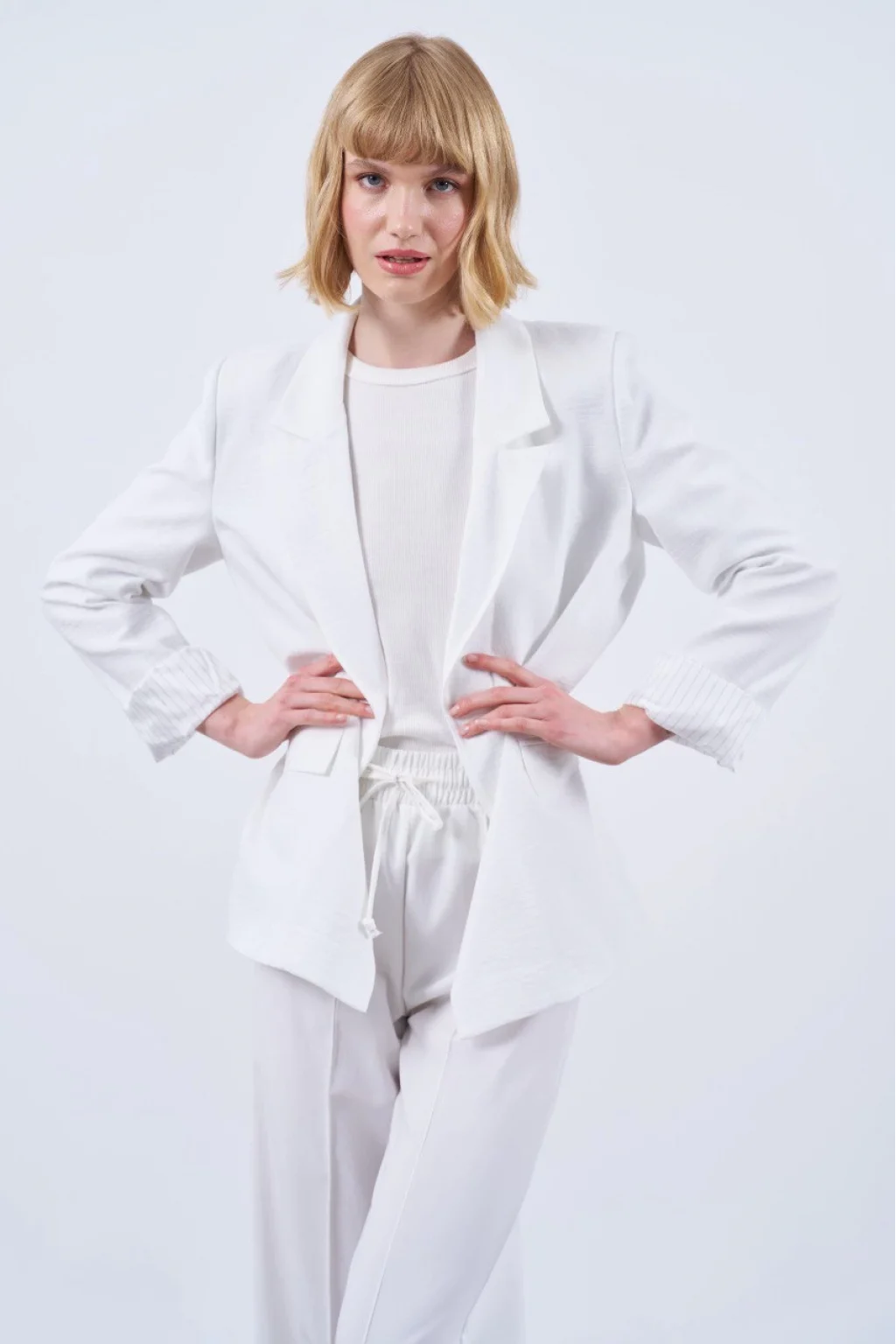 ASTARI ÇİZGİLİ ÇİFT DÜĞME KAPAMALI, KOL KATLAMALI PREMİUM KUMAŞ BEYAZ KETEN CEKET
