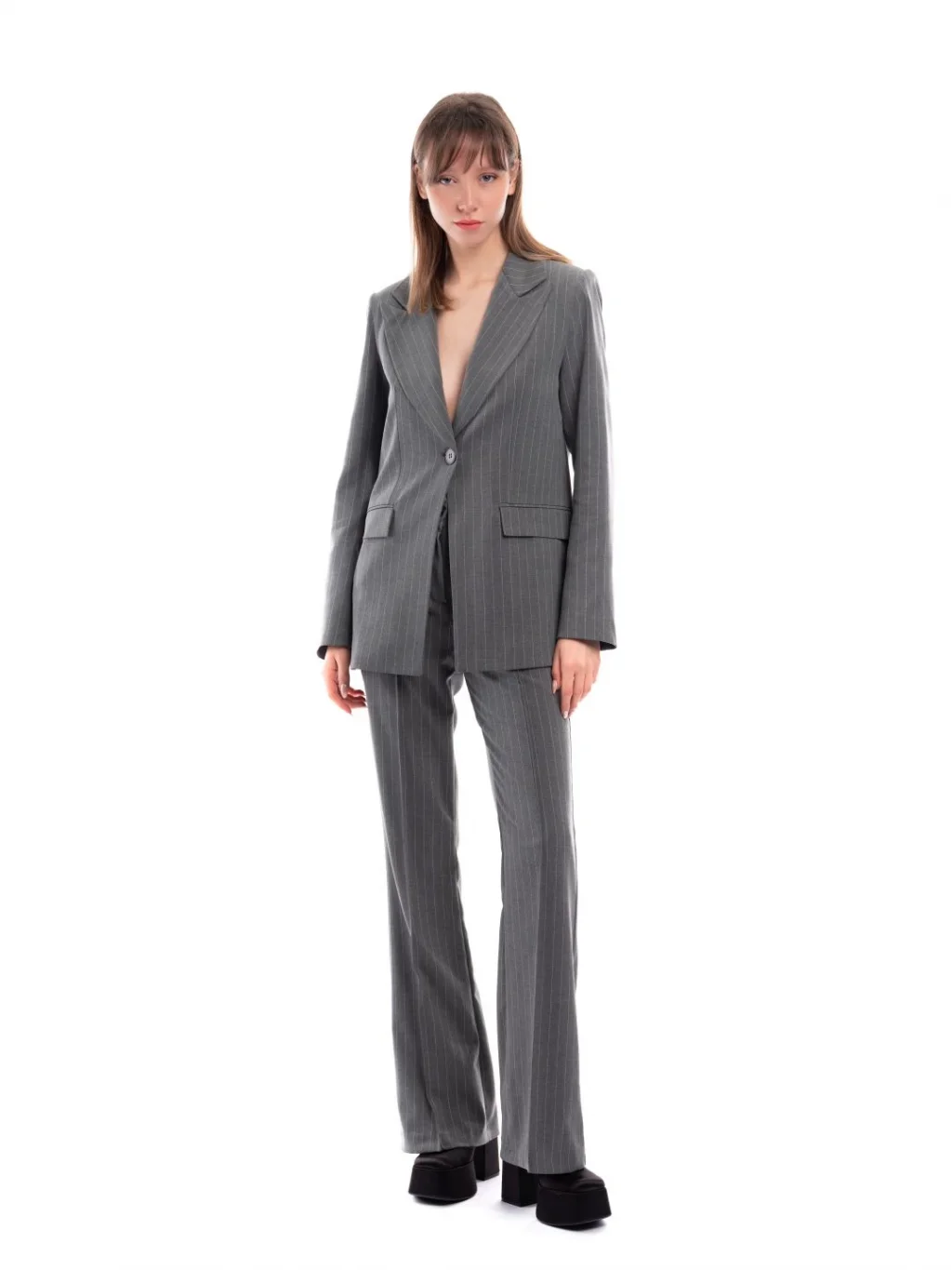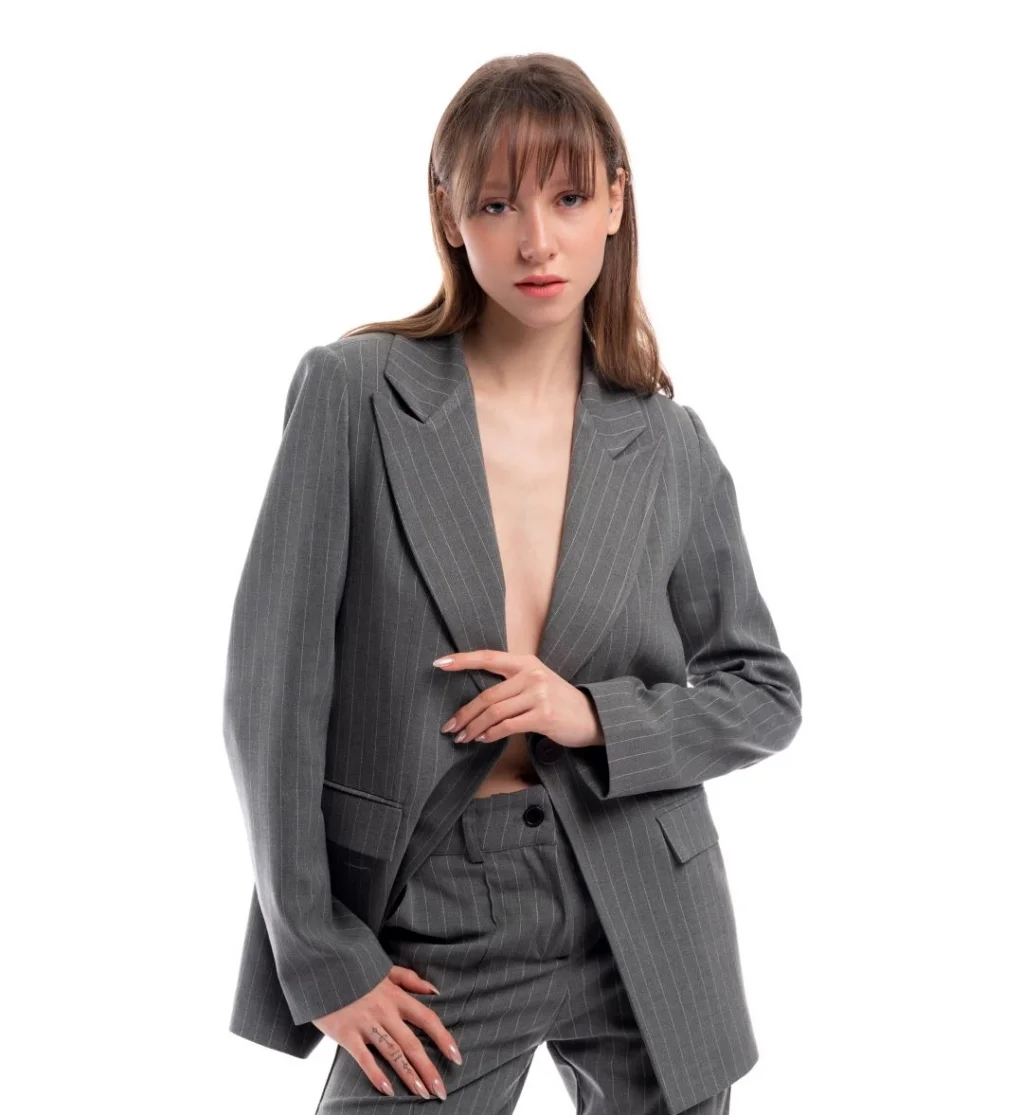 Gri Beyaz Çizgili Blazer Ceket Premium Kumaştan Üretilmiştir