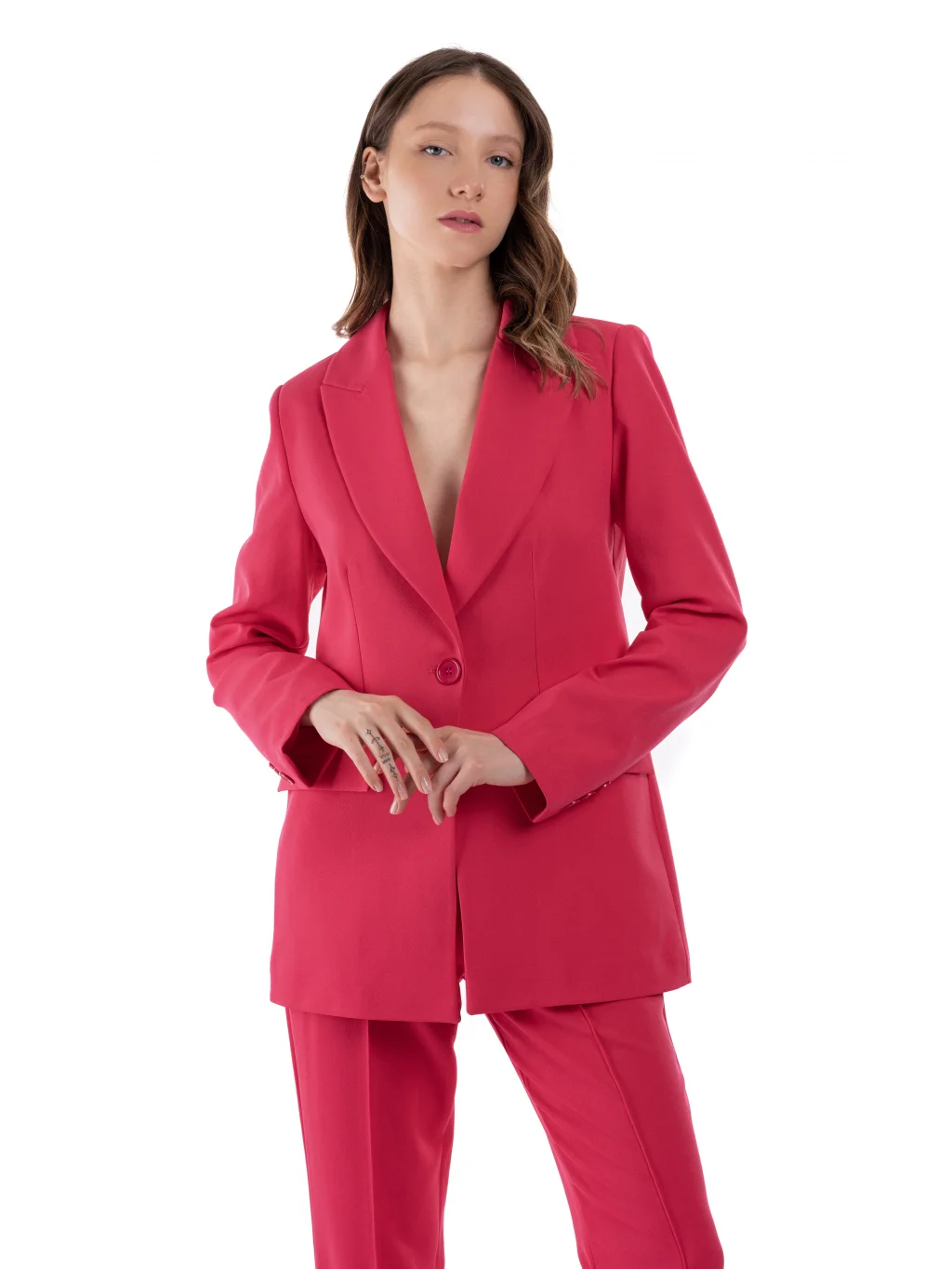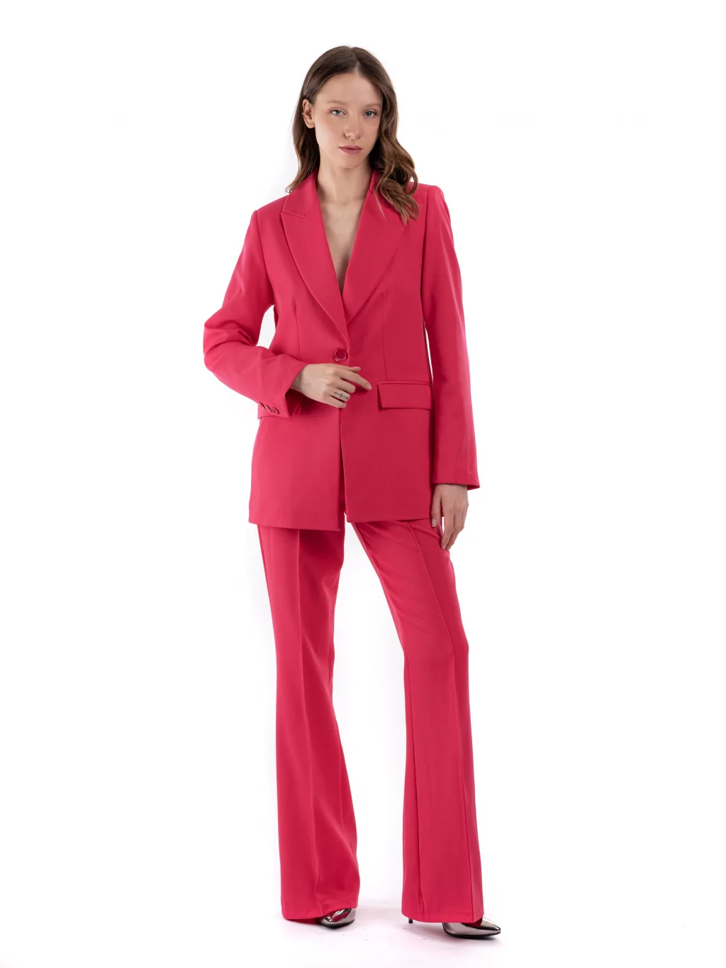 Herhangi bir kadın için gerekli olan klasik ve zamansız bir gardırop olan bu  premium kumaş pembe ceket pantolon takımı, sofistike bir izlenim bırakmanın mükemmel bir yoludur. Hafif ama dayanıklı kumaştan üretilen bu model, kırpma kesimli özel bir blazer, iki kanat cebi ve tepe yakasının yanı sıra zarif bir siluet için düz oturan pantolonlara sahiptir. Set, daha fazla stil için yumuşak kıvrımlarla tamamlanmıştır, bu da onu hem resmi hem de gündelik durumlar için ideal kılar. Kaliteli yapısı ve cazip fiyat etiketi ile bu şık kadın çift takım elbisesinde elinizden gelenin en iyisini yaptığınızdan emin olabilirsiniz.