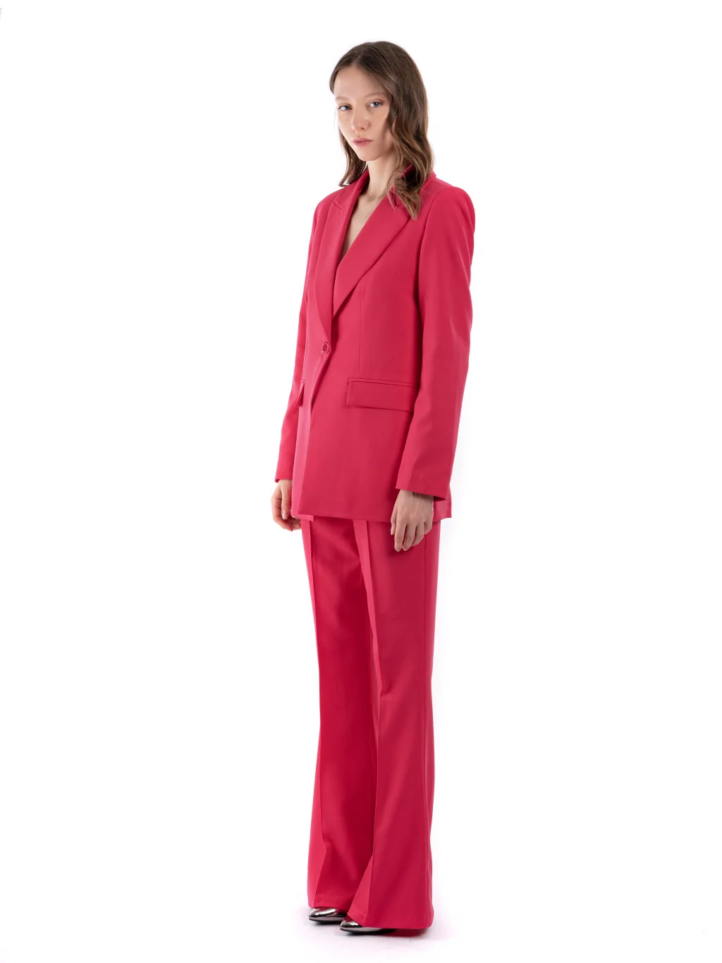 • Klasik bir ceket pantolon takımı için açık pembe premium kumaştan yapılmıştır.