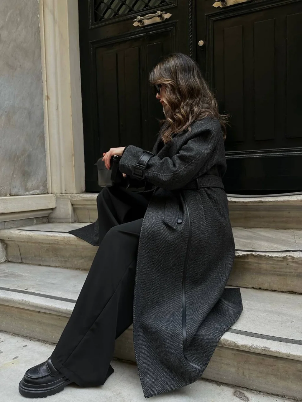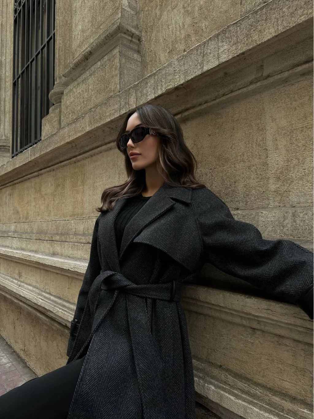 Premium Model Oversize Deri Kol Yün ve Pamuk Karisimi Siyah Kaban