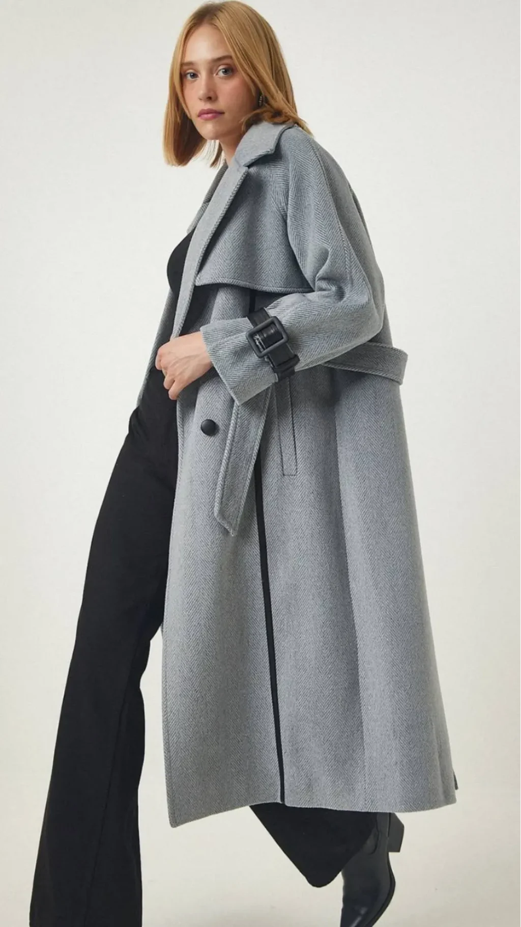Premium Model Oversize Deri Kol Yun ve Pamuk Karisimi Gri Kaban