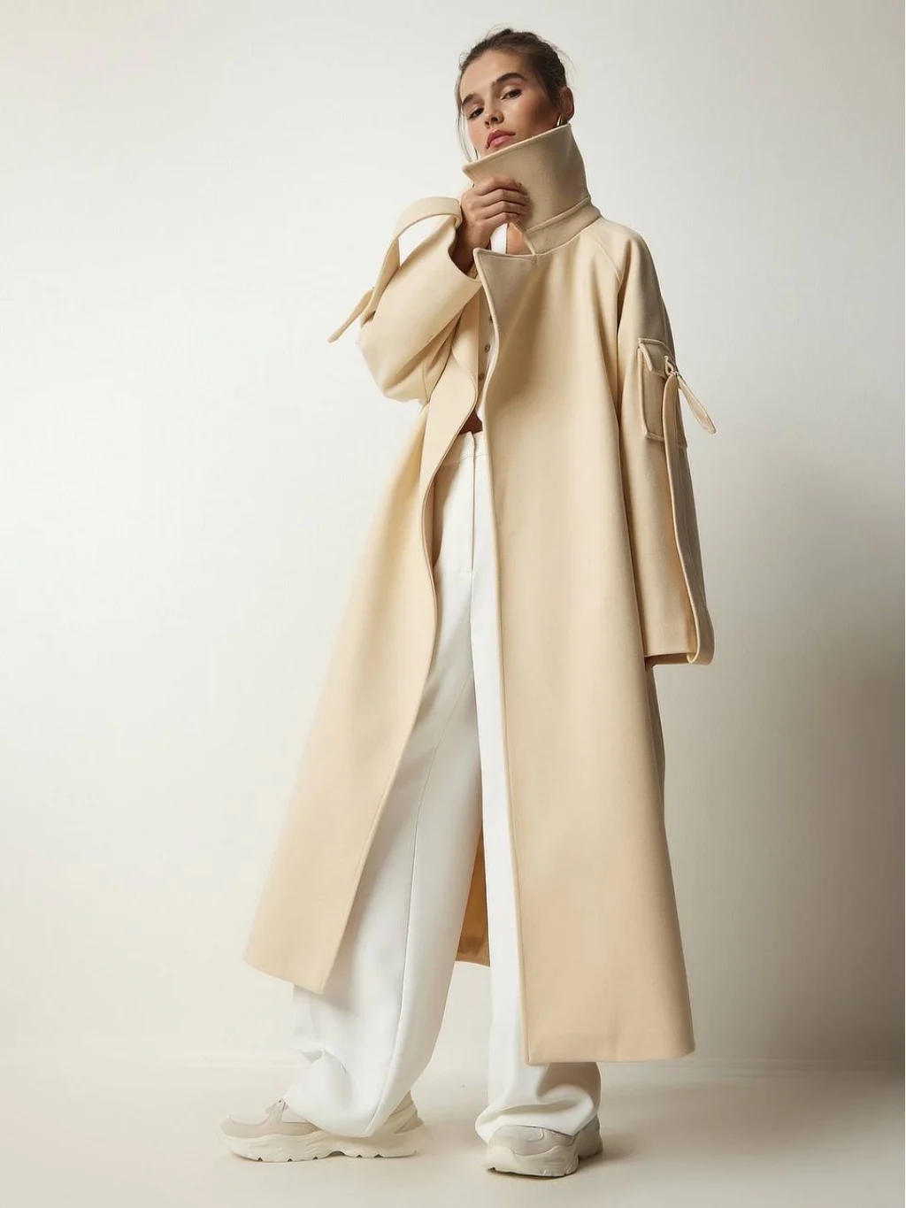 UZUN KOLLU, GENİŞ KATLI YAKALI, KOLU CEP DETAYLI, AYNI KUMAŞTAN KUŞAKLI, ÖNÜ CEPLİ, İÇİ ASTARLI OVERSİZE UZUN KABAN
