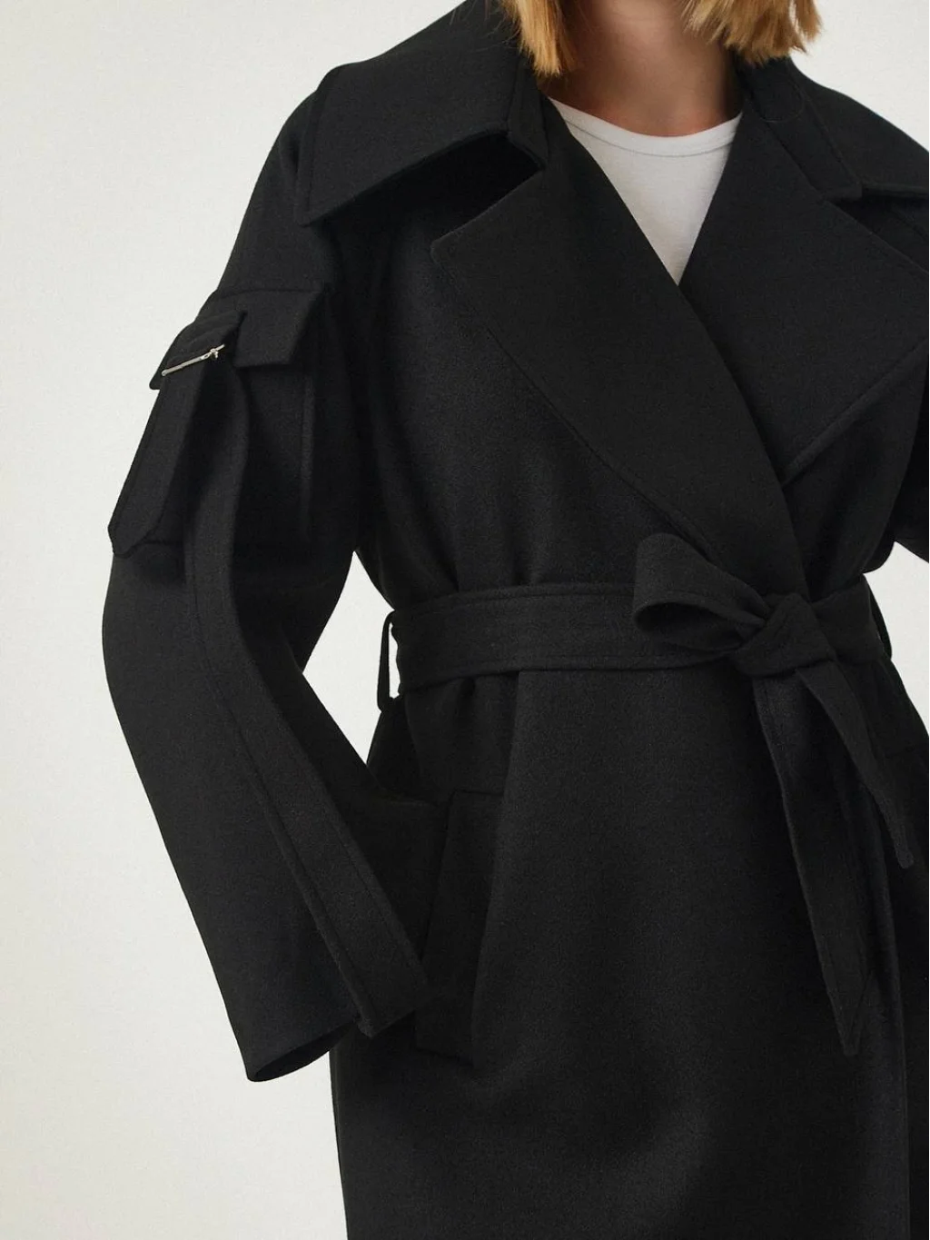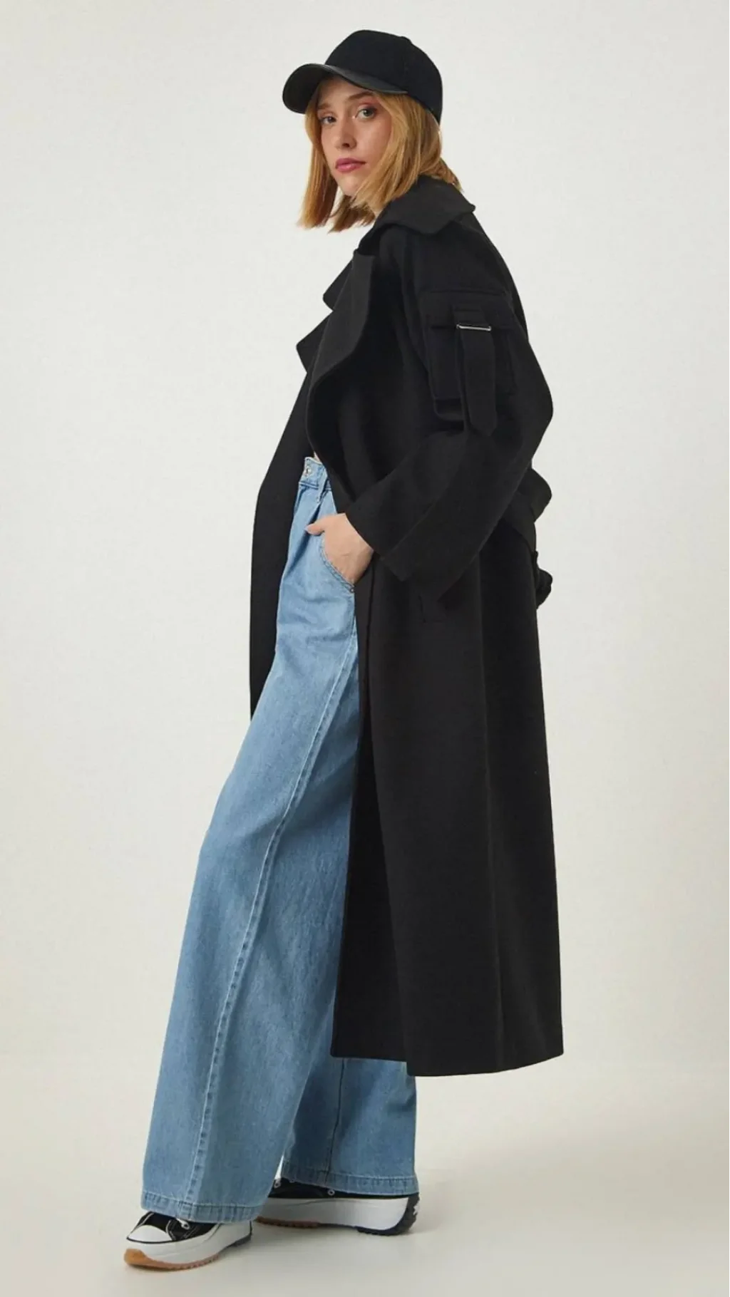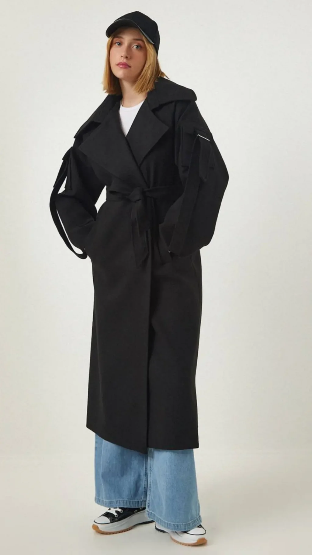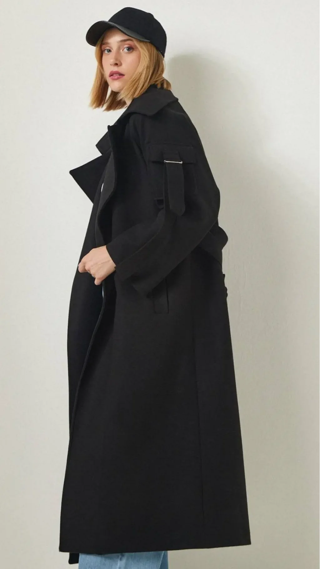 UZUN KOLLU, GENİŞ KATLI YAKALI, KOLU CEP DETAYLI, AYNI KUMAŞTAN KUŞAKLI, ÖNÜ CEPLİ, İÇİ ASTARLI OVERSİZE UZUN KABAN