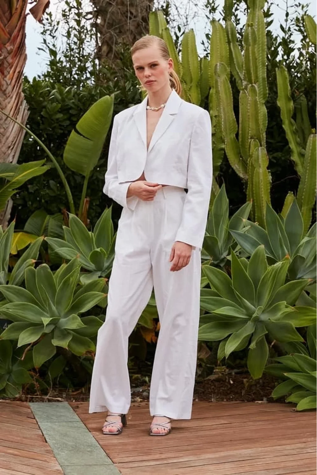 Premium Seri Beyaz Keten Crop Ceket Pantolon Takım