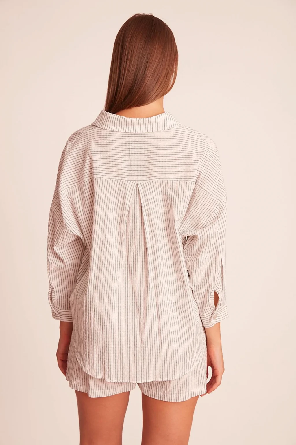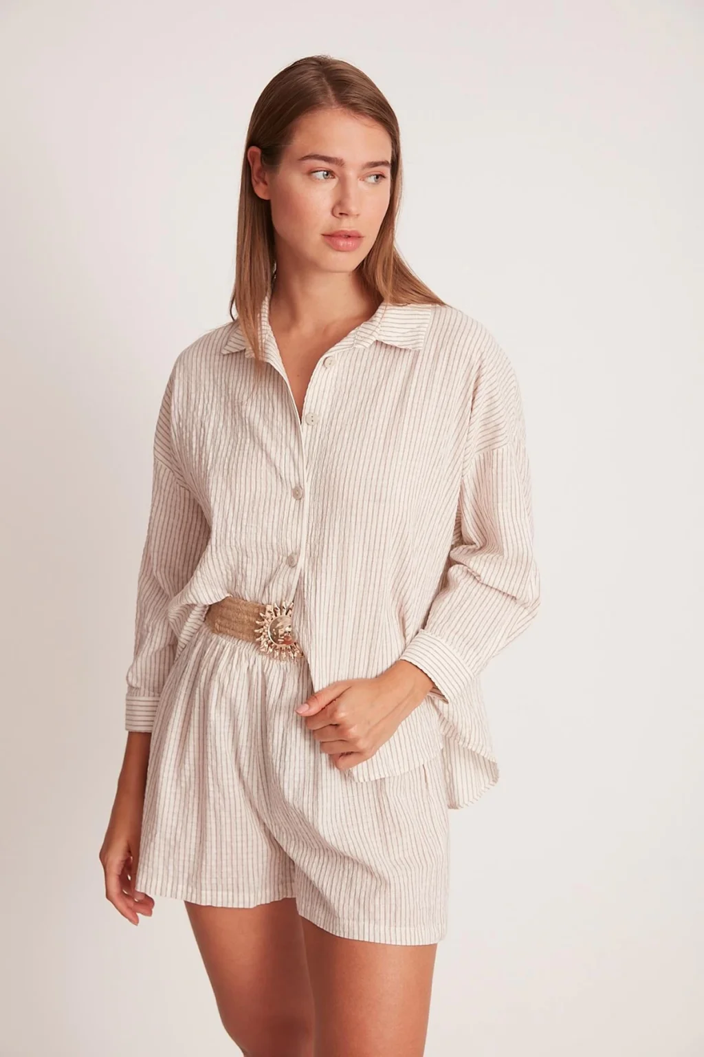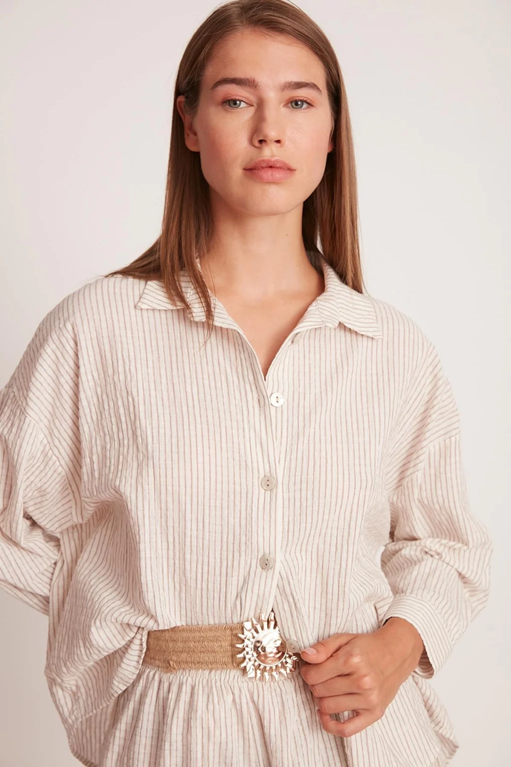 PREMİUM SERİ ÇİZGİLİ KEMERLİ ŞORT TAKIM-KAHVE