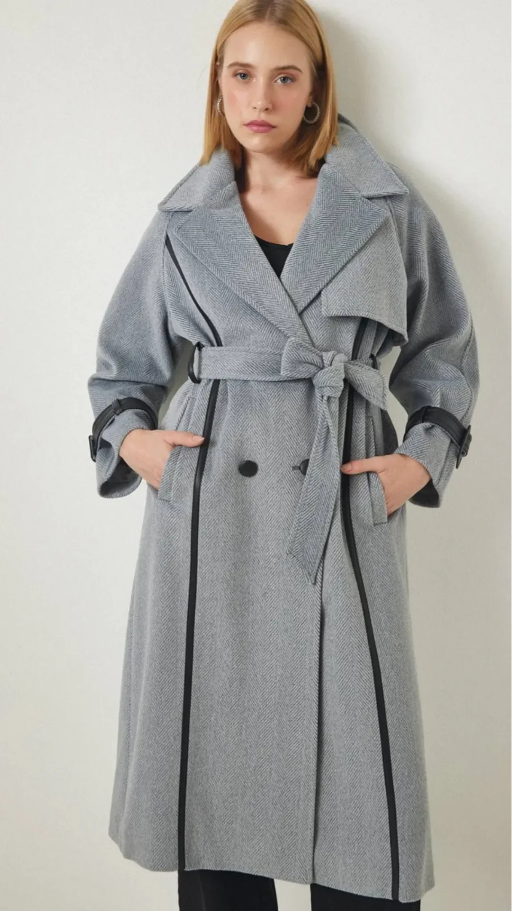 Premium Model Oversize Deri Kol Yun ve Pamuk Karisimi Gri Kaban