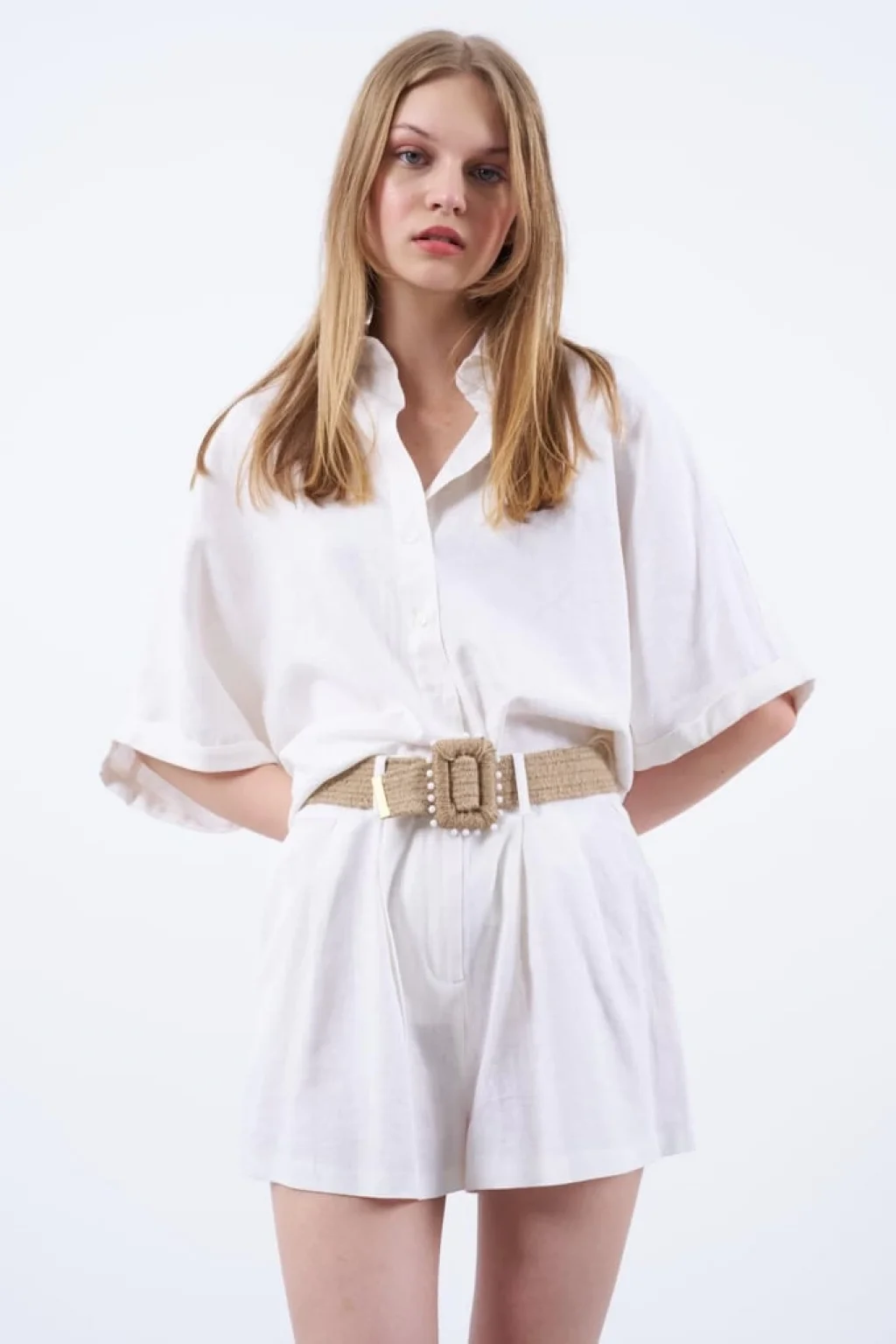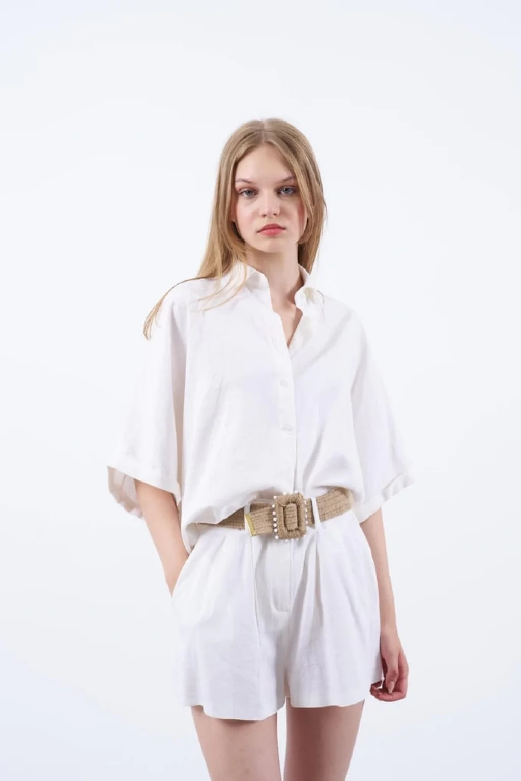 MYRA Premium Seri Keten Şort Gömlek Takımı - Beyaz rengiyle şıklığınızı tamamlayın! Ham keten dokusu ve premium kalitesiyle öne çıkar.