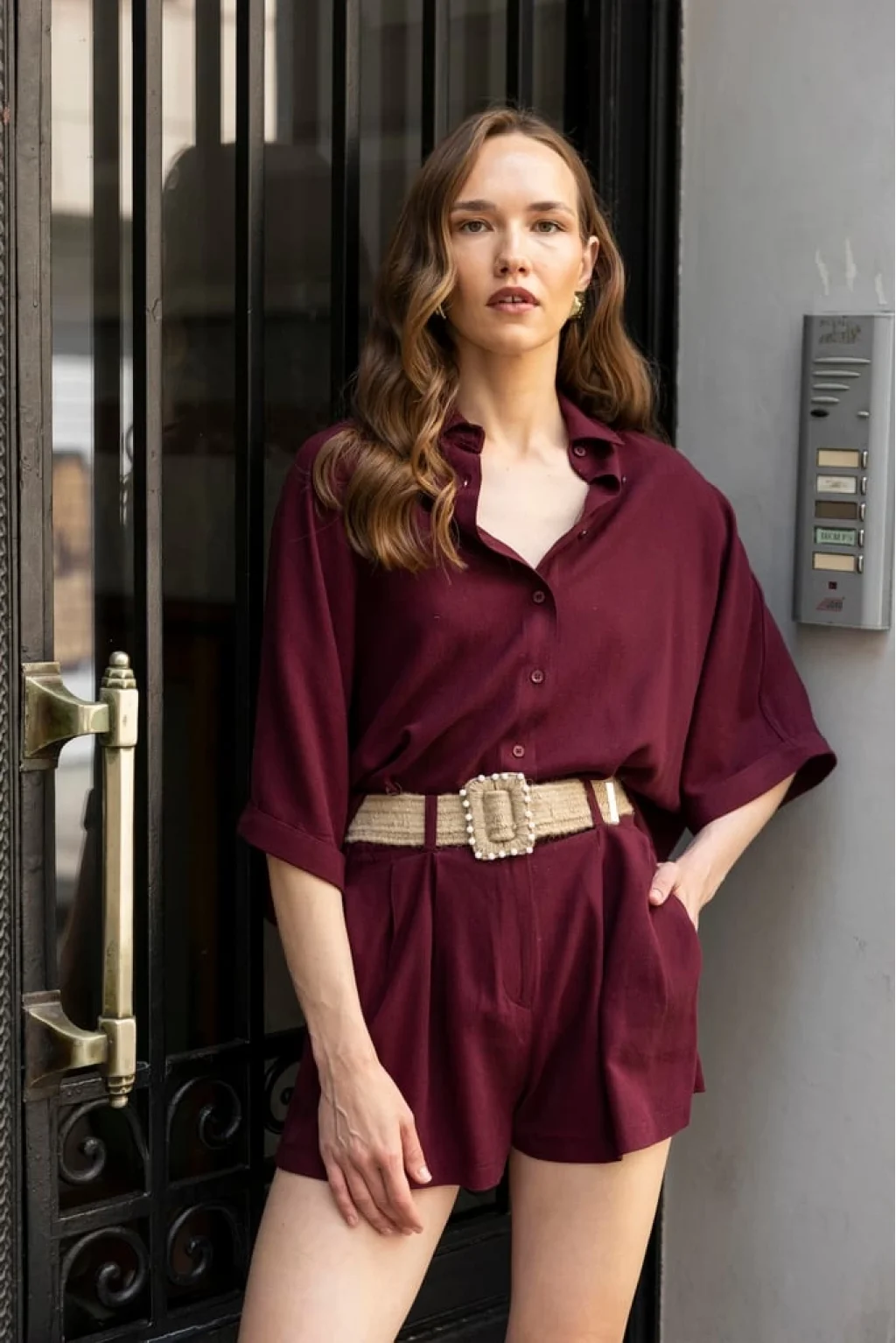 Bordo Renk Keten Kemerli Şort Gömlek İkili Takım