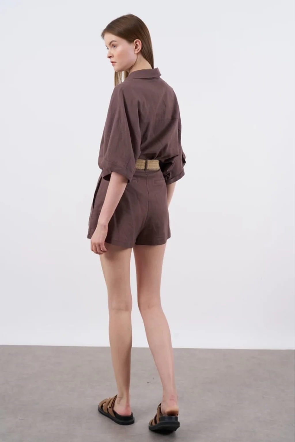 MYRA Premium Seri Keten Şort Gömlek Takımı - Kahverengi şıklığınızı tamamlayın! Ham keten dokusu ve premium kalitesiyle öne çıkar.