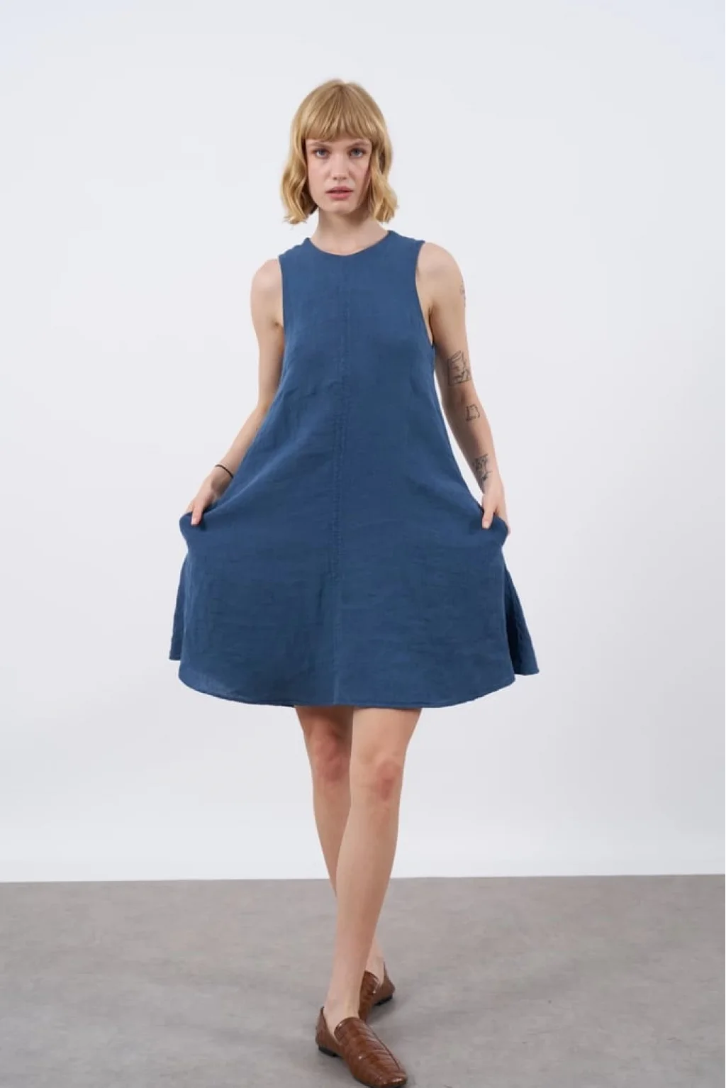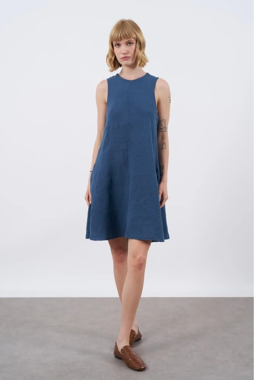 Premium Seri Sıfır Kol Keten Elbise-Mavi