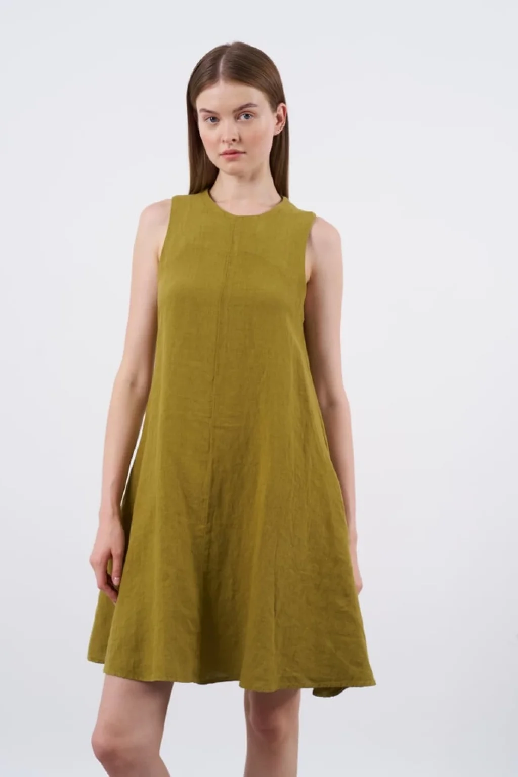 Premium Seri Sıfır Kol Keten Elbise-Yağ yeşili