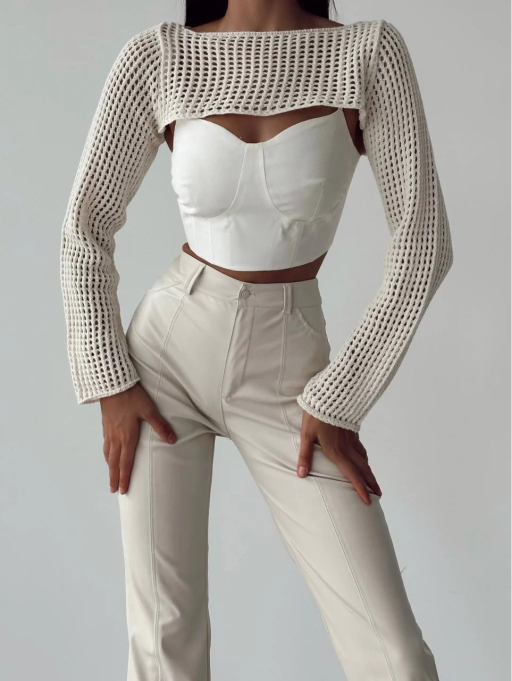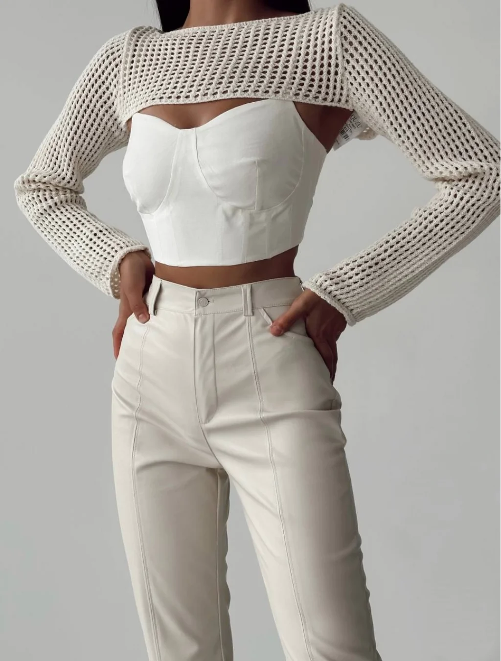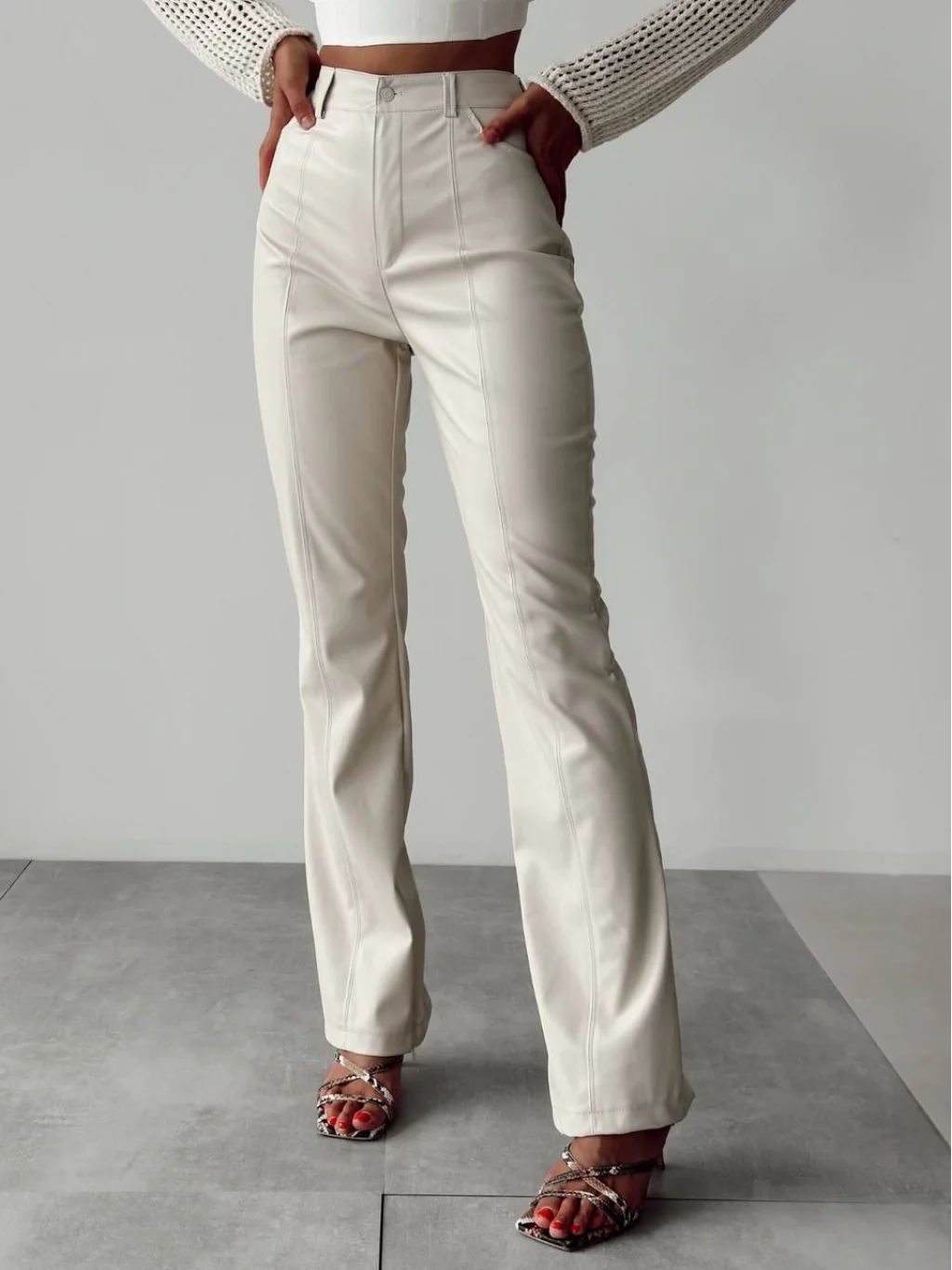Yüksek bel, yandan gizli fermuarlı, paçası yandan fermuarlı, deri pantolon.
