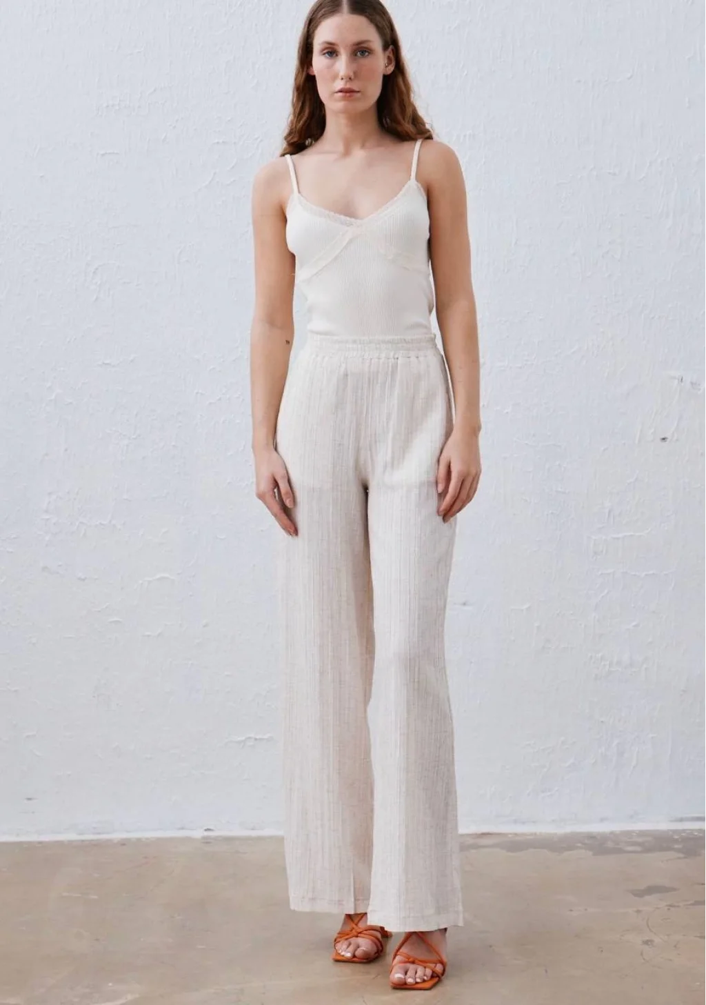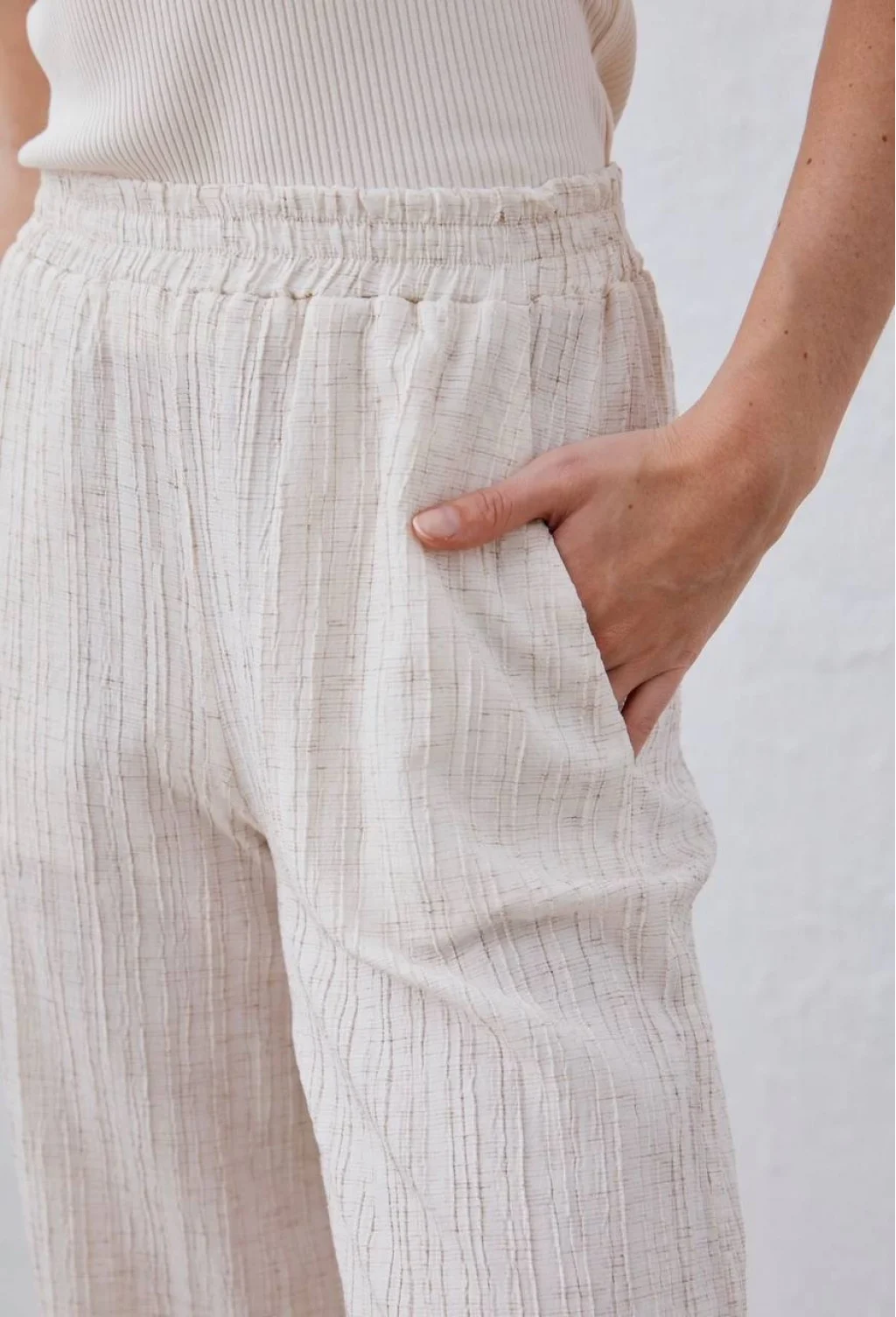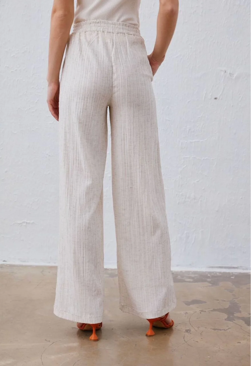 GENİŞ PAÇA ÇİZGİ DOKULU BELİ LASTİKLİ KETEN PANTOLON