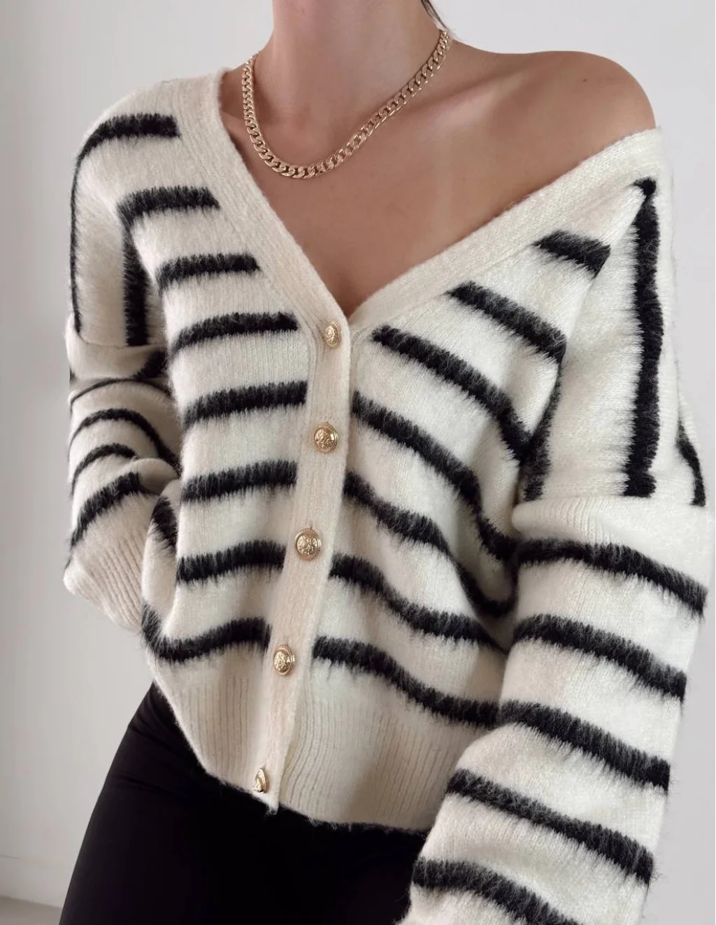 Standart Beden Gold Düğme Detaylı Ekru ve Siyah Çizgili