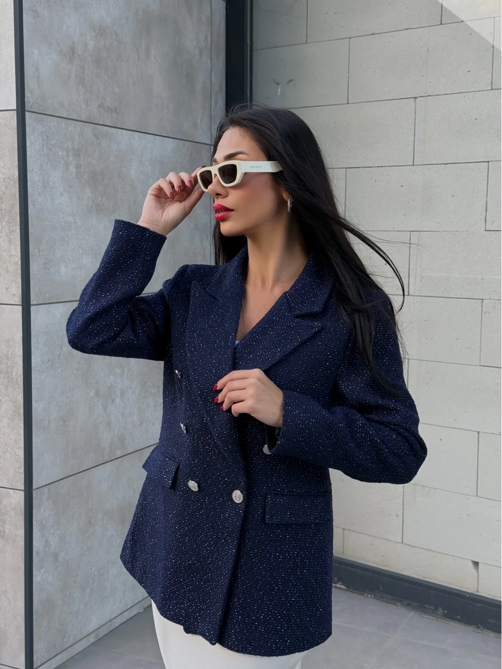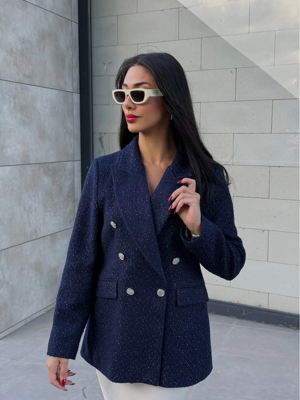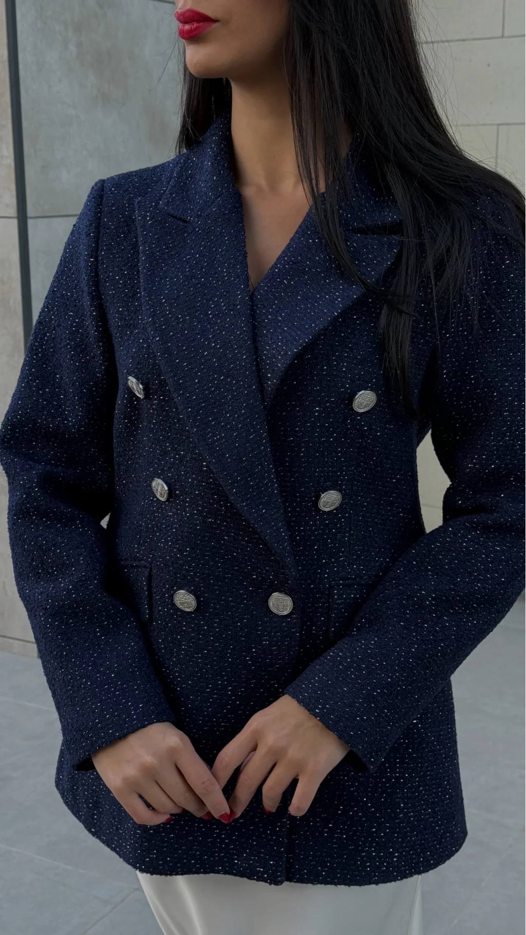 • MYRA'nın şık detaylara sahip Simli Şanel Kruvaze Blazer Ceketi, premium tarzıyla dikkat çekiyor.