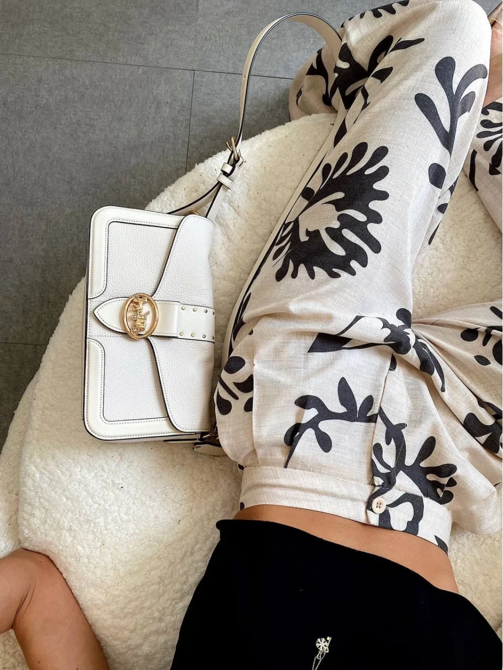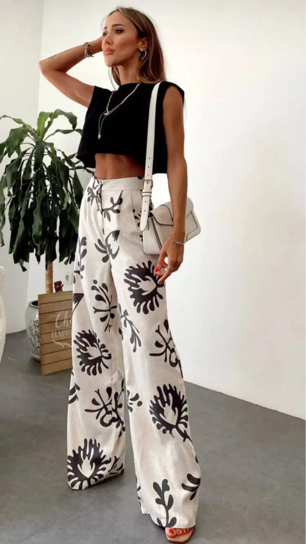 Siyah Çiçek Desenli Krem Palazzo Keten Pantolon
