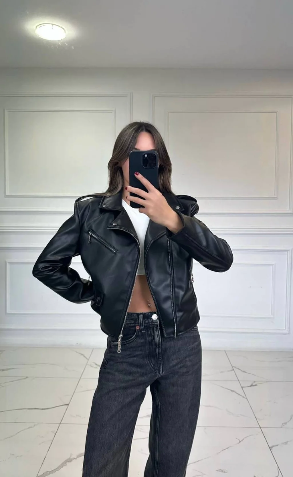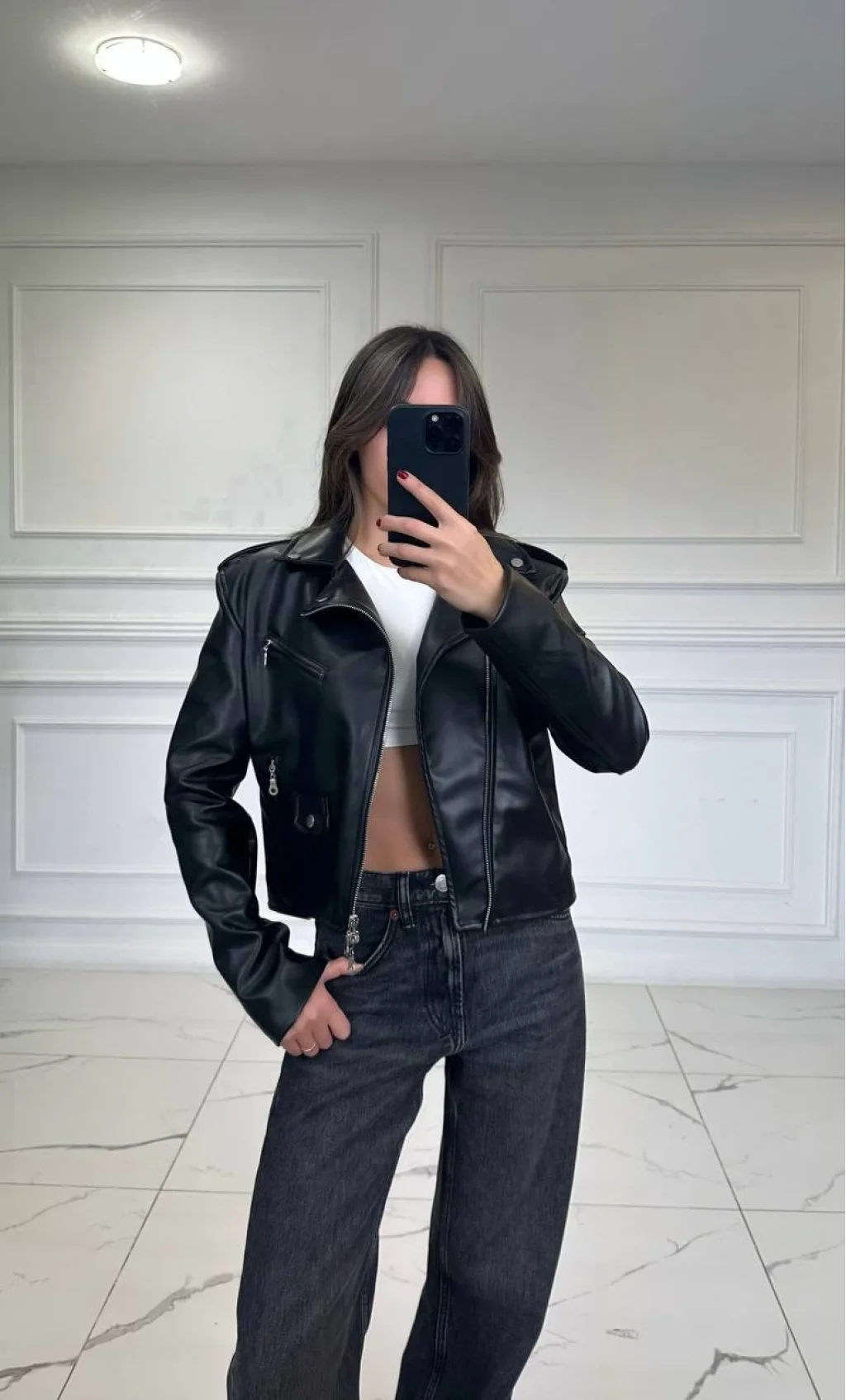 SİYAH FERMUAR DETAYLI DERİ CEKET