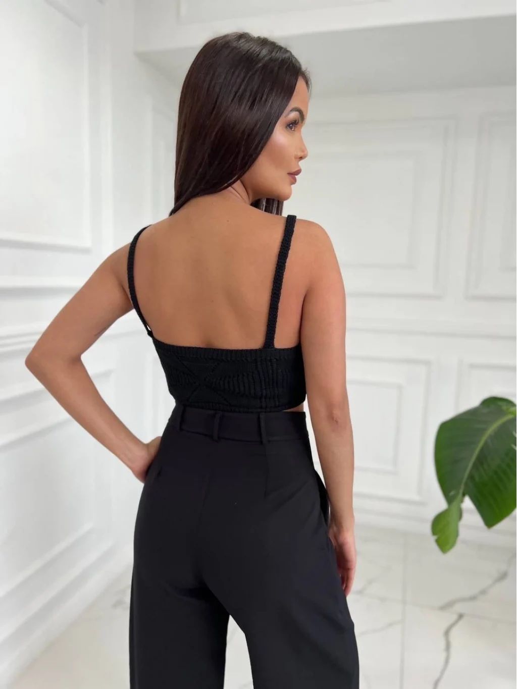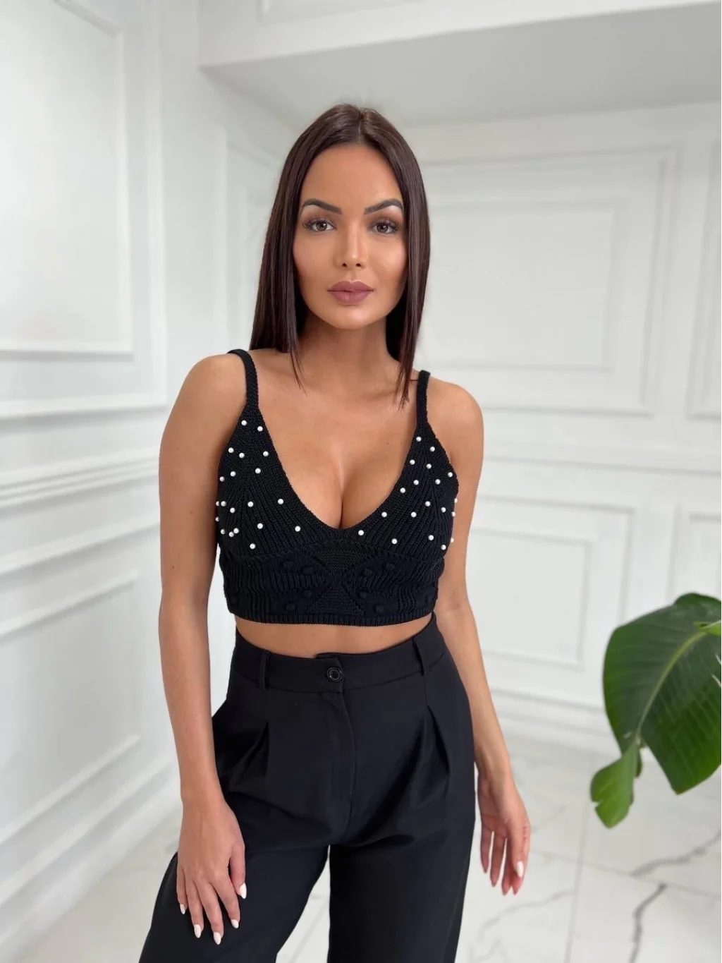 İnci Detaylı Triko Askılı Dekolteli Crop