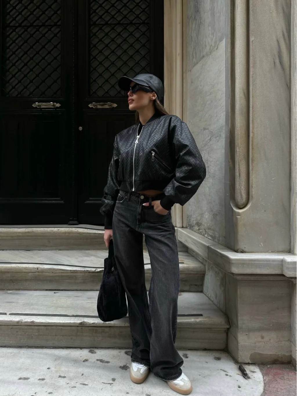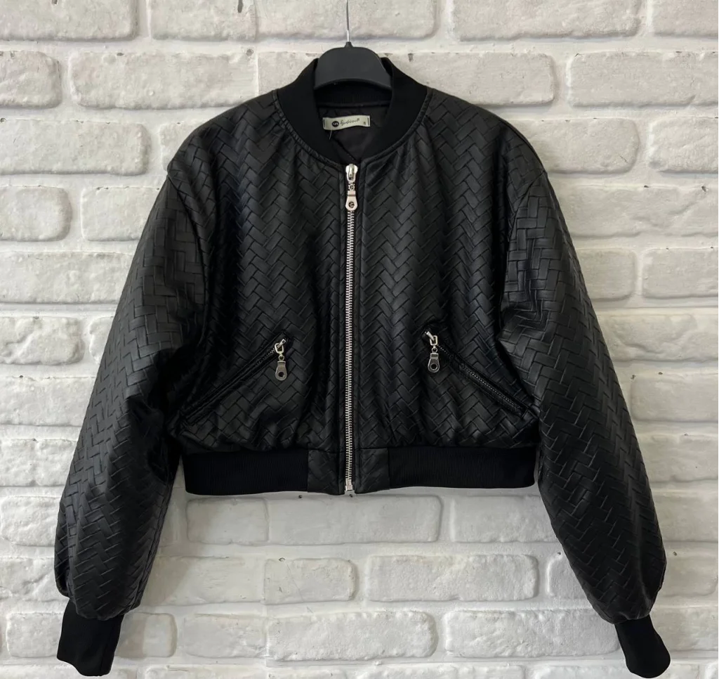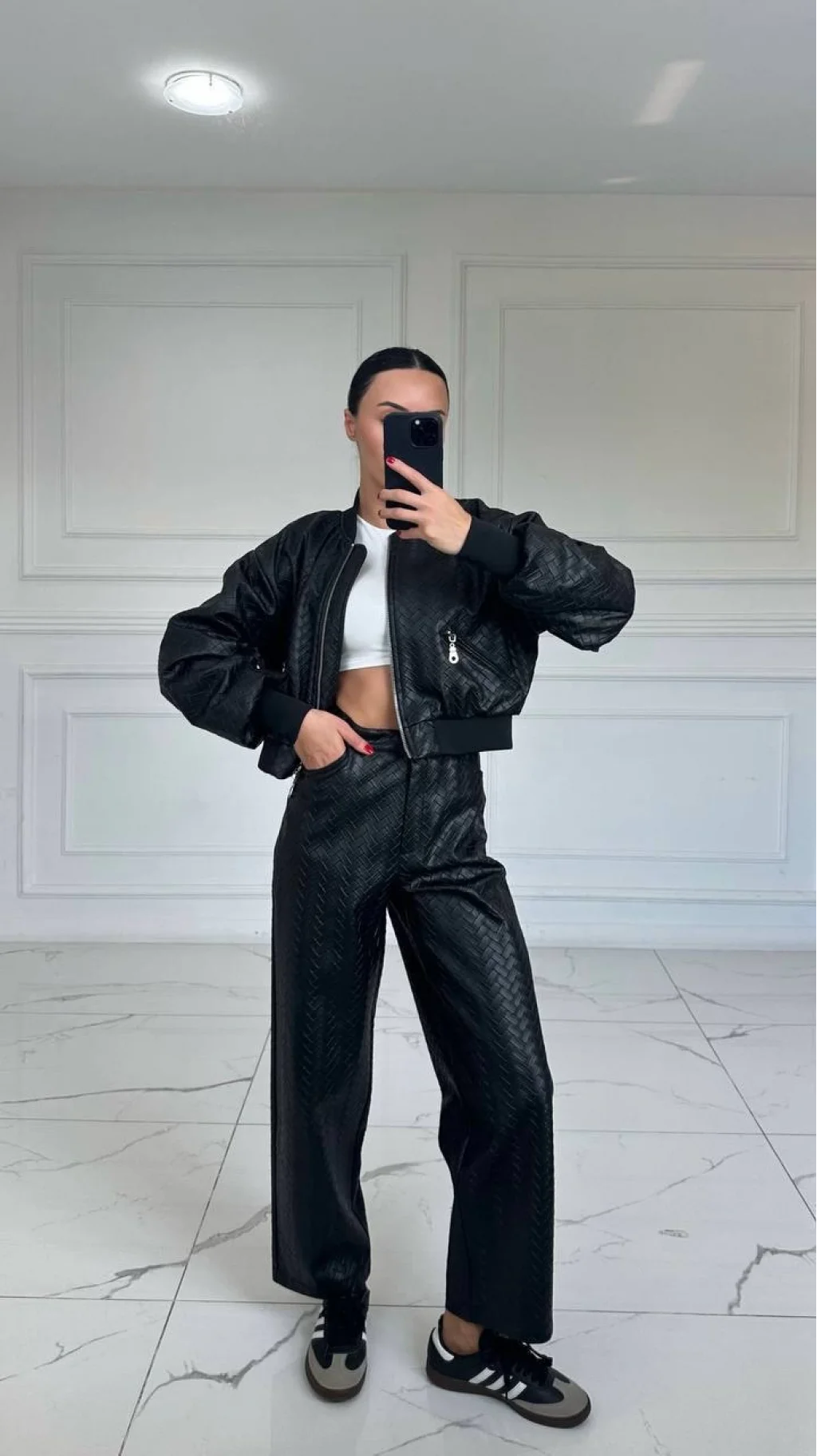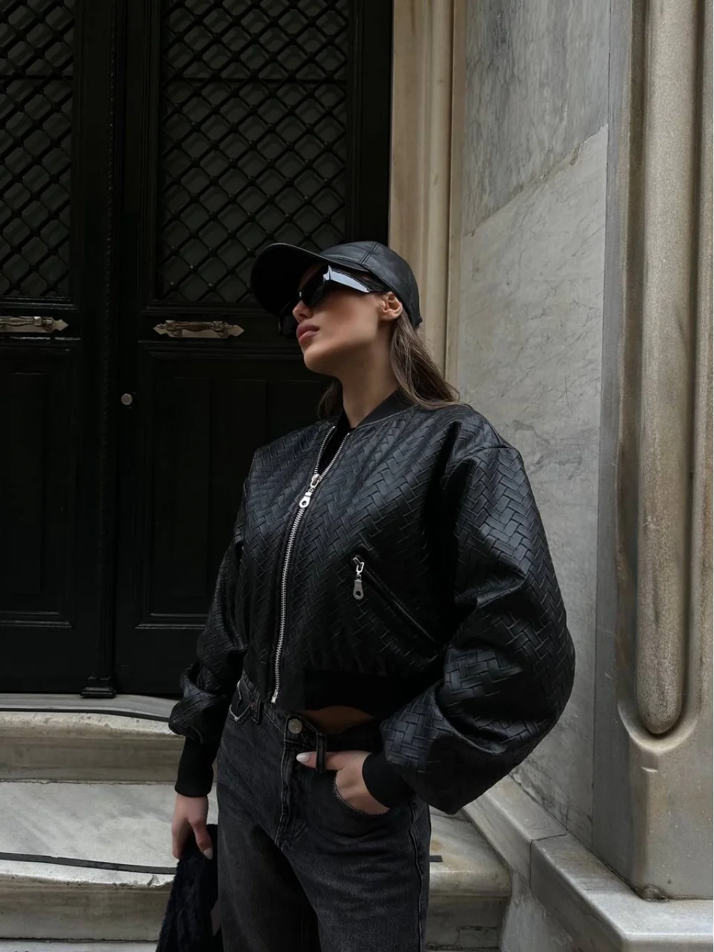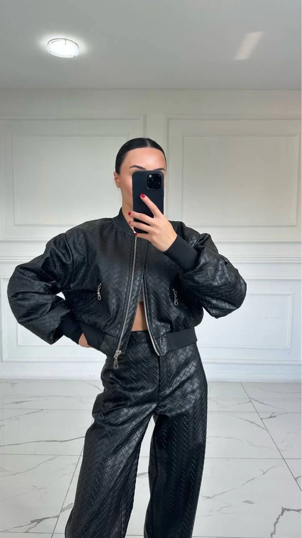 SİYAH ÖRGÜ DESENLİ DERİ CEKET
