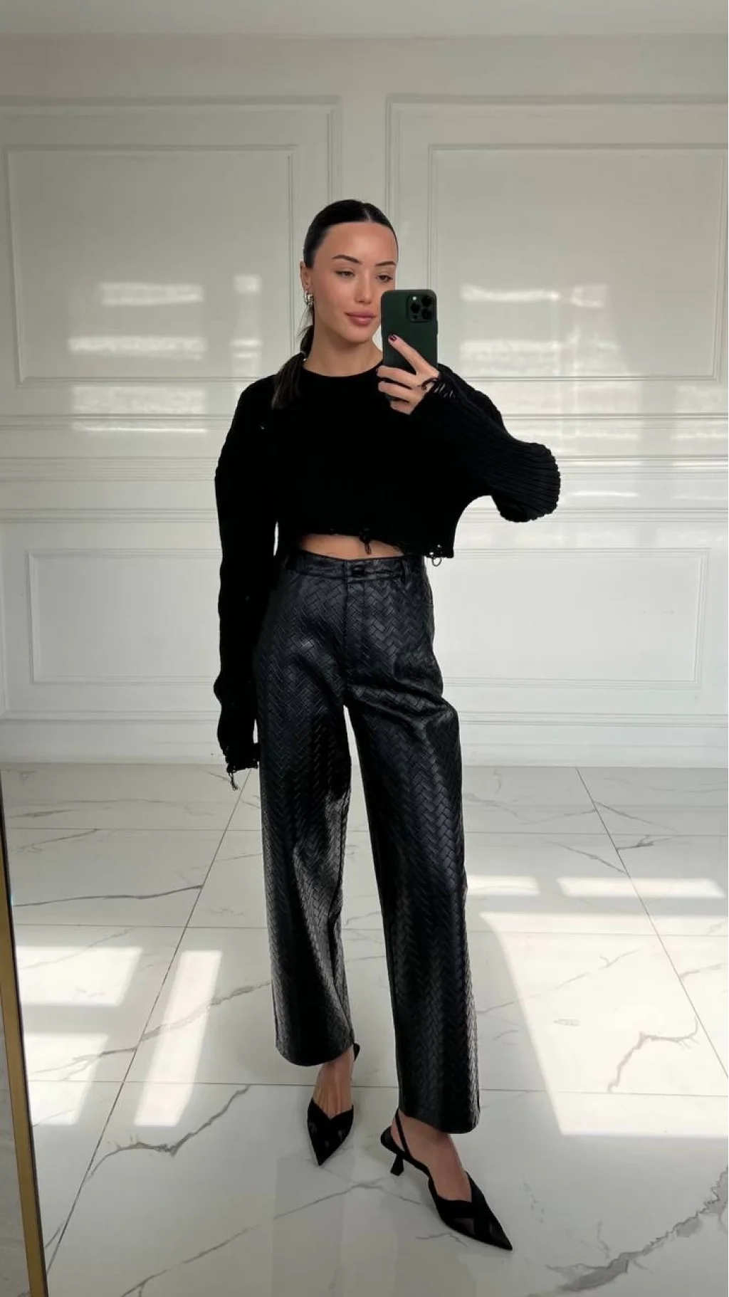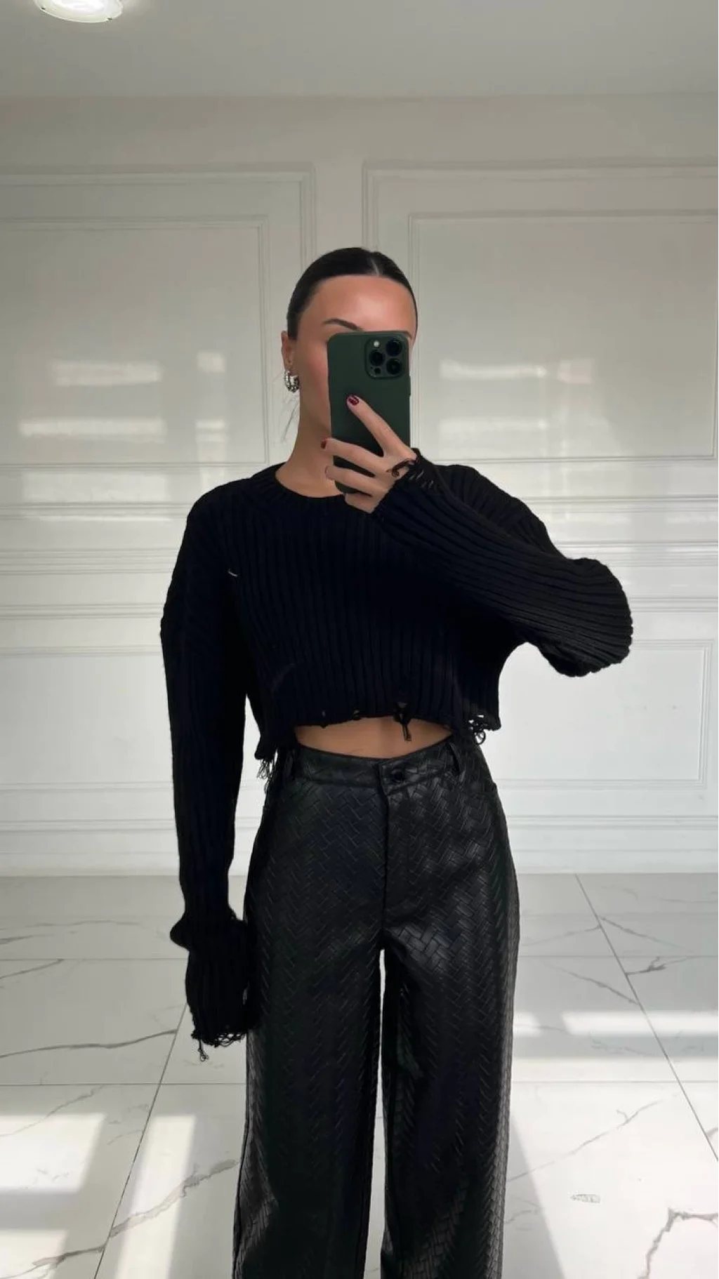 SİYAH RENK YIRTIK DETAYLI KISA KAZAK