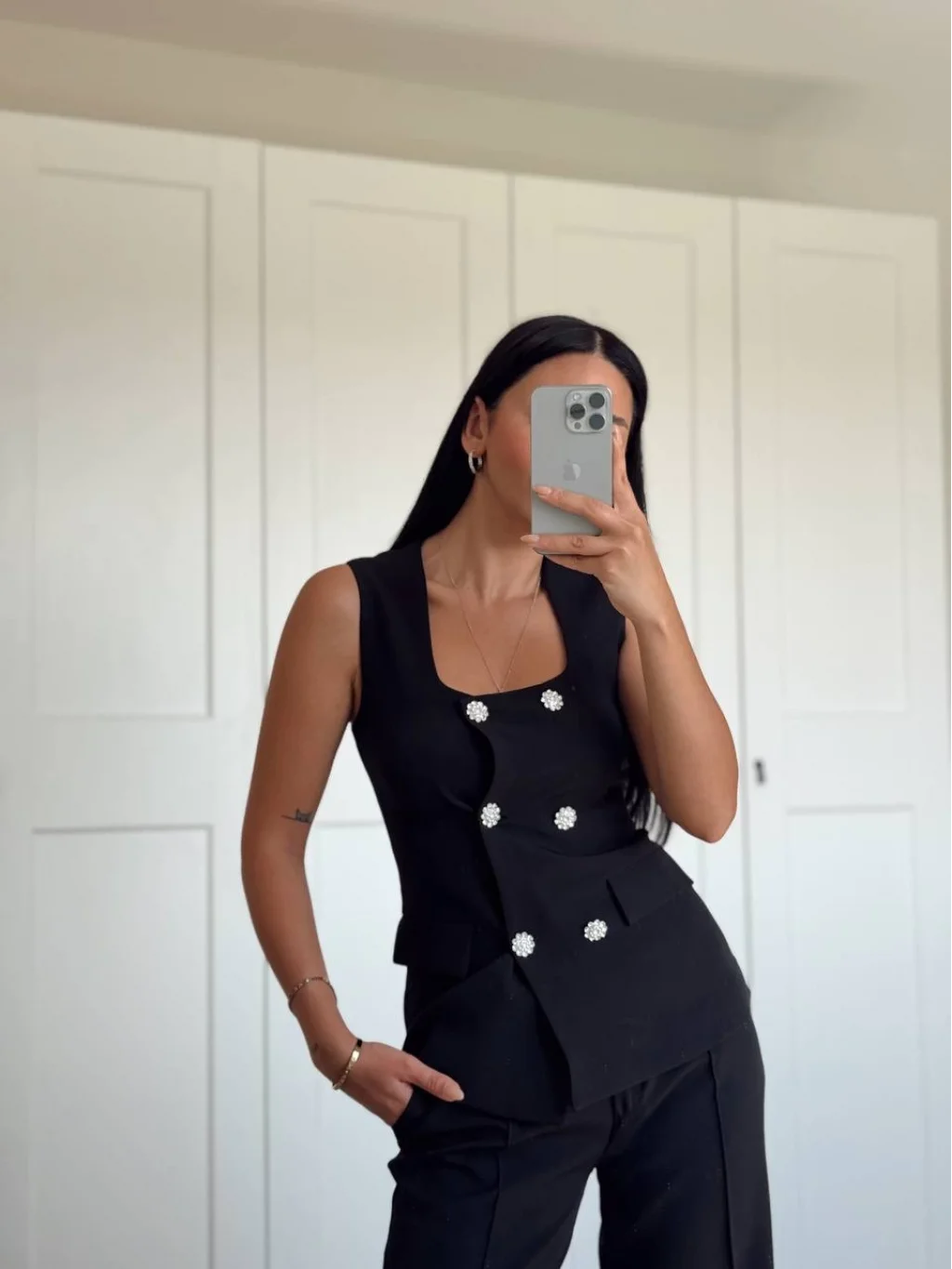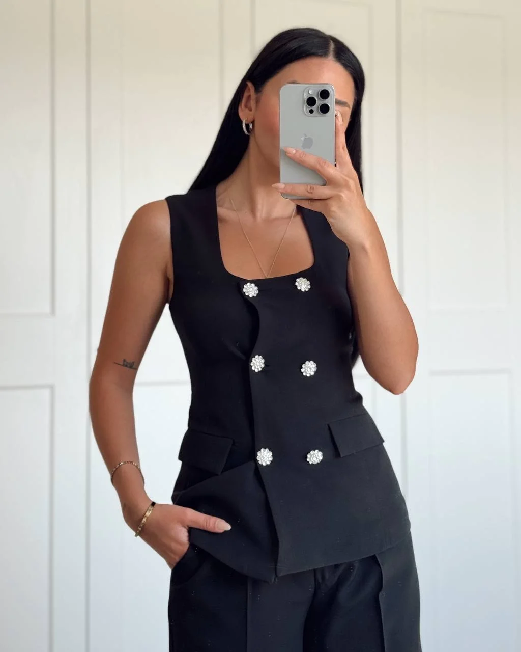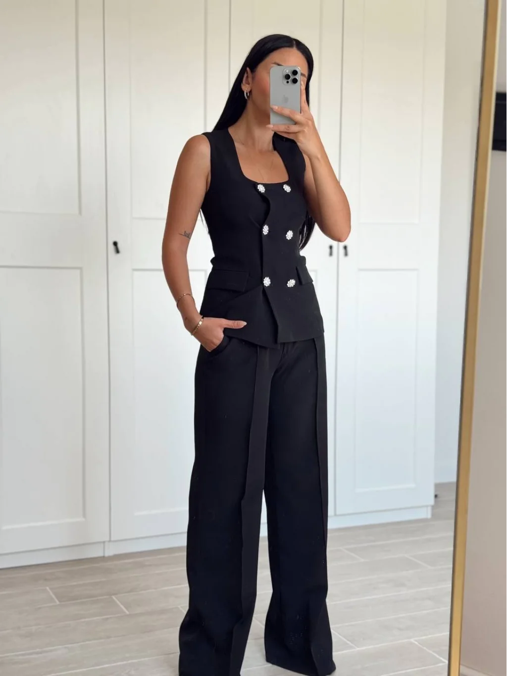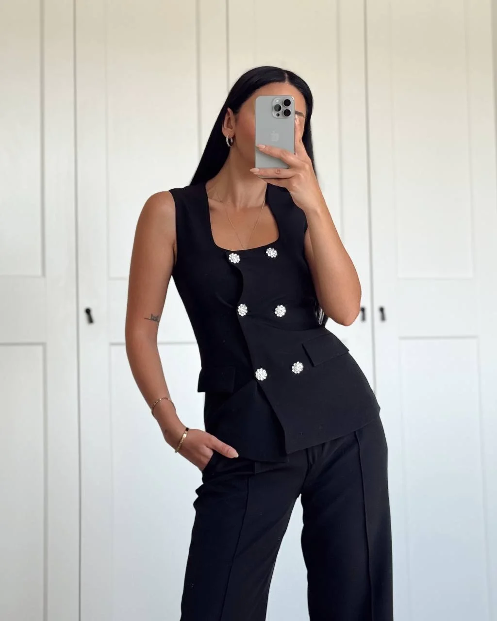 Taş DÜĞME SİYAH YELEK PANTOLON TAKIM