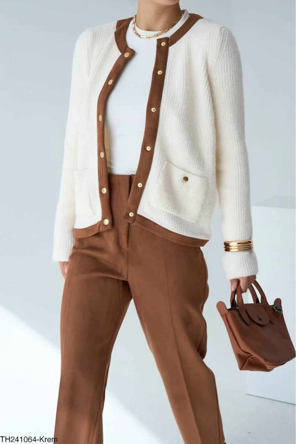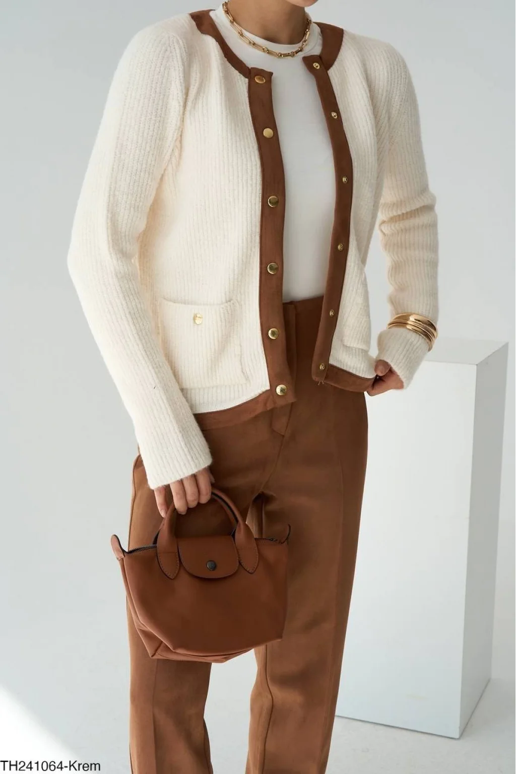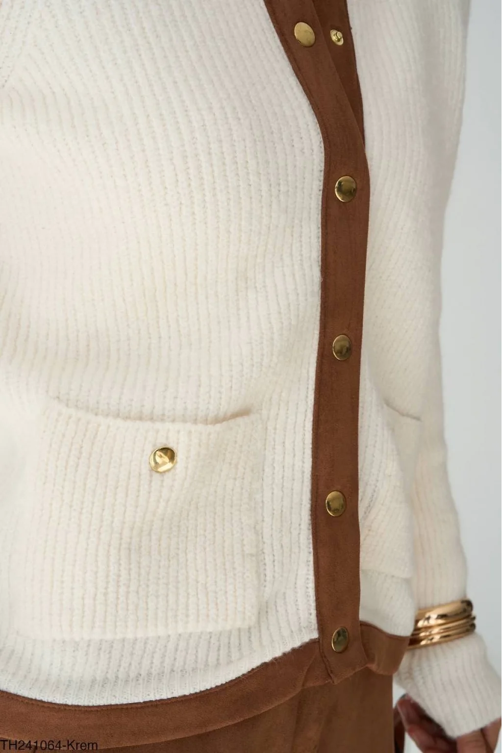 Yaka bel ve kapama bölgesi süet detaylı, ön iki cepli gold düğmeli premium serisi ekru hırka.