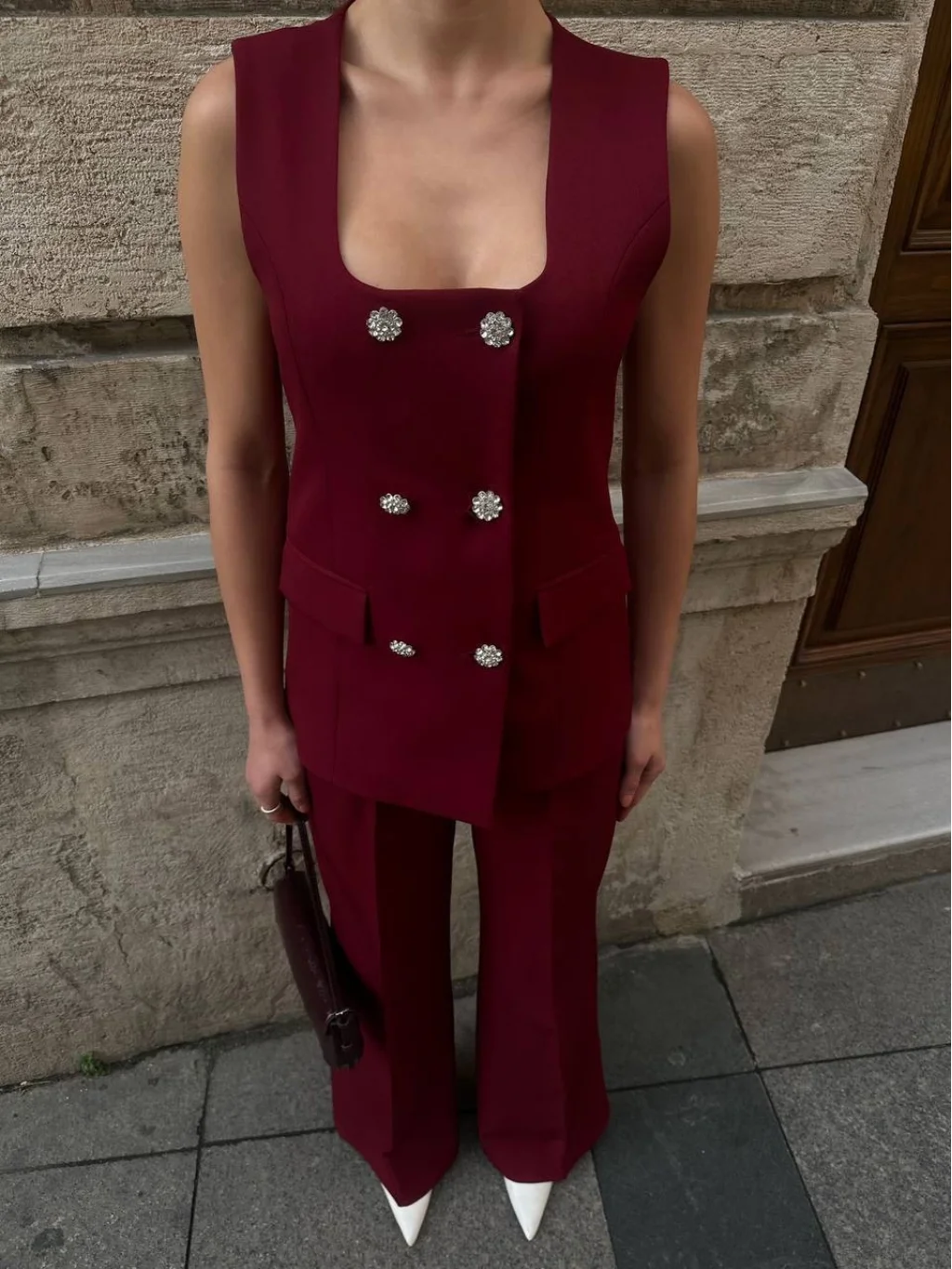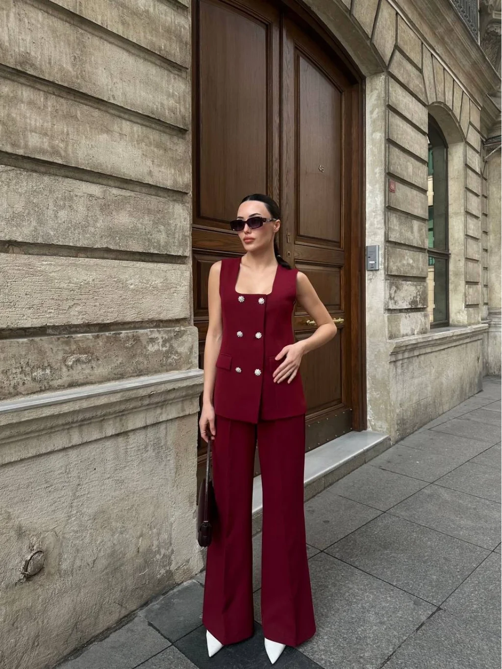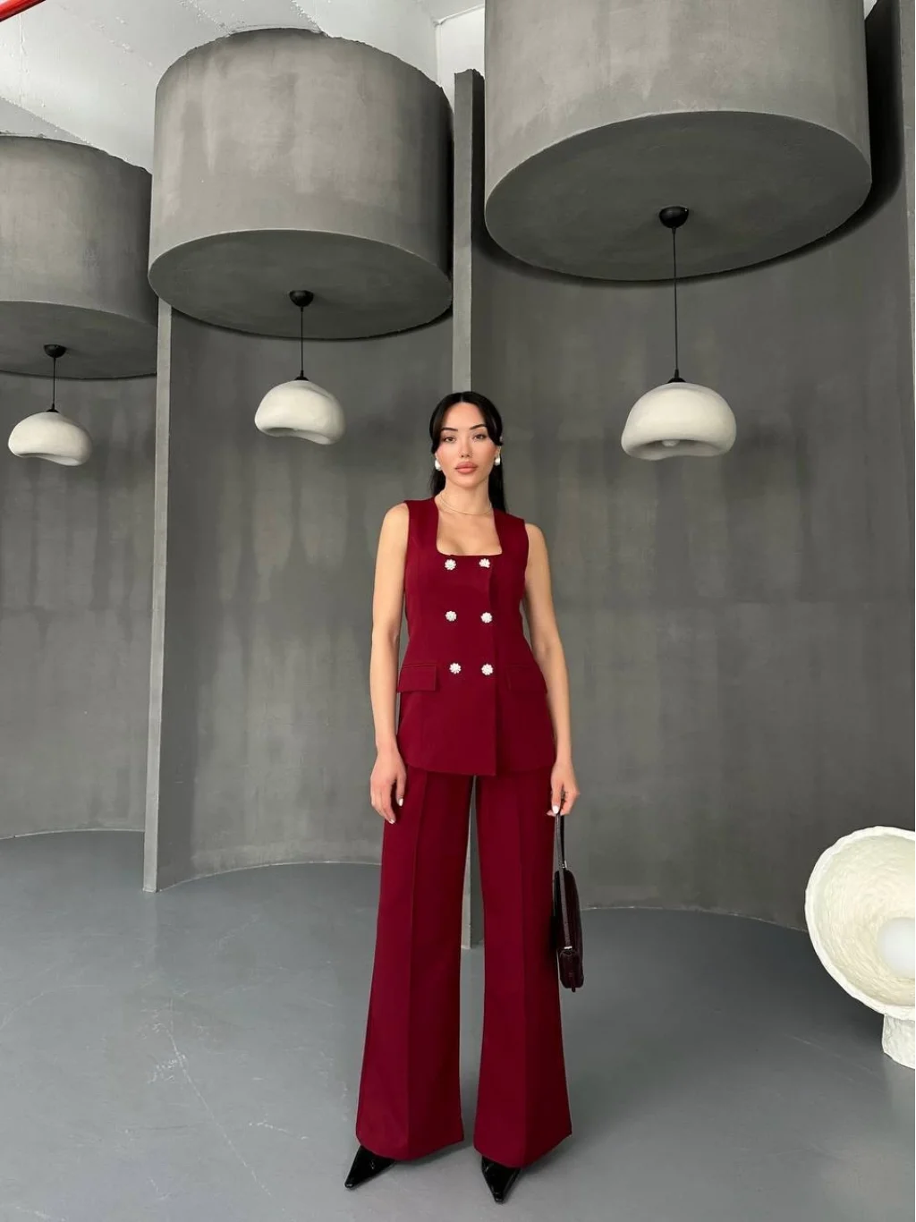 TAŞ DÜĞME BORDO YELEK PANTOLON TAKIM