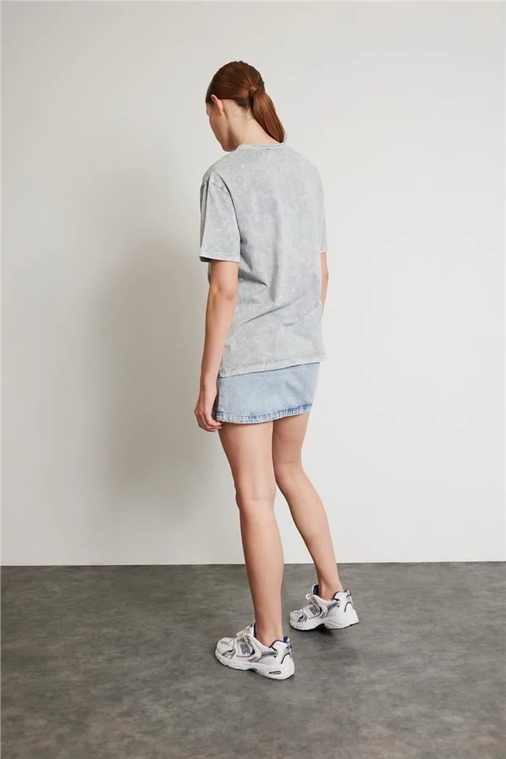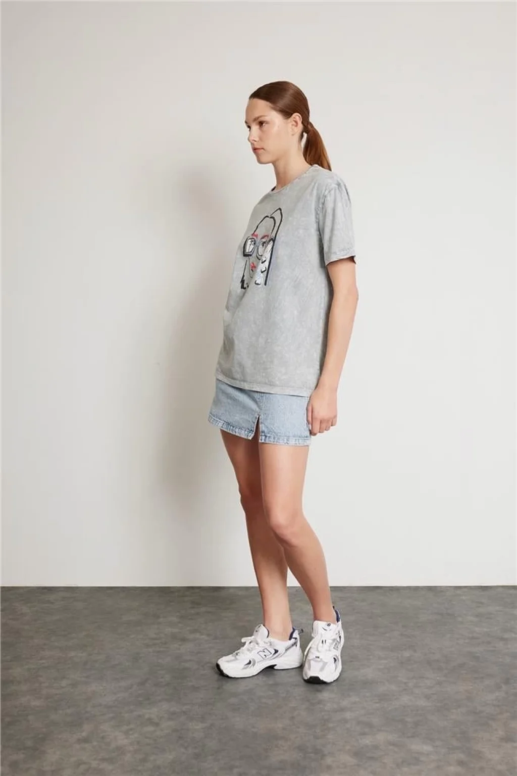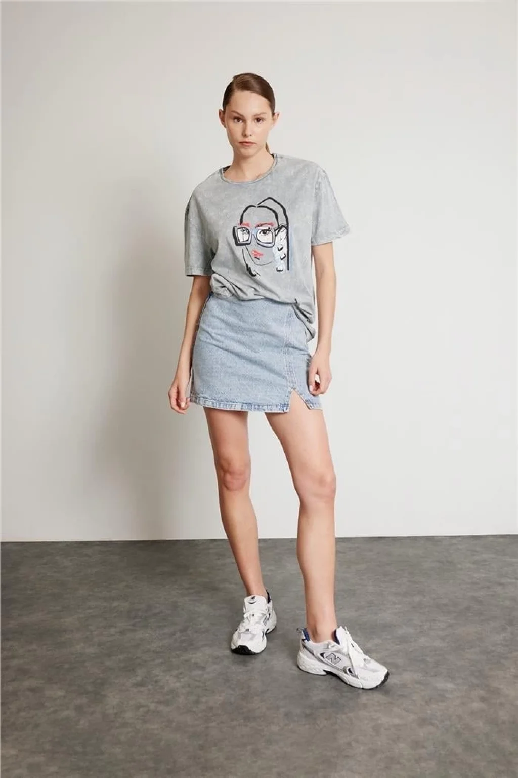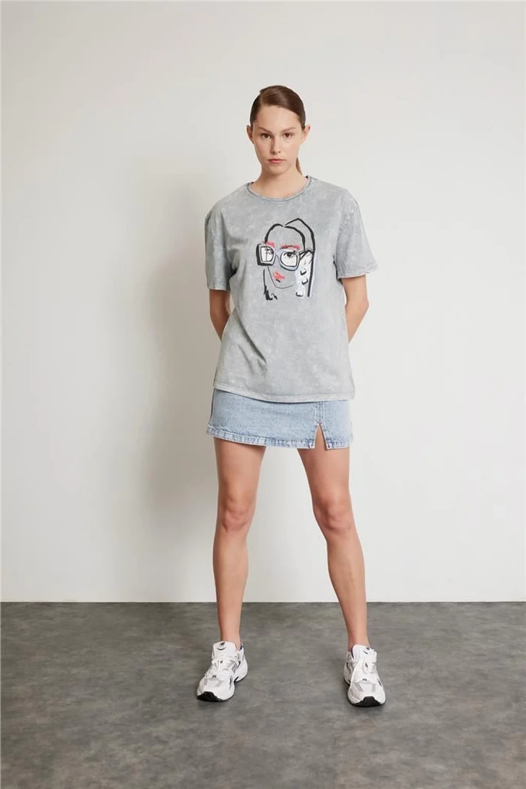 Taş İşlemeli Baskılı Tişört Gri