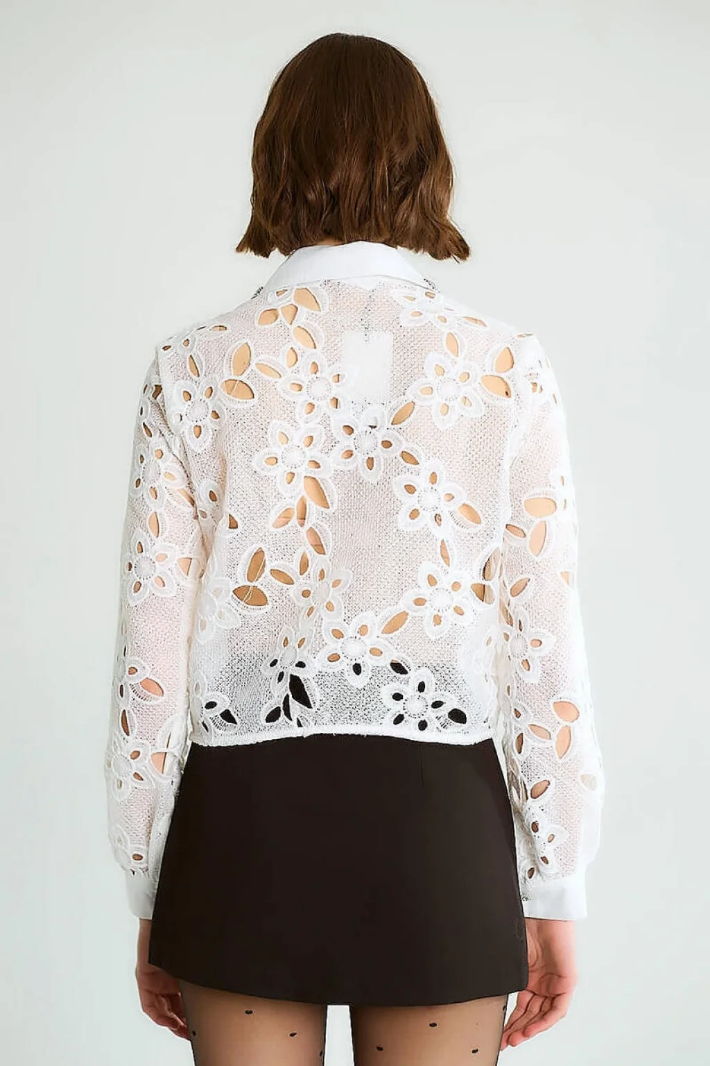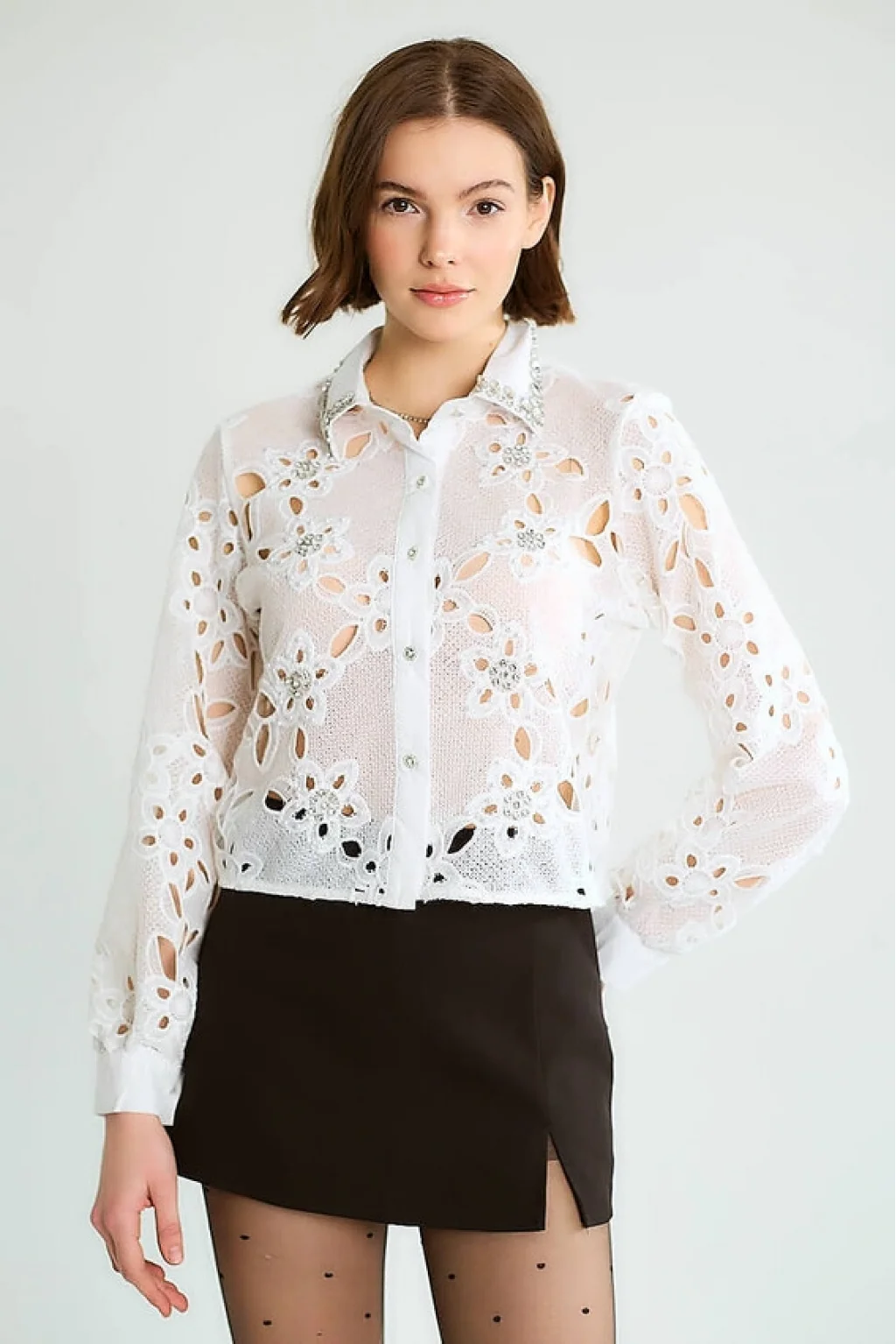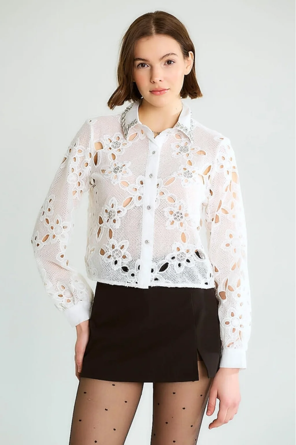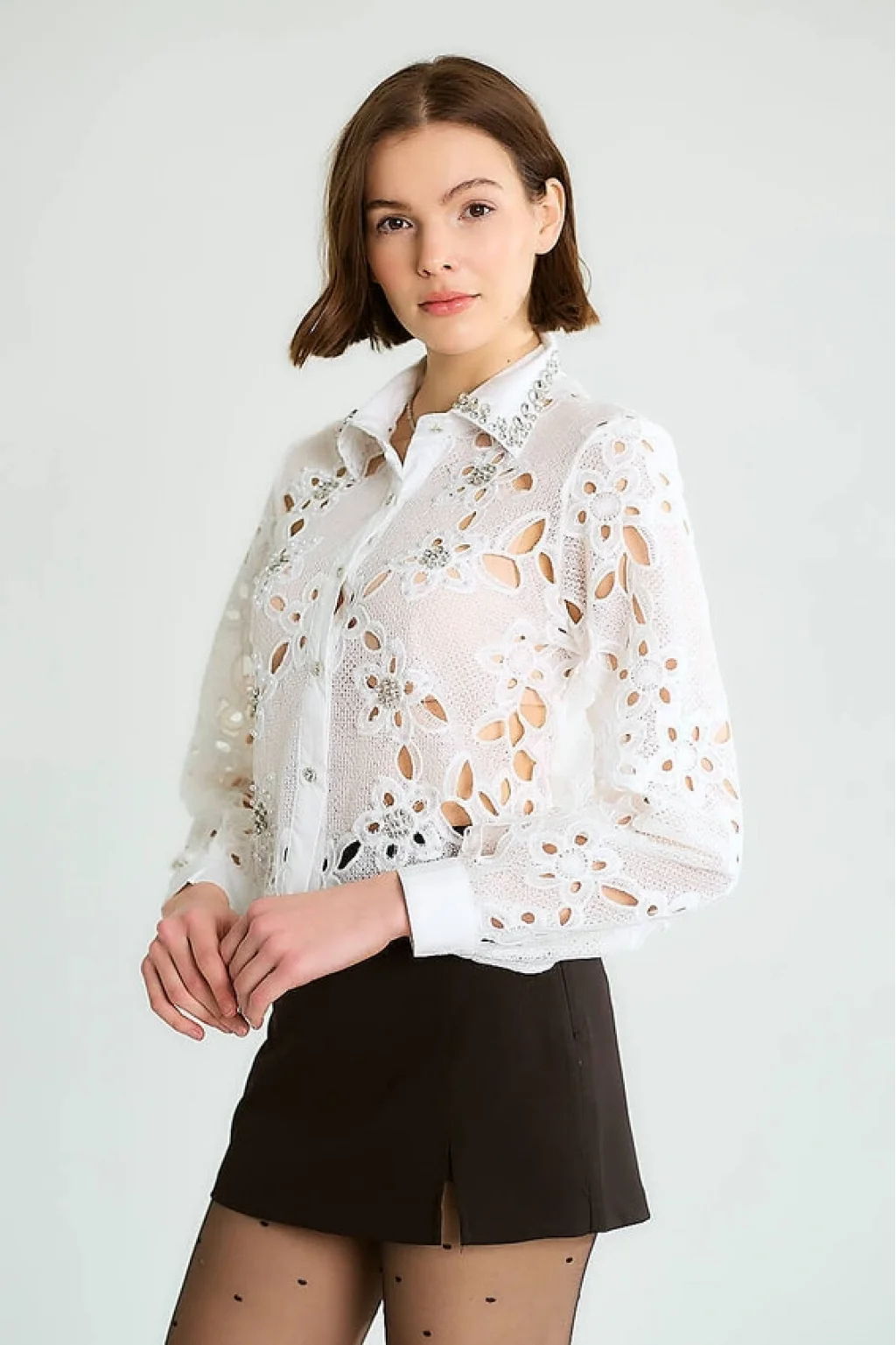Taş İşlemeli Dantel Detay Beyaz Gömlek