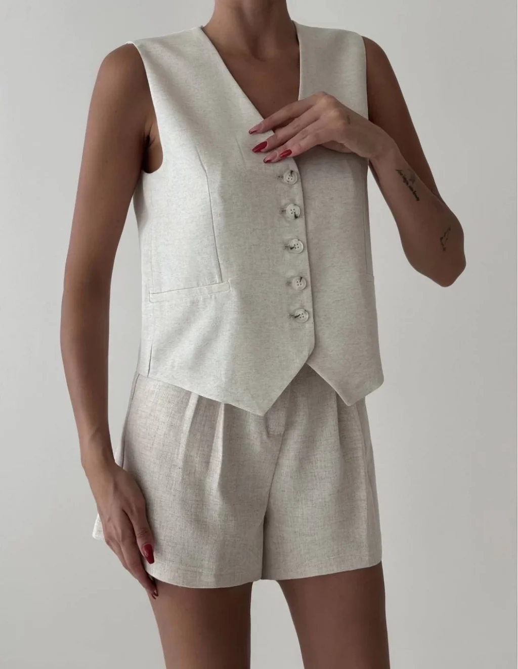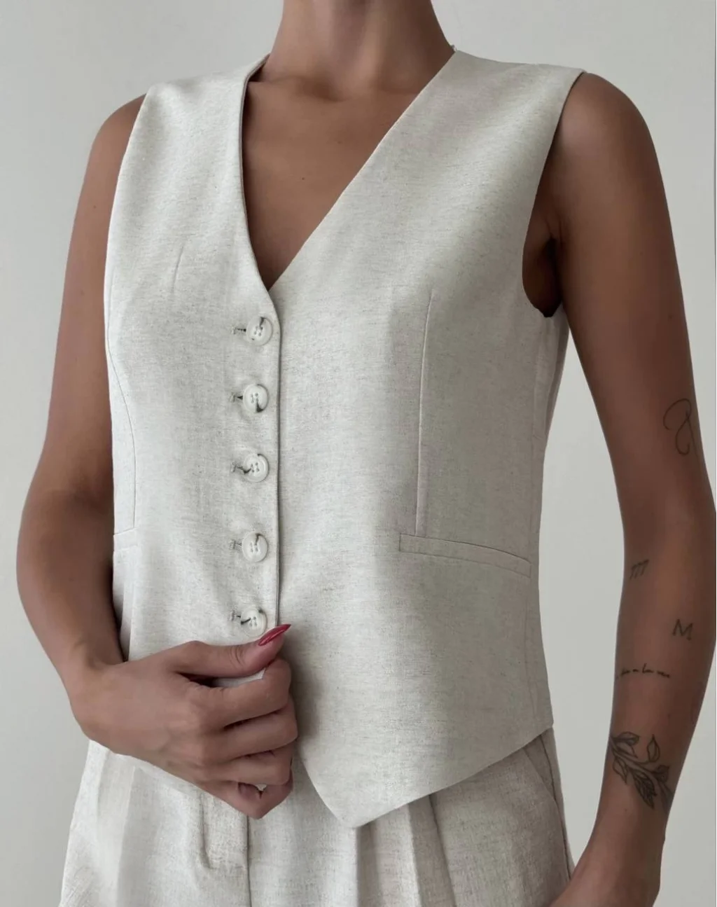 SIFIR KOL, V YAKA, ÖNÜ DÜĞMELİ VE SÜS CEPLİ, İÇİ ASTARLI, KETEN YELEK