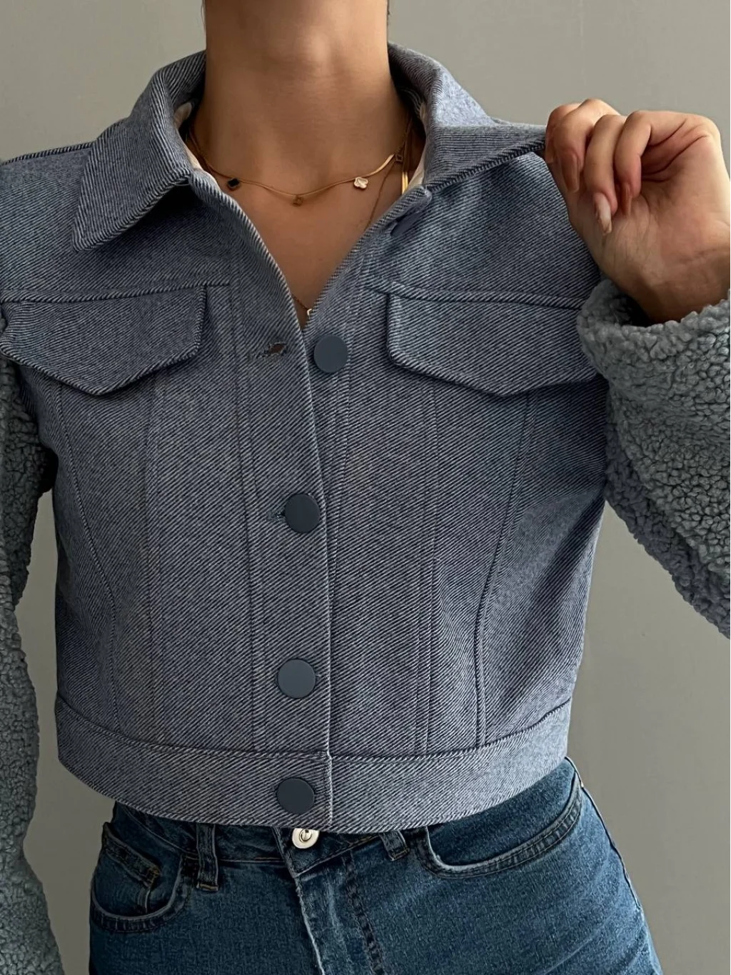 DÜĞME KAPAMALI ASTARLI TEDY KOL KISA MAVİ CEKET