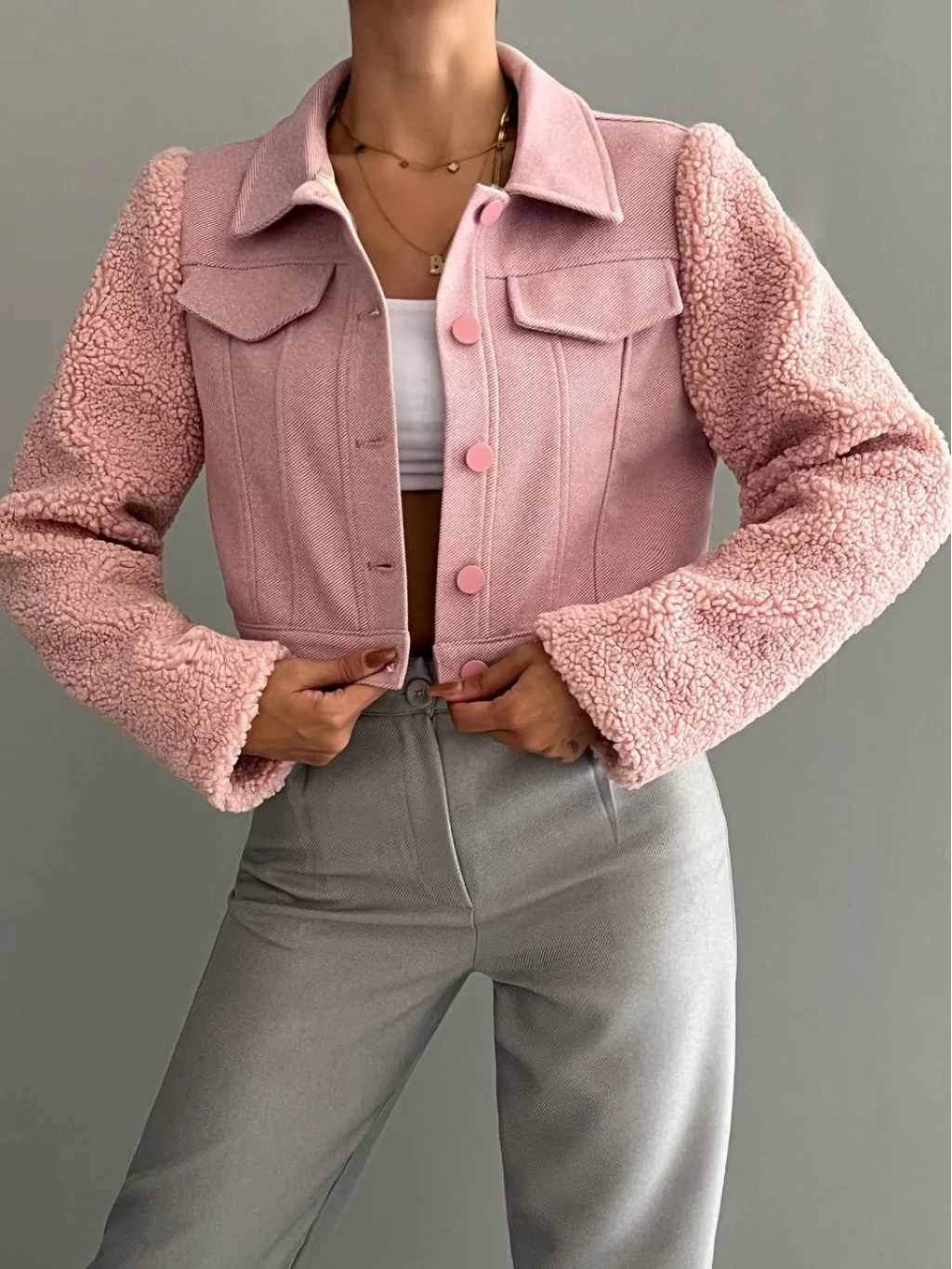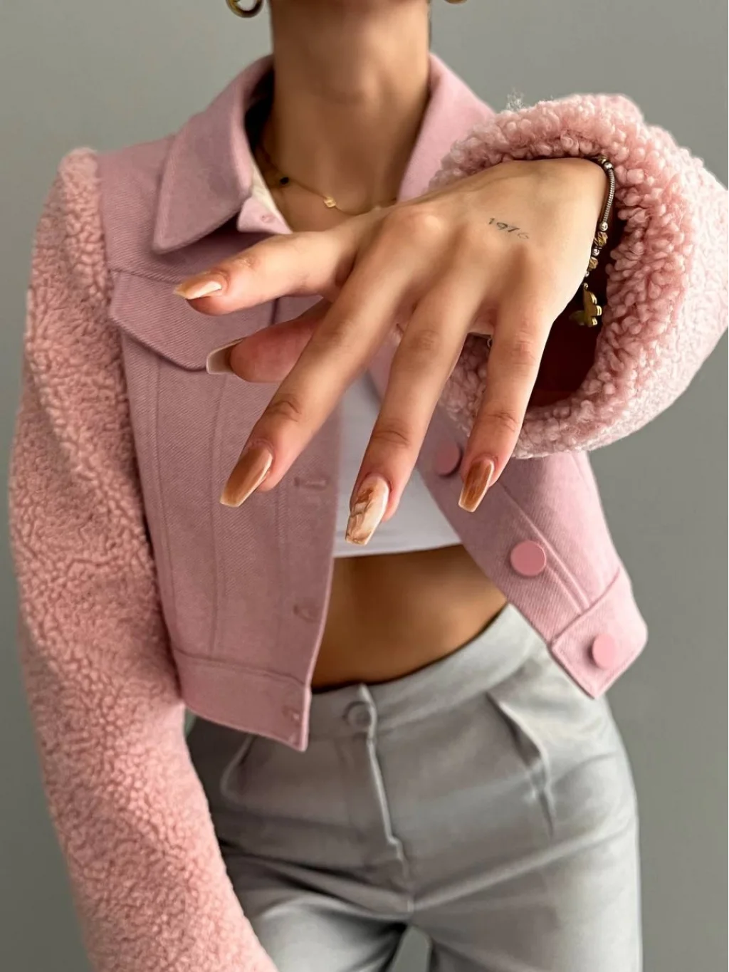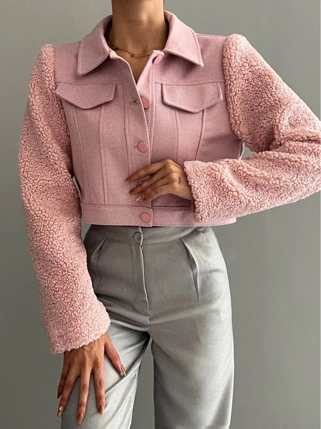 DÜĞME KAPAMALI ASTARLI TEDY KOL KISA PEMBE CEKET