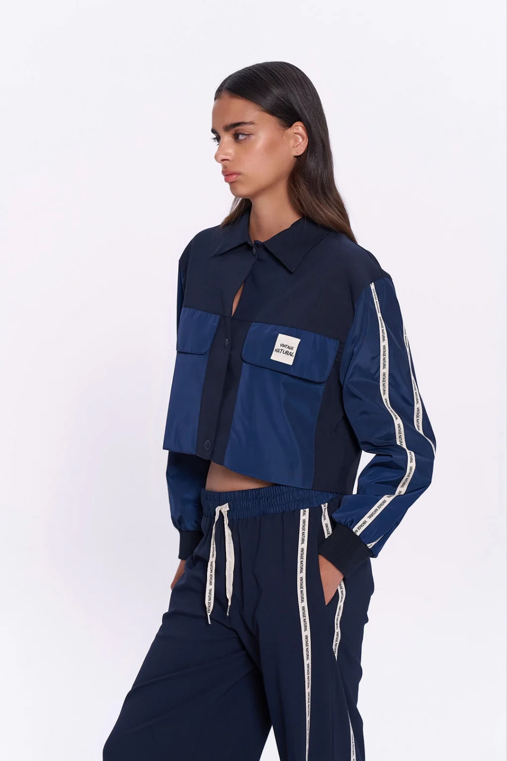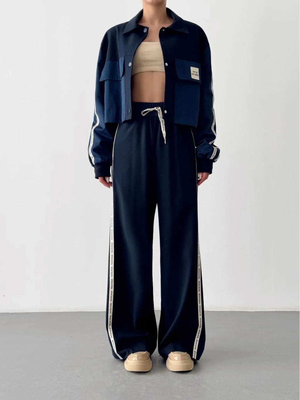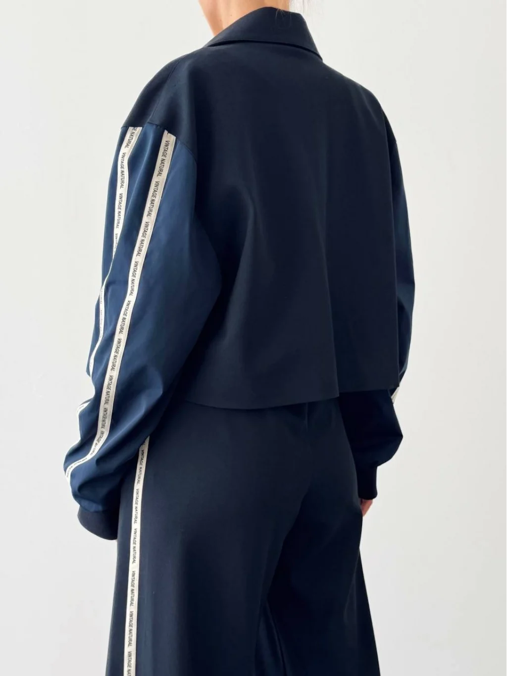 Teknik Kumaş Şerit Detaylı Kısa Ceket Lacivert