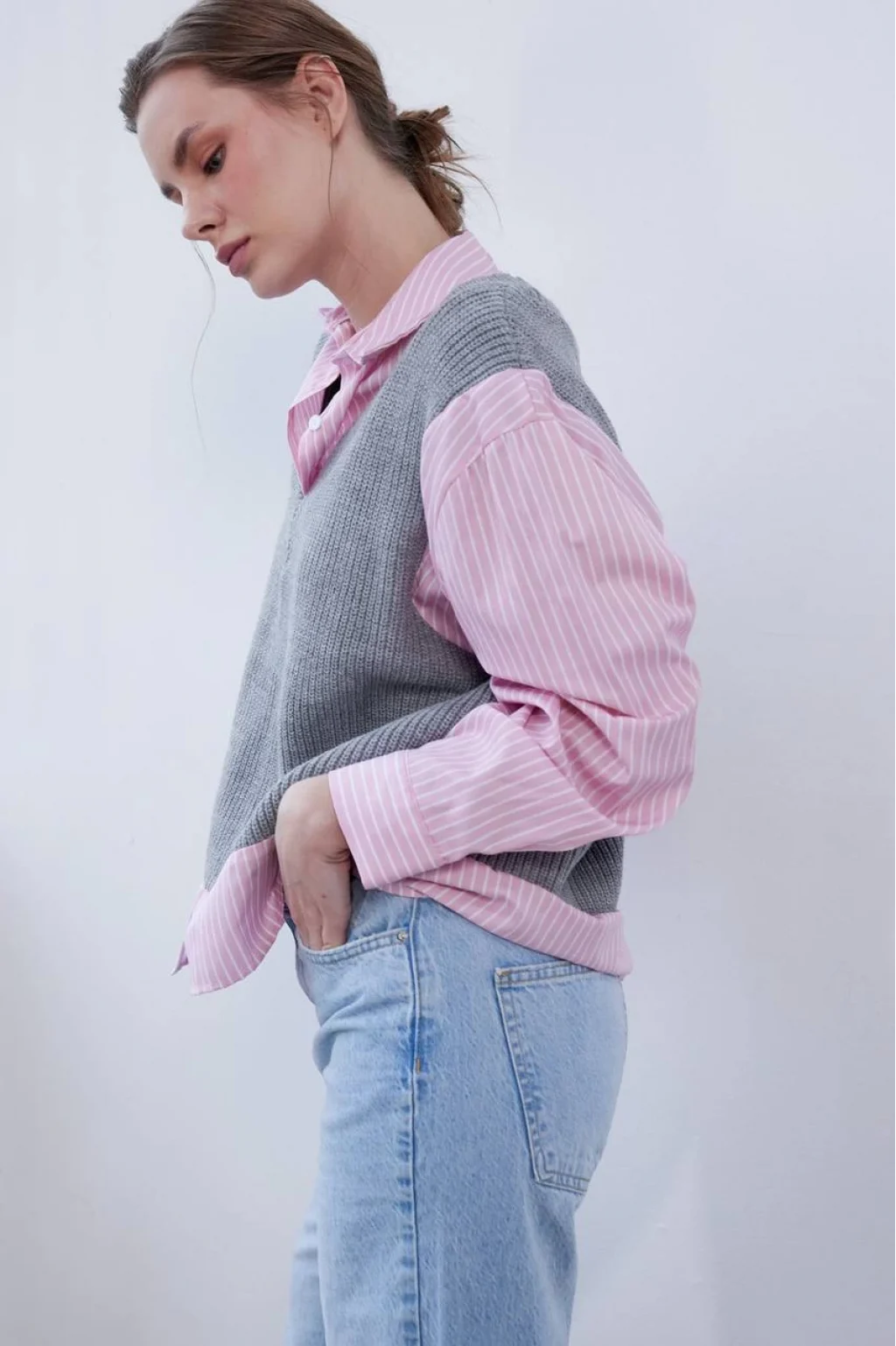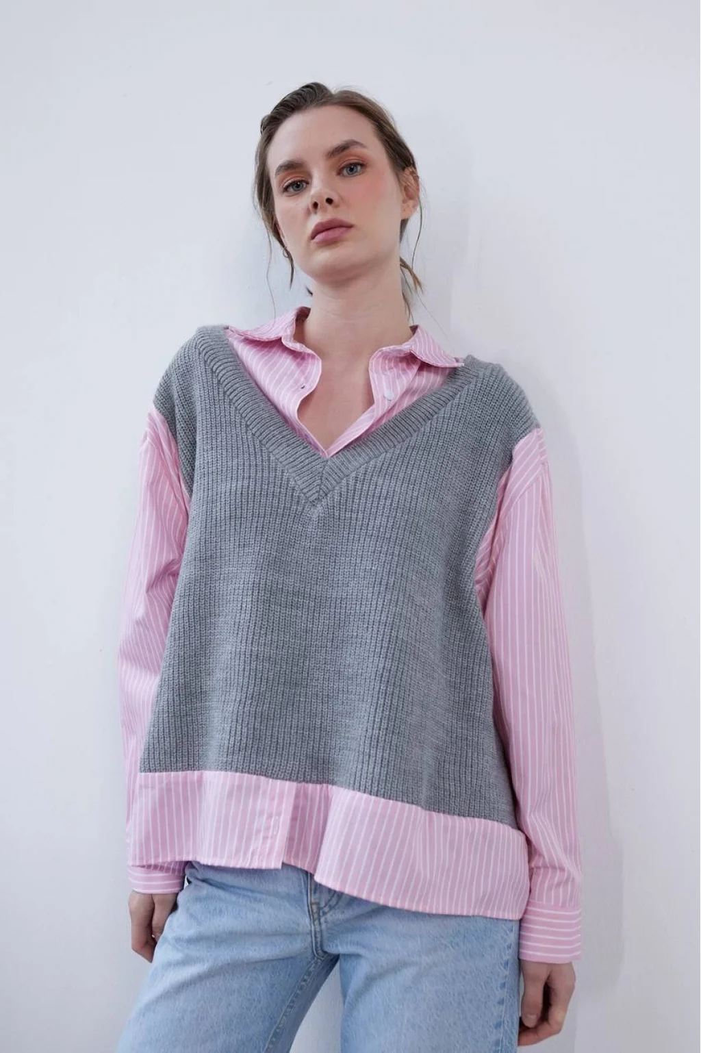TRİKO GARNİLİ PEMBE ÇİZGİLİ GÖMLEK