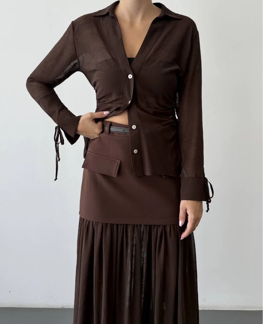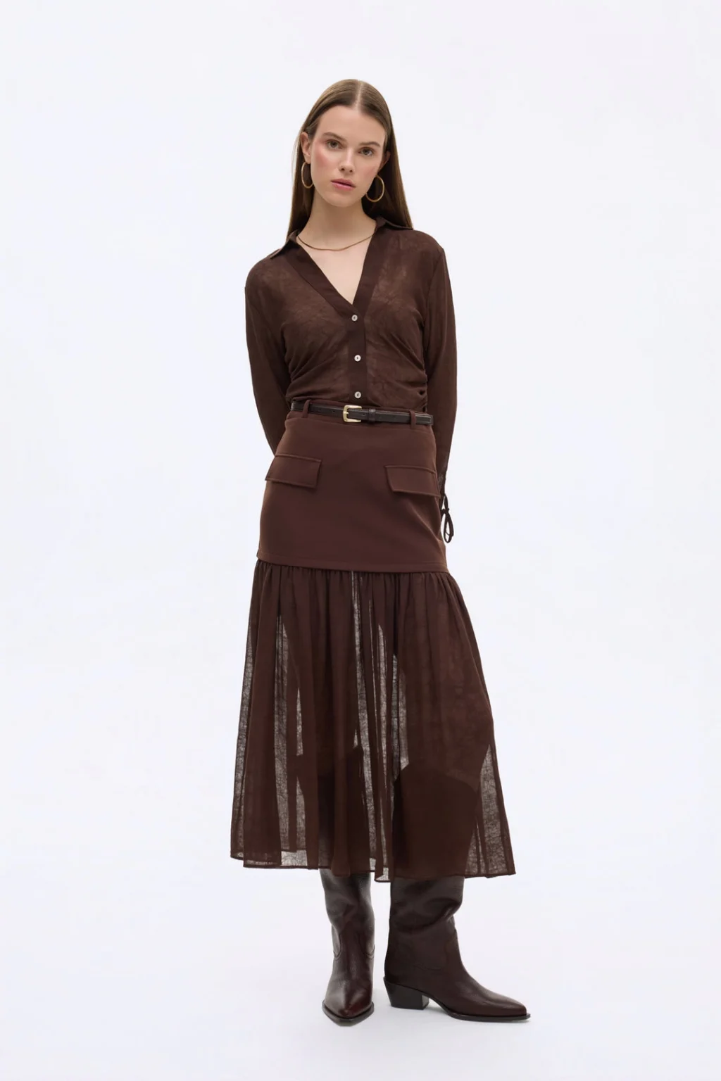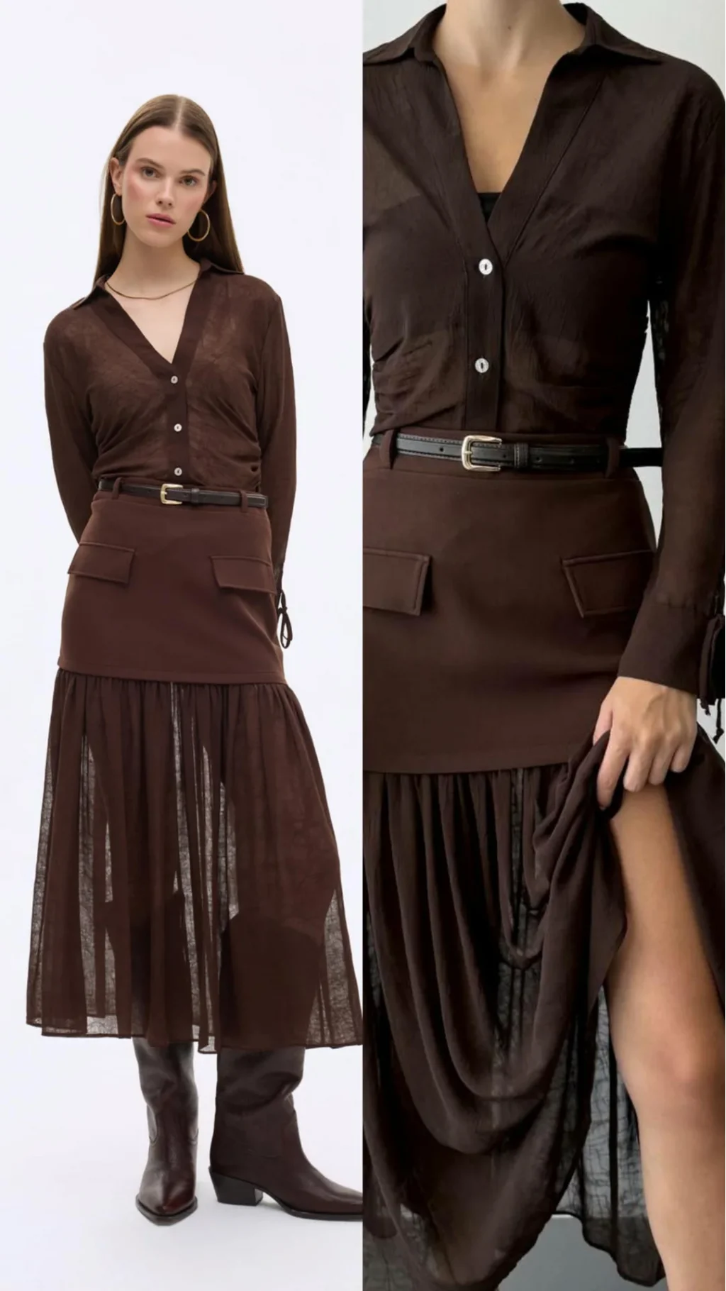 • MYRA Tül Garnili Kemerli Midi Boy Etek-Kahverengi, şık ve feminen bir görünüm sunar.