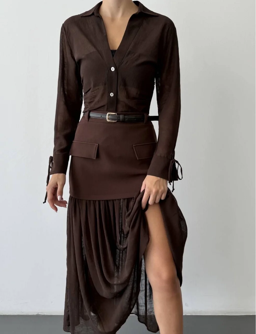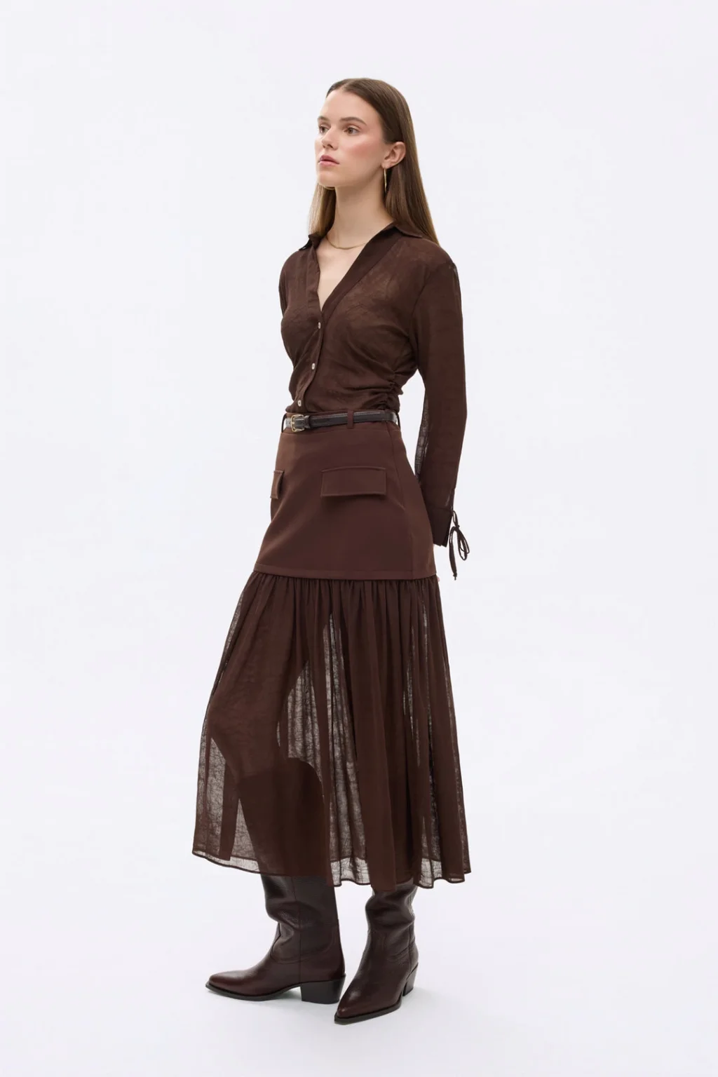 Kemerli, yandan fermuar kapamalı, üst kısmı düz ve cep kapak detaylı, alt kısmı pliseli transparan dokulu tül kumaştan, midi etek.